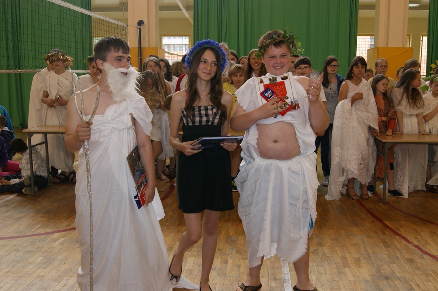 Konkurs nie był jednak tylko zabawą. Uczestnicy musieli dokładnie zapoznać się z pokaźną liczbą lektur, ponieważ najwięcej punktów można było zdobyć za rzetelną wiedzę na temat wierzeń starożytnych Greków. Jako że Grecy próbowali godzić mądrość umysłu i piękno ducha z tężyzna fizyczną, więc i u nas nie zabrakło dodatkowych konkurencji. Jednym z zadań było wykradzenie z Olimpu pioruna będącego własnością Zeusa. Dużo emocji (zwłaszcza „woźnicom”) dostarczył wyścig rydwanów. Komisja oceniła również stroje uczestników konkursu i całych klas.