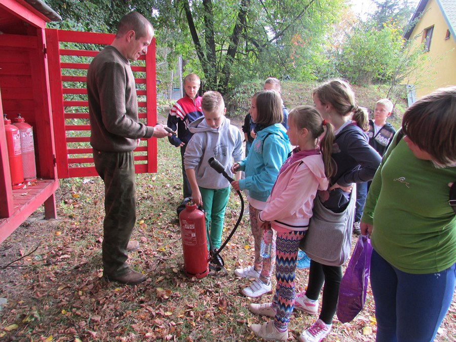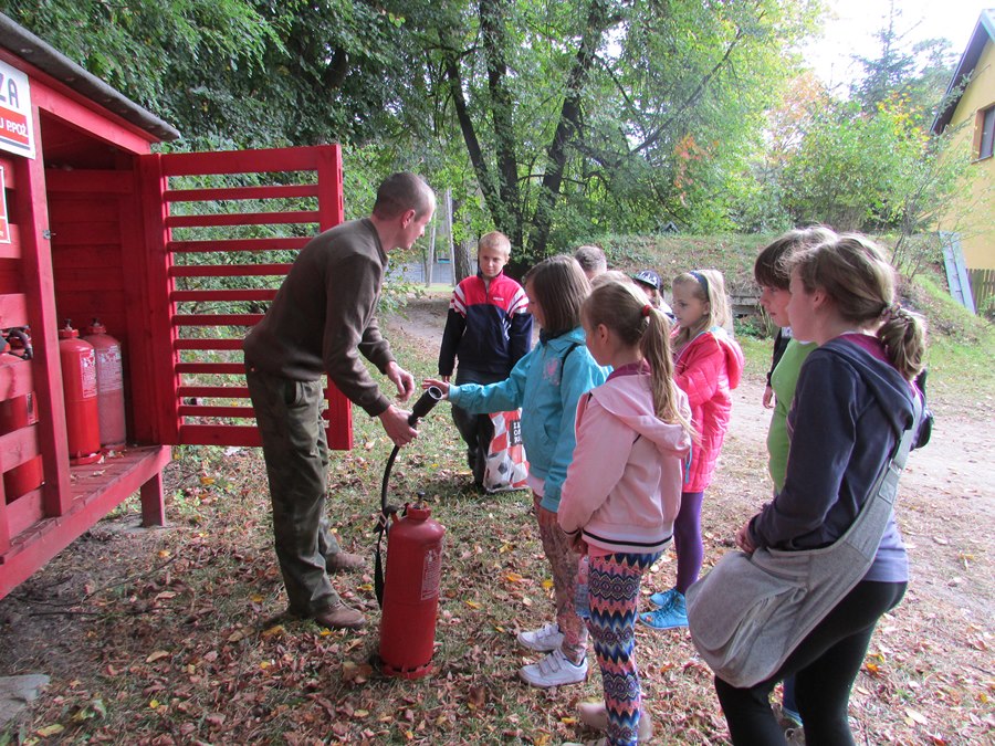 W dniu 01.10.2014 r. uczniowie naszej szkoły w ramach projektu „Moja przyszłość” uczestniczyli w spotkaniu z podleśniczym Panem Michałem Mrozem. Pan poldeśniczy w ciekawy sposób przedstawił, jakie korzyści daje las. Zwrócił szczególną uwagę na właściwe zachowanie w lesie. Jedną z zasad zachowania -„Alarmuj gdy zauważysz ogień”- omówił szczegółowo. Uczniowie poznali podstawowy sprzęt przeciwpożarowy, w który jest wyposażona każda leśniczówka (bosaki, szpadle, gaśnice, tłumice). Uczniowie próbowali swoich sił w pozornej walce z pożarem.