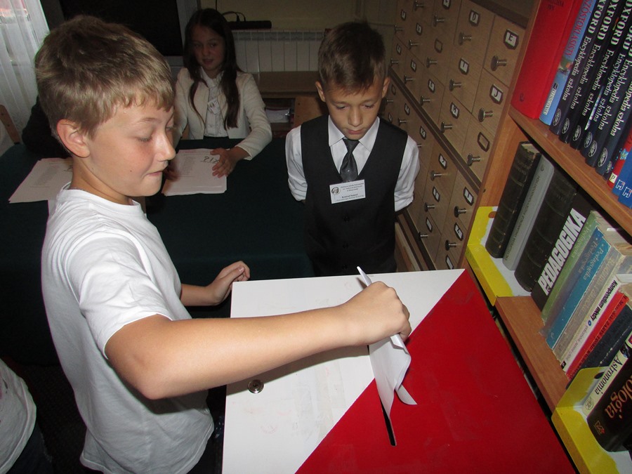 Magdalena Szymanik z kl. VI, Filip Ciach z kl. VI, Michał Bloch z kl. IVa, Julia Plakwicz z kl. VI, Dominik Turowski z kl. V, Małgorzata Jodynis z kl. V, Miłosz Sadowski z kl. VI, Jagna Andrusiuk z kl. V, Milena Kęcka z kl. IVa, Natalia Książek z kl. VI,