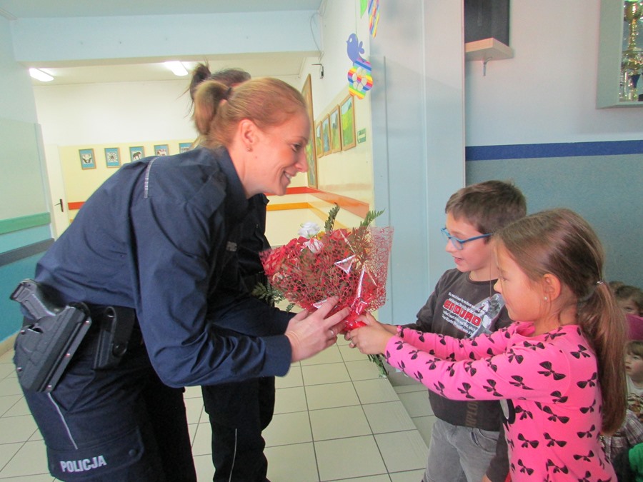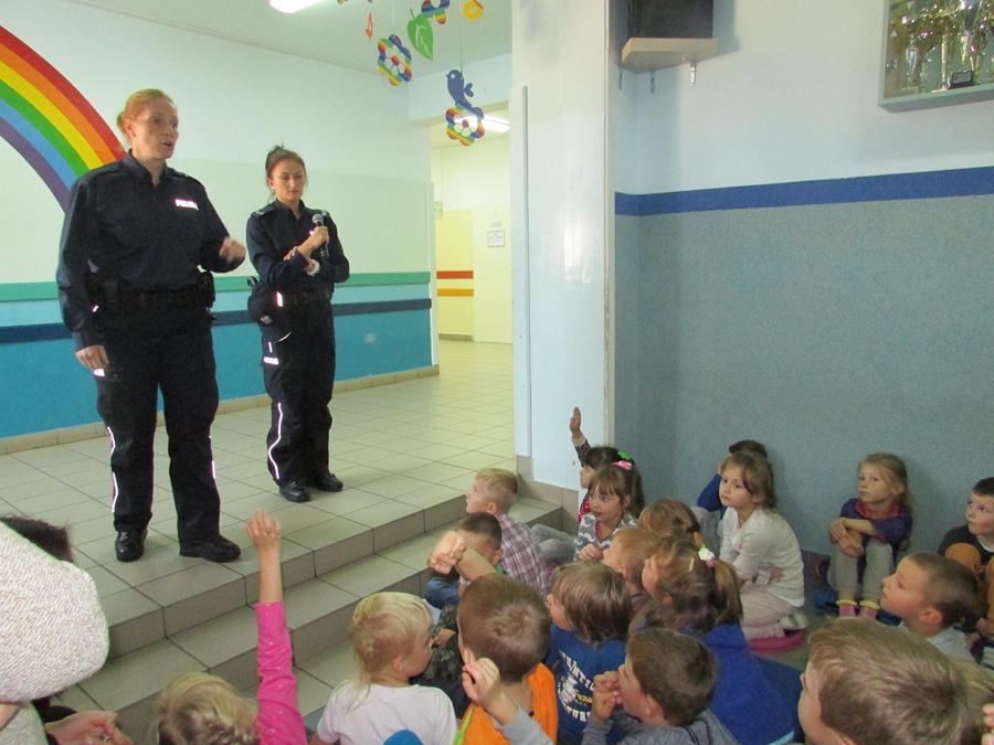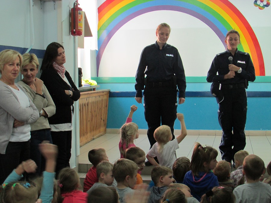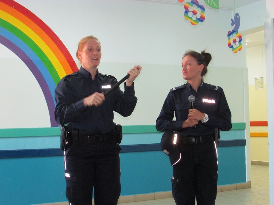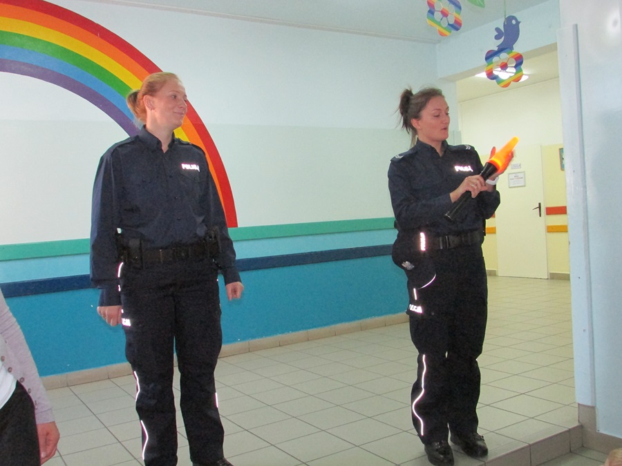 Policjantki omówiły zasady poruszania się po ulicy i chodniku. Zwróciły uwagę na niebezpieczeństwa, jakie mogą czyhać na dzieci w kontaktach z obcymi, a także z bezdomnymi psami. Ponadto podkreśliły, jak ważną rolę pełnią elementy odblaskowe, które każdy uczeń powinien posiadać.