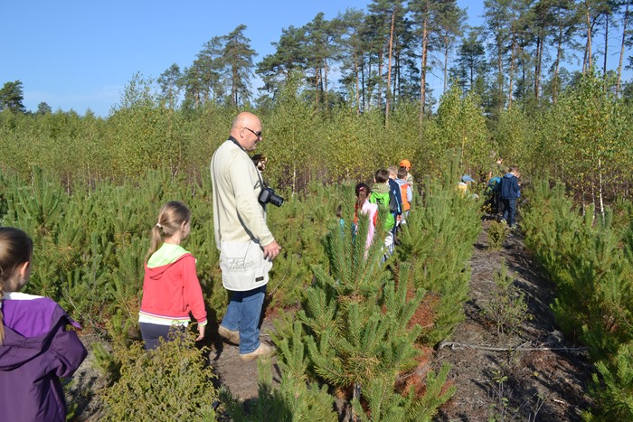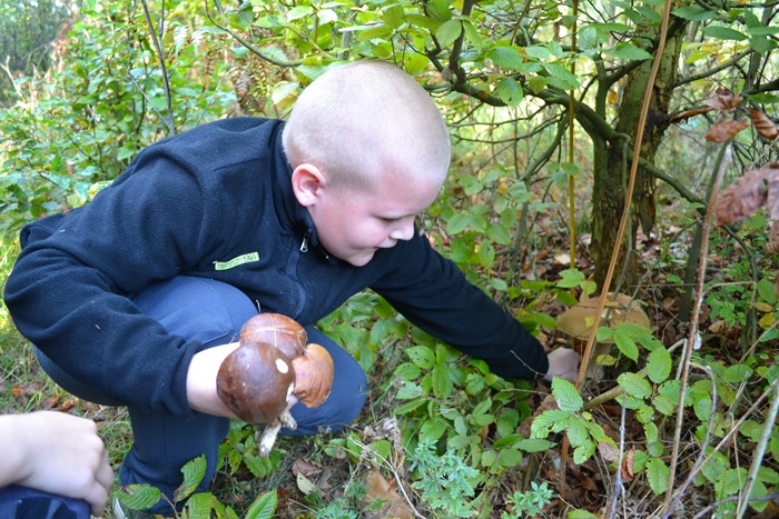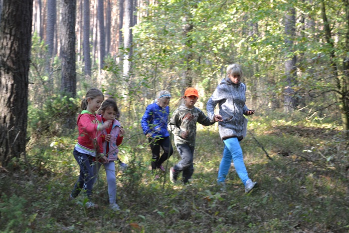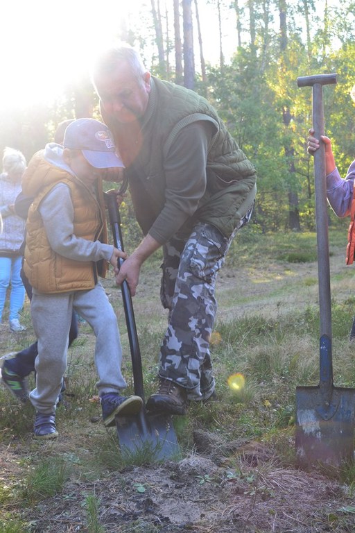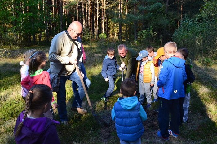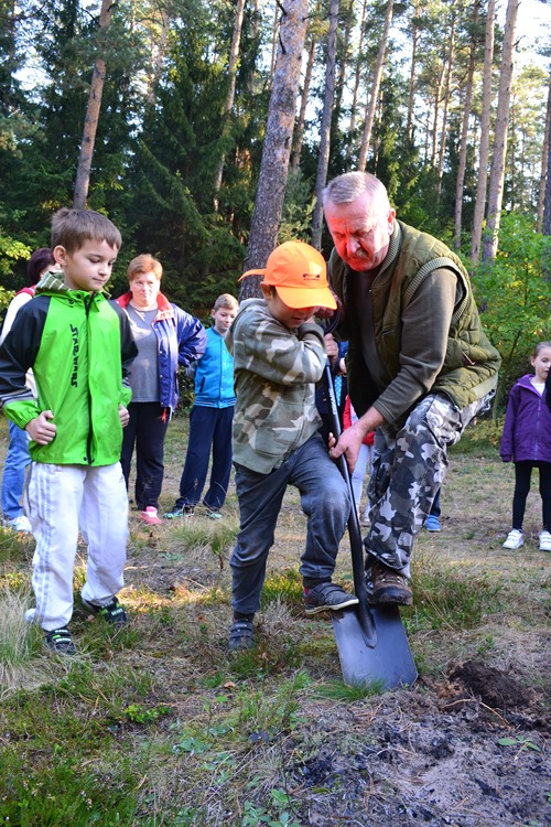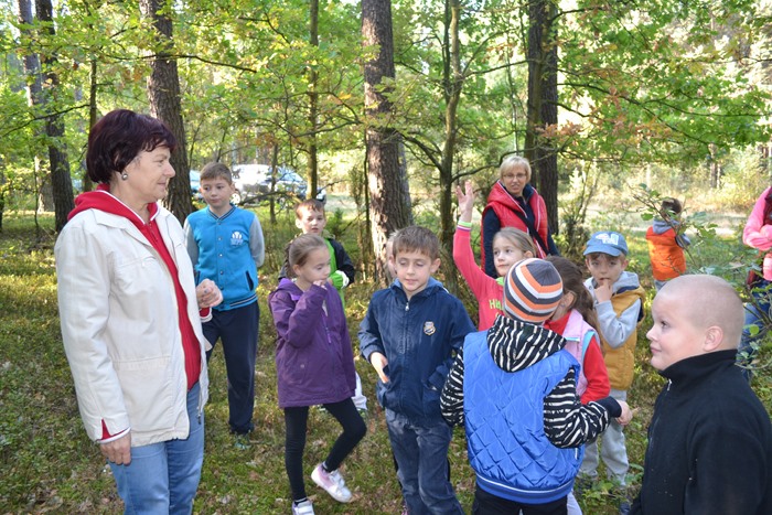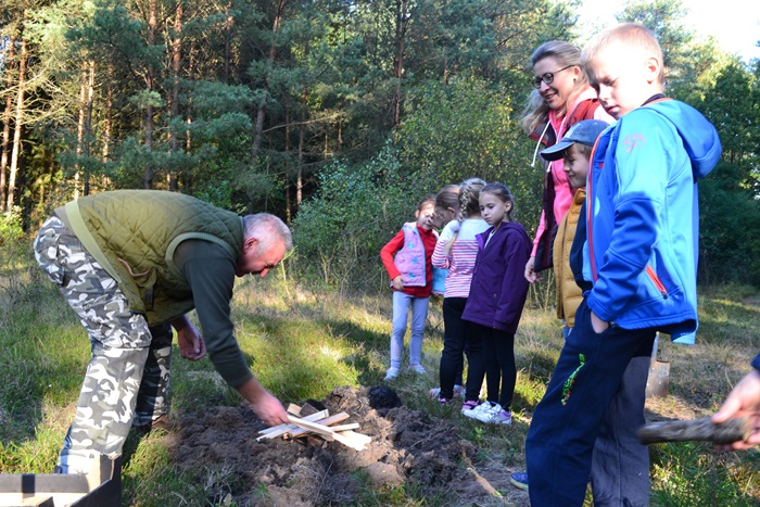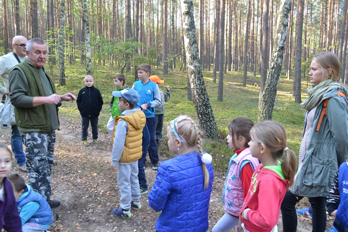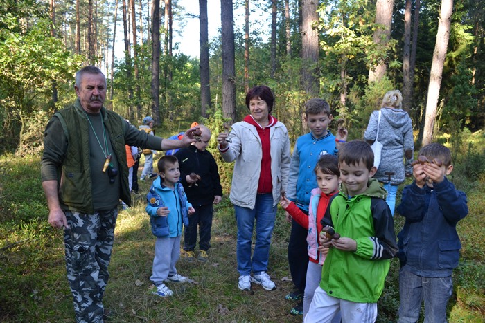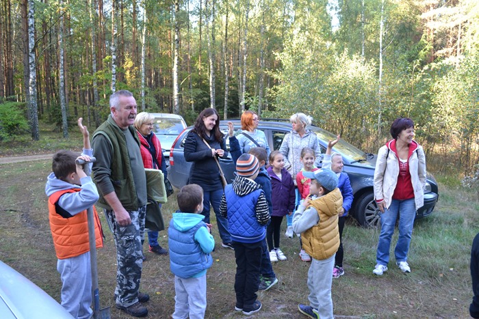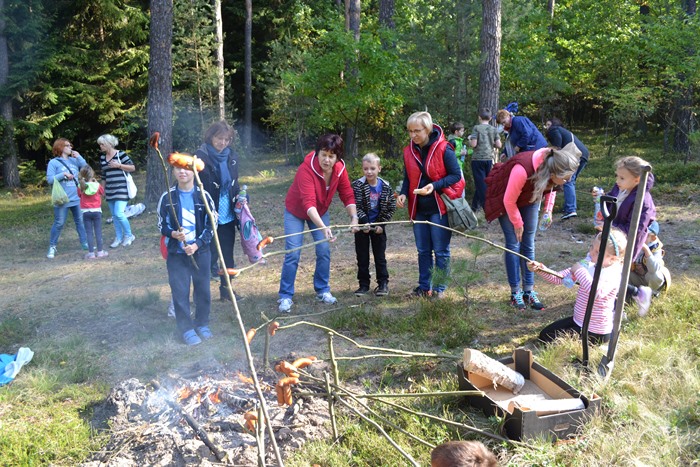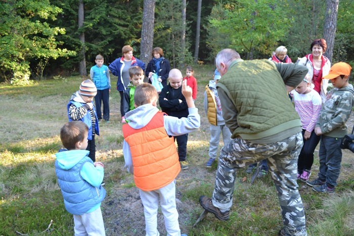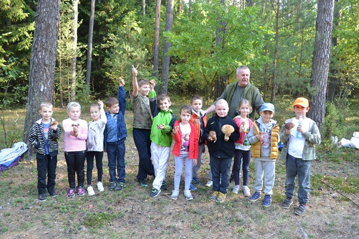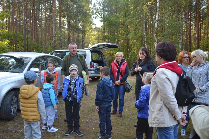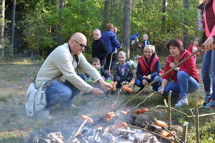 Promując zdrowy i aktywny styl życia, w niedzielne przedpołudnie spotkaliśmy się w lesie, gdzie poznawaliśmy tajemnice lasu i pracę myśliwych z Koła Łowieckiego „Bór”. Dowiedzieliśmy się, że stado saren to rudel oraz usłyszeliśmy głos sarny wzywającej swoje dziecko, czyli koziołka. Prezes koła, p. Marian Sikorski, zaprowadził nas do leśnego przedszkola, czyli młodego lasku, gdzie pokazał nam jamę lisa. Wcale nie szukaliśmy grzybów, ale one po prostu rosły na naszej drodze. Grzybowym królem został Mikołaj Pietras. Zanim upiekliśmy kiełbaski, trzeba było przygotować bezpieczne miejsce na ognisko, w czym wszyscy mieli swój udział.