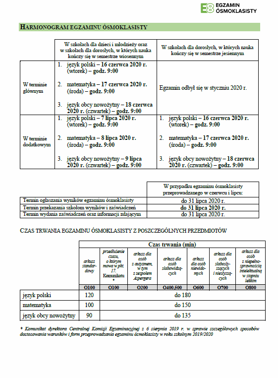 Każdy rodzic i uczeń klasy ósmej proszony jest o zapoznanie się z wytycznymi dotyczącymi przeprowadzania egzaminów, znajdującymi się w plikach do pobrania.