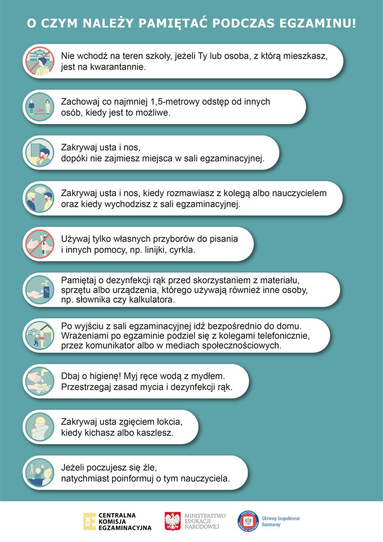 Uczniowie w dniach egzaminu przychodzą do szkoły najpóźniej o godzinie 8.30. Do szkoły wchodzą pojedynczo z zachowaniem zasad zgodnych z wytycznymi GIS i od razu kierują się na salę gimnastyczną, gdzie zajmują wcześniej wylosowane miejsce.