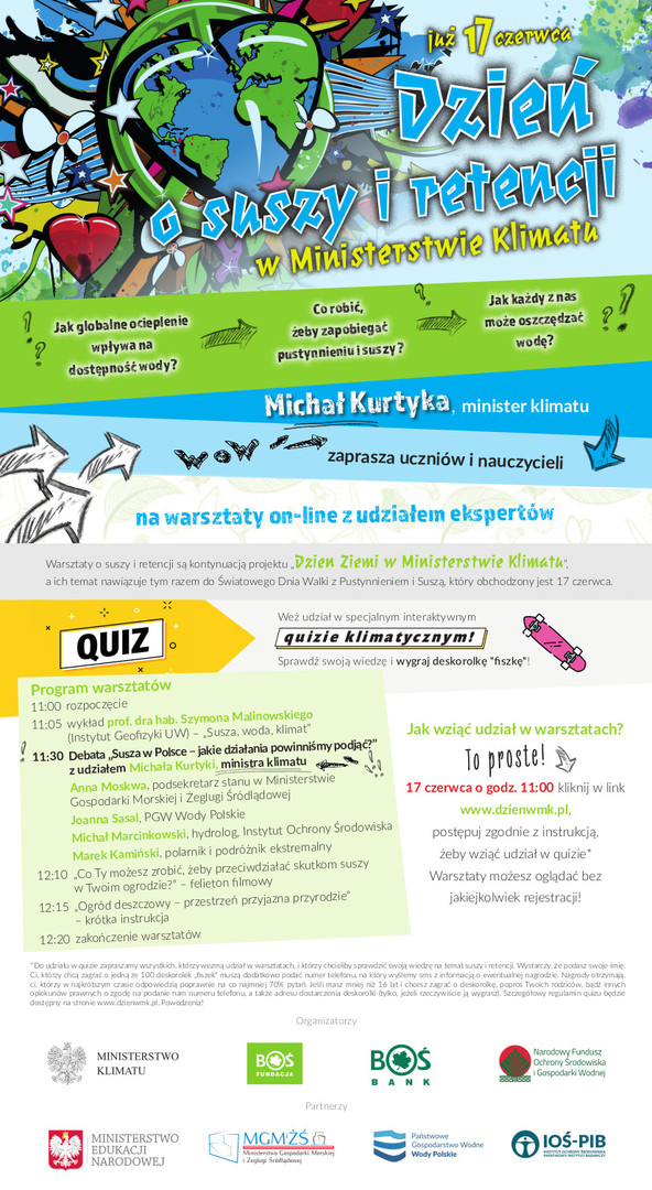 Przypominamy i serdecznie zapraszamy Państwa i Państwa uczniów do udziału w warsztatach on-line „Dzień o Suszy i Retencji w Ministerstwie Klimatu”, które odbędą się 17 czerwca (środa) w godzinach 11:00-12:30.