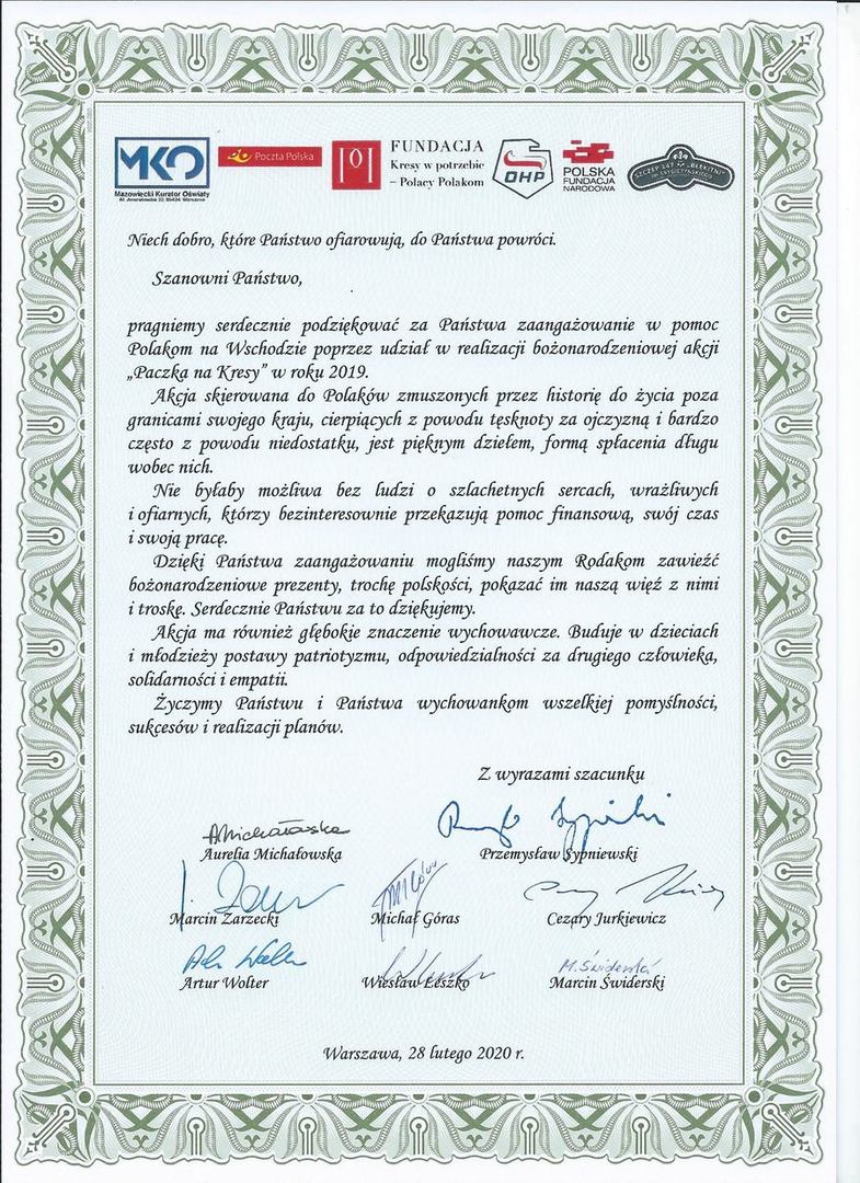 Mamy ogromną przyjemność poinformować, iż otrzymaliśmy podziękowanie od Organizatorów za aktywne zaangażowanie się w działania na rzecz Akcji „Paczka na Kresy”.