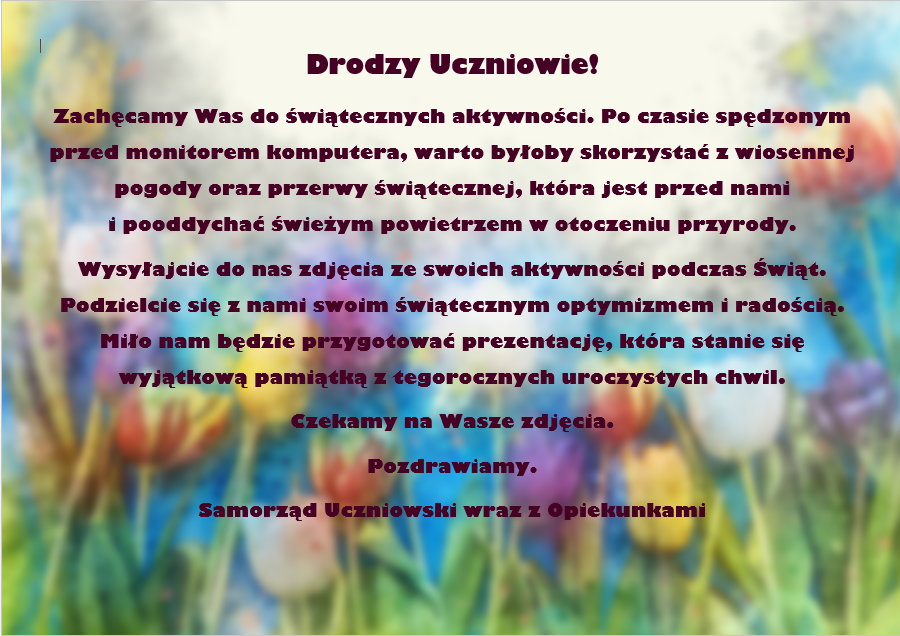 Zachęcamy Was do świątecznych aktywności. Po czasie spędzonym przed monitorem komputera, warto byłoby skorzystać z wiosennej pogody oraz przerwy świątecznej, która jest przed nami i pooddychać świeżym powietrzem w otoczeniu przyrody.
