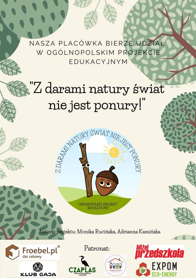W roku szkolnym 2021/2022 uczniowie klas I-III biorą udział w Ogólnopolskim Projekcie Edukacyjnym „Z darami natury świat nie jest ponury!”. Głównym celem projektu jest kształtowanie postaw proekologicznych, pobudzanie kreatywności dzieci i nauczycieli oraz zapoznanie z ideą zero waste.