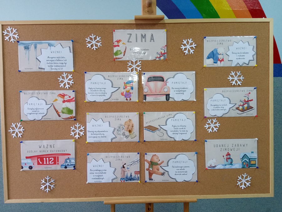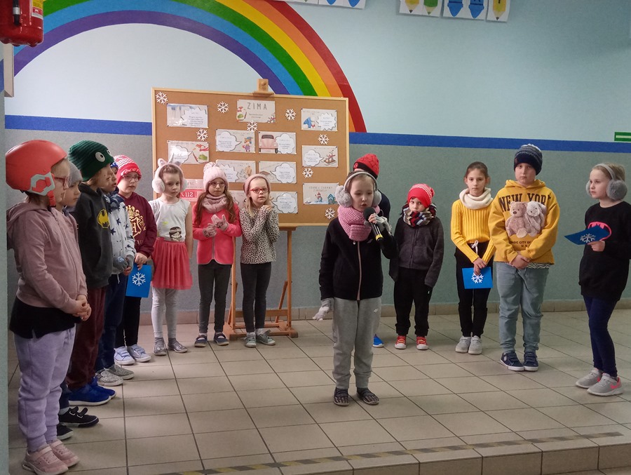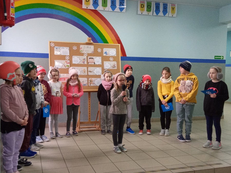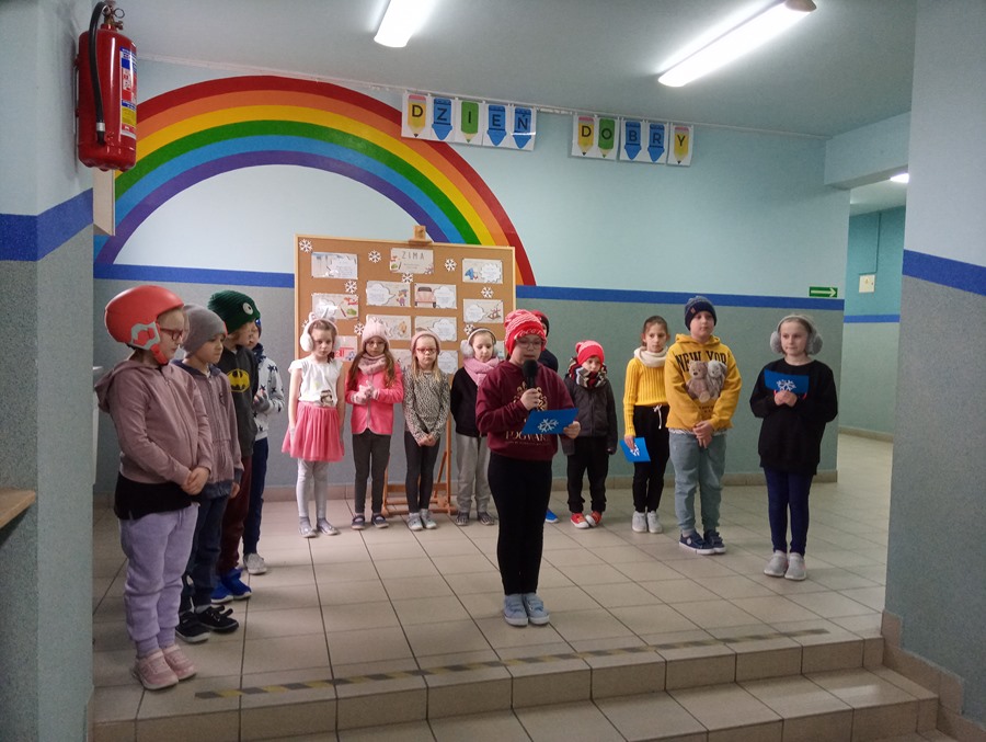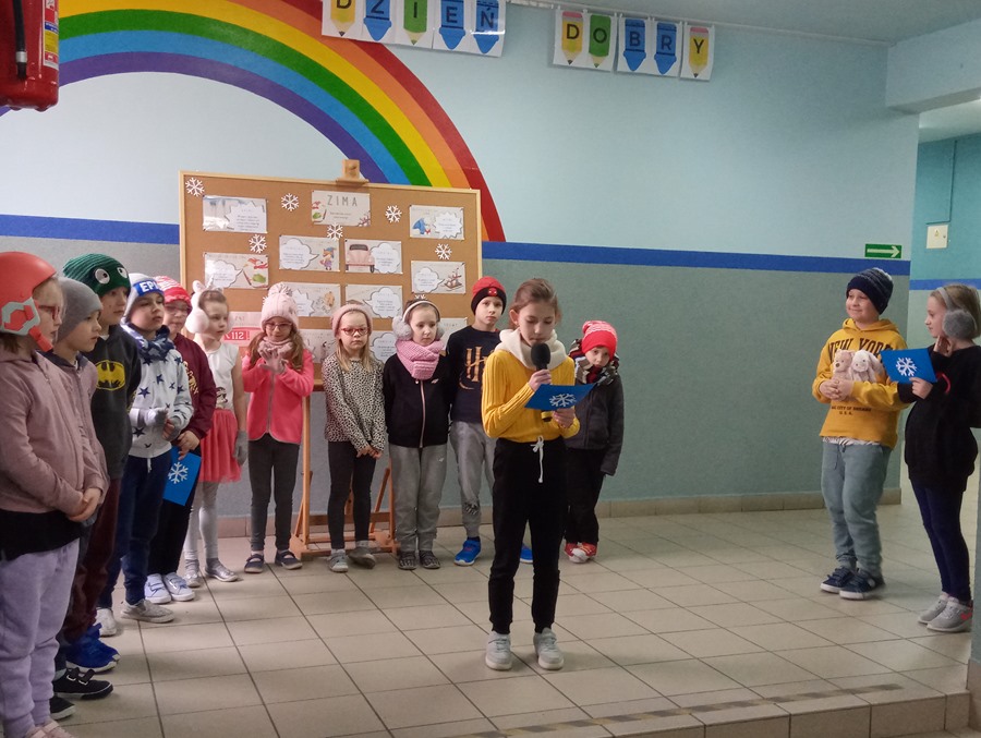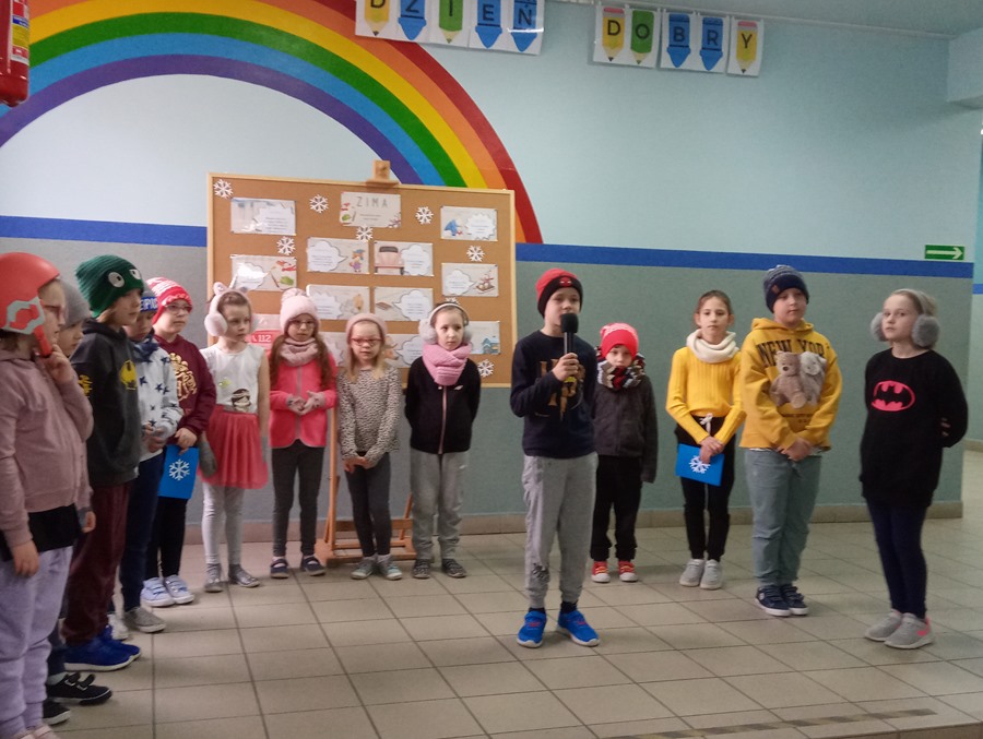 Uczniowie z koła teatralnego przygotowali dla swoich kolegów i koleżanek z klas I-III apel dotyczący bezpieczeństwa podczas ferii zimowych. Przypomnieli, że jest to czas odpoczynku, beztroski i zabaw z kolegami. Jednak bez względu na to gdzie będą w czasie ferii muszą pamiętać, że ich bezpieczeństwo zależy przede głównie od nich samych i ich zdrowego rozsądku.