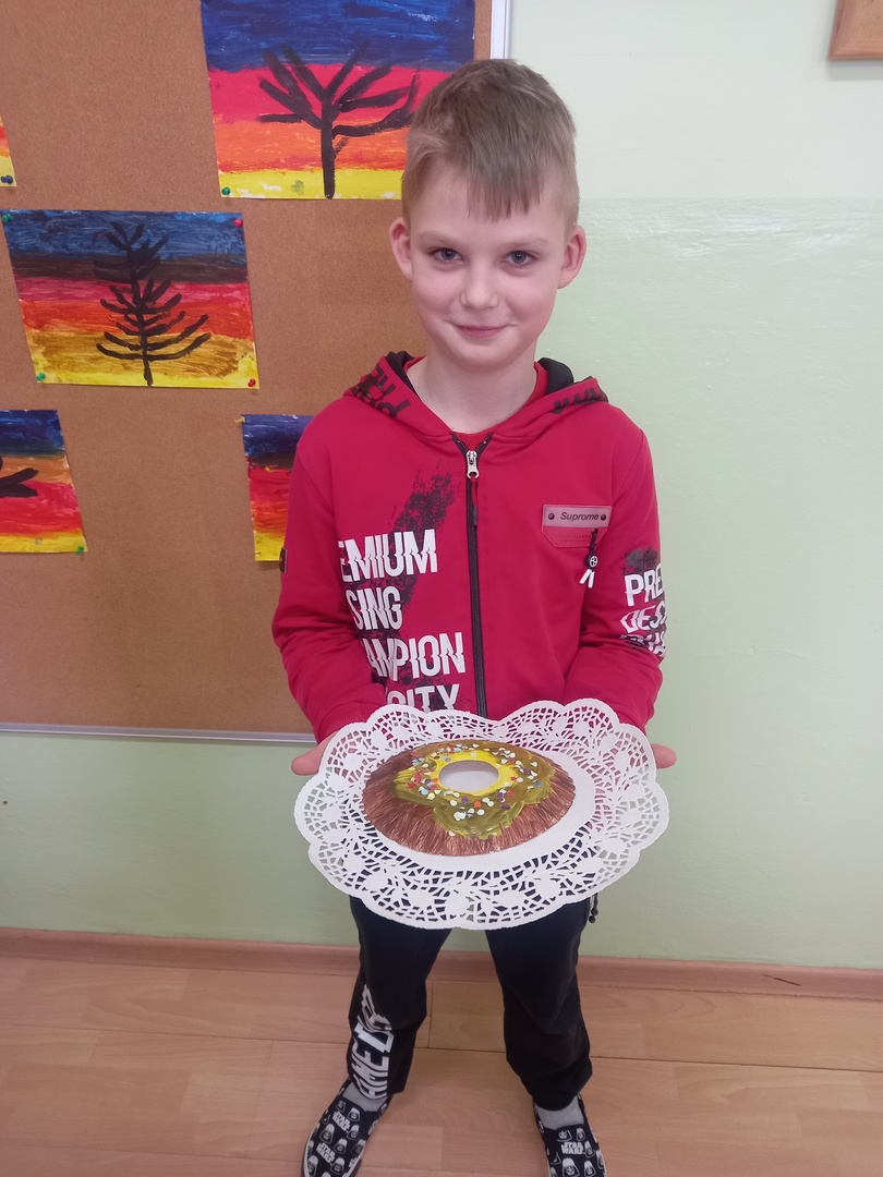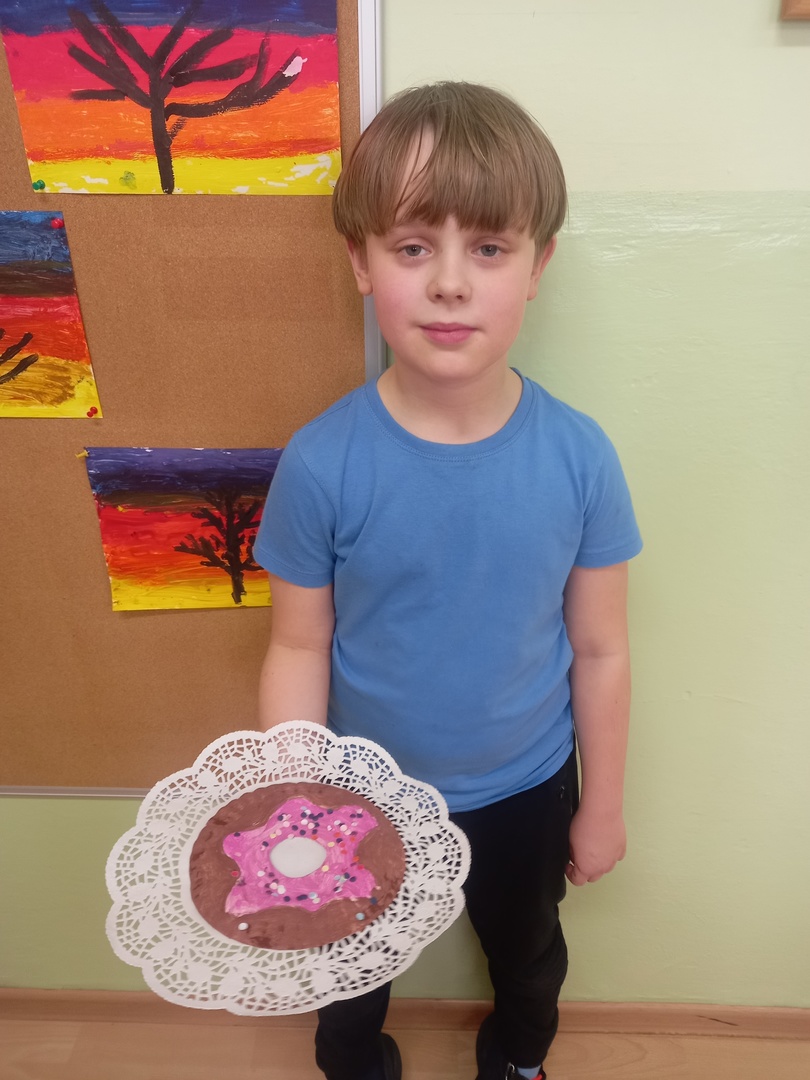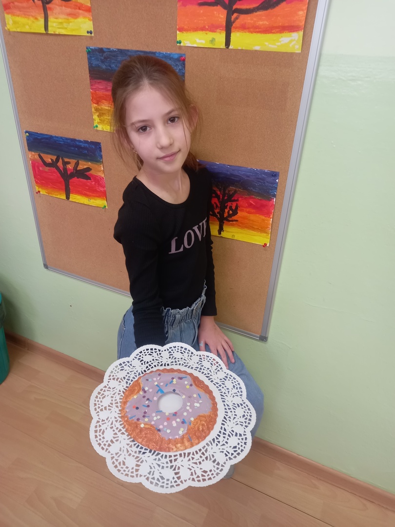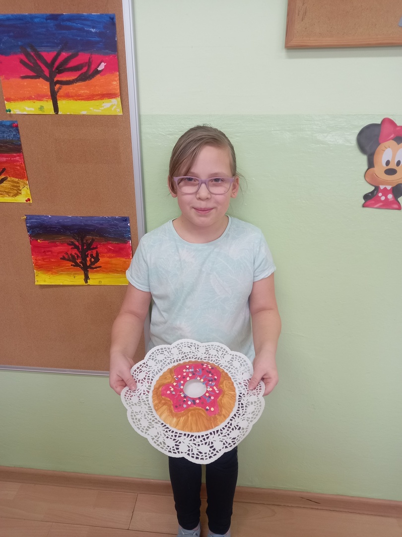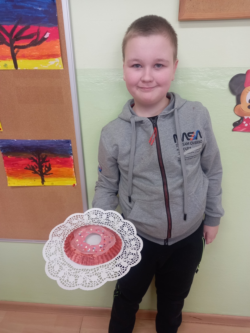 Podczas zajęć plastycznych uczniowie korzystając z papierowych talerzyków wykonali słodki przysmak - donaty