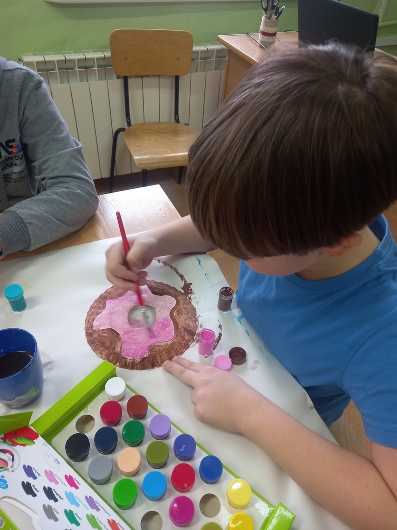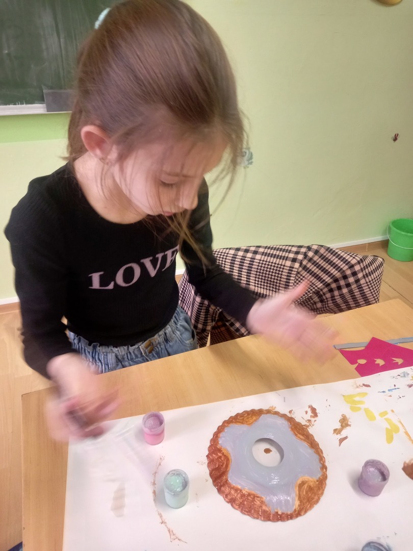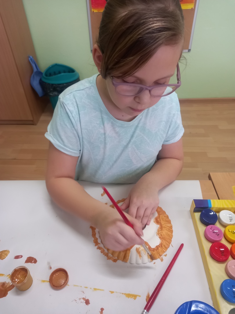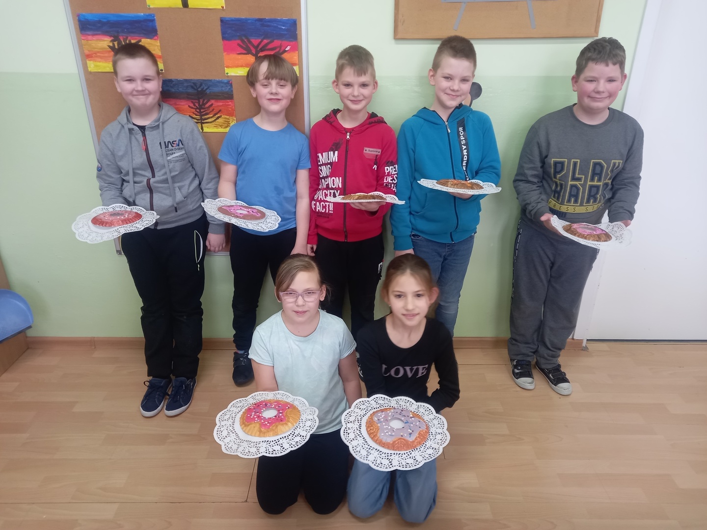 Podczas zajęć plastycznych uczniowie korzystając z papierowych talerzyków wykonali słodki przysmak - donaty