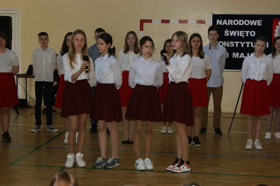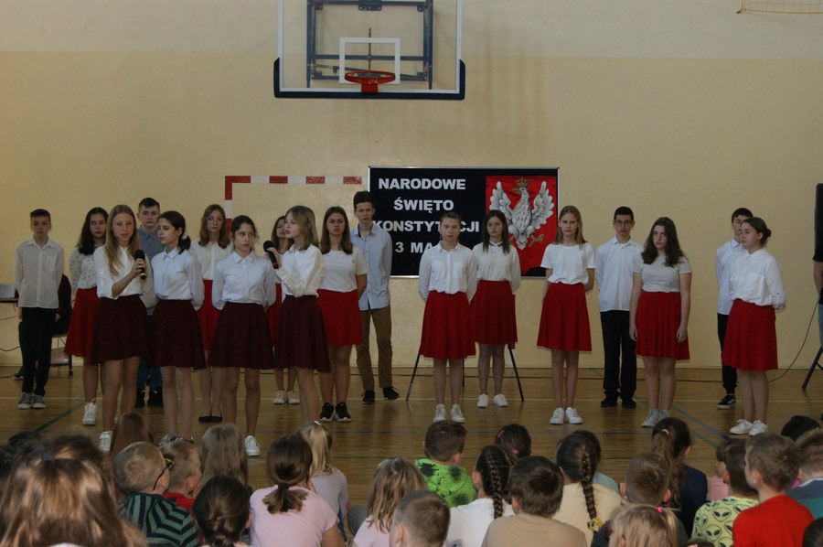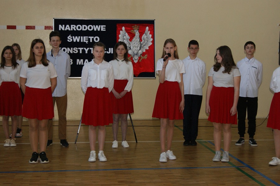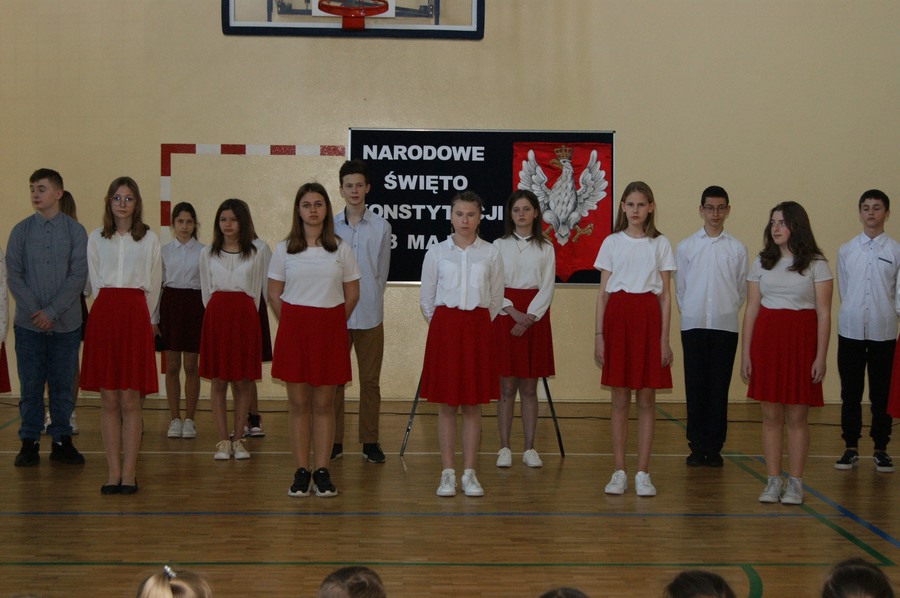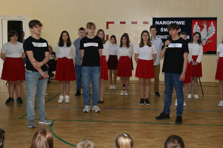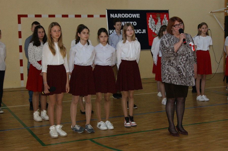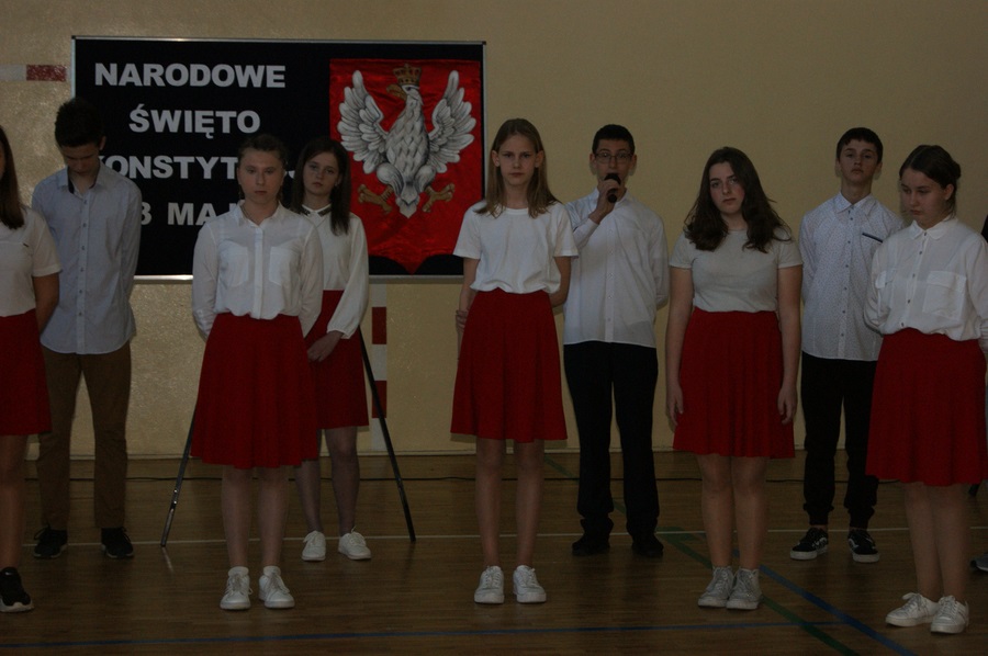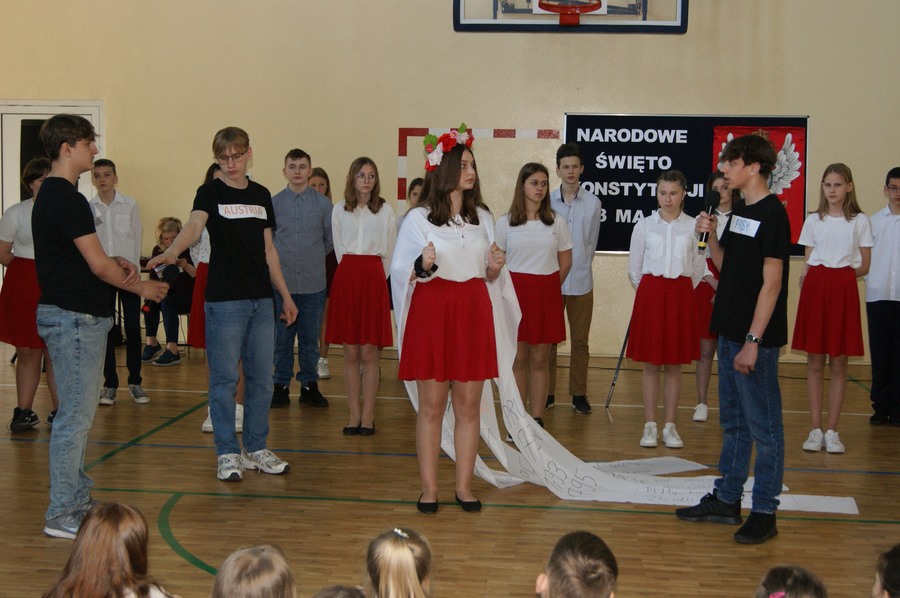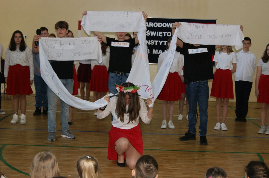 Szkolne przedstawienie przygotowane przez uczniów klasy 7a pod kierunkiem p. Marzeny Dyl przybliżyło ważne wydarzenia związane z ustanowieniem Konstytucji. Recytacja poezji i inscenizacja rozbiorów Polski oddały klimat tamtych czasów, a dzieje naszej Ojczyzny stały się bardziej zrozumiałe dla oglądających występ oraz przyczyniły się do rozbudzenia uczuć patriotycznych. Występ urozmaicił śpiew pieśni patriotycznych w wykonaniu uczennic z klasy 7b przygotowanych przez p. Julitę Gąsiewską.
