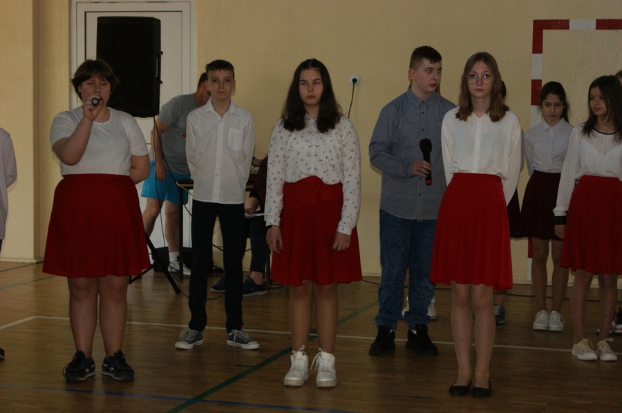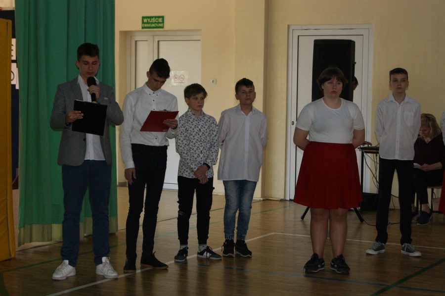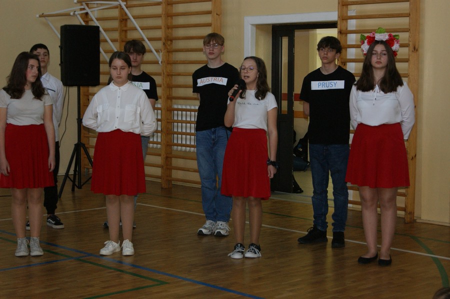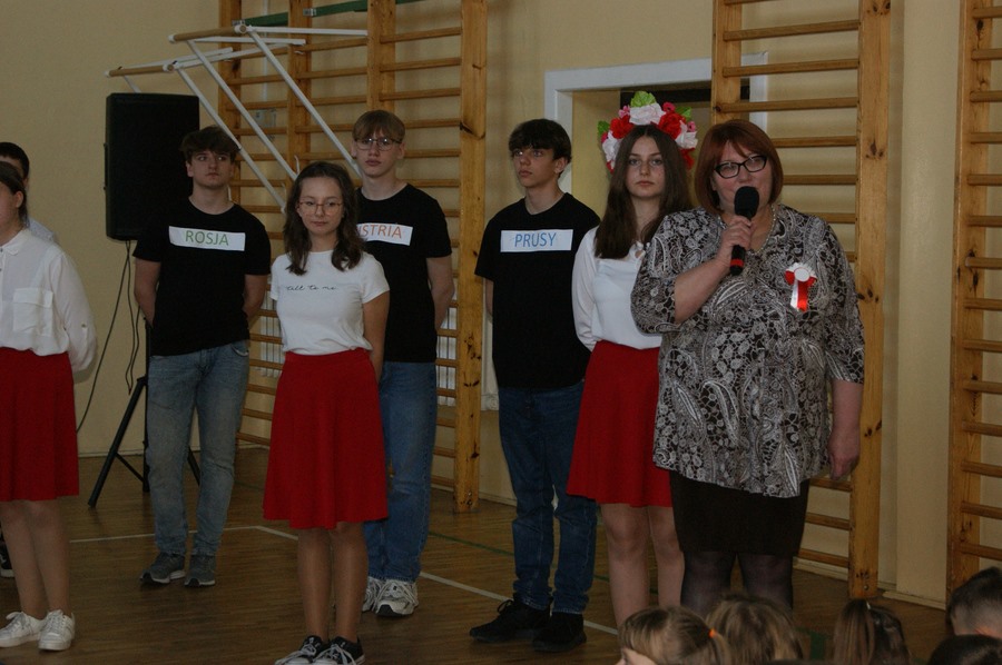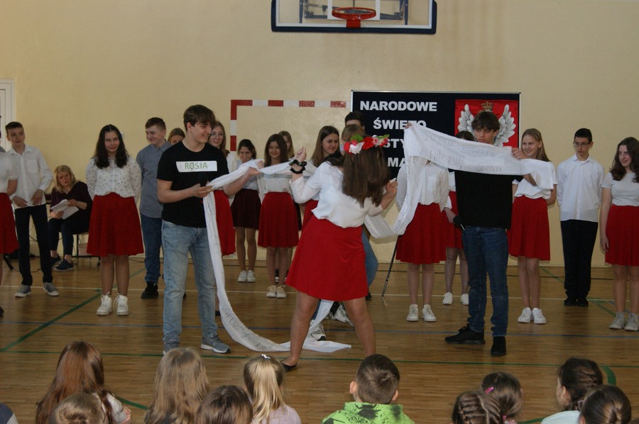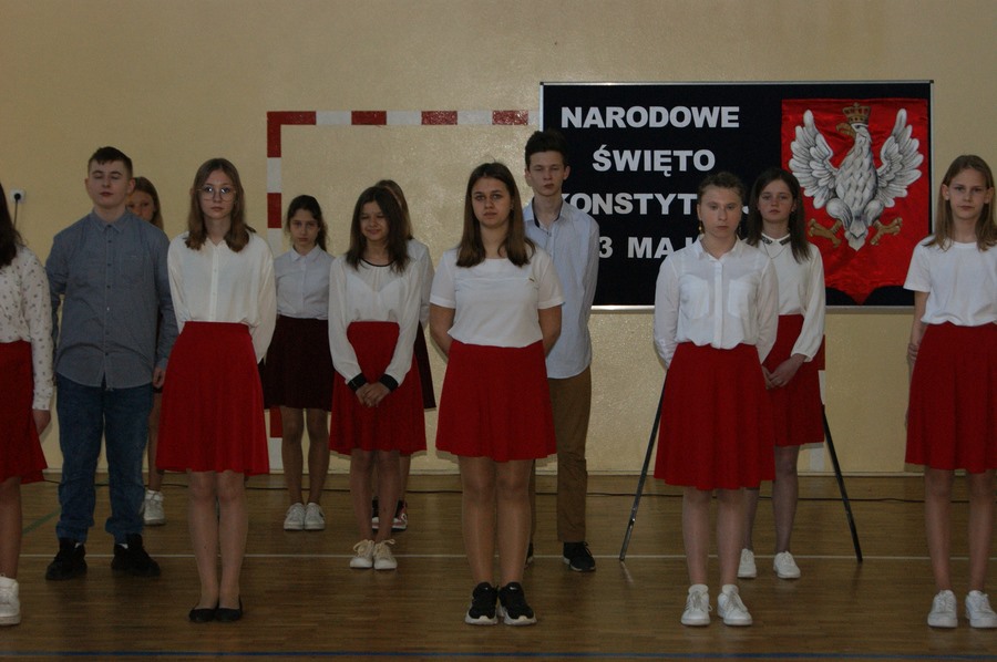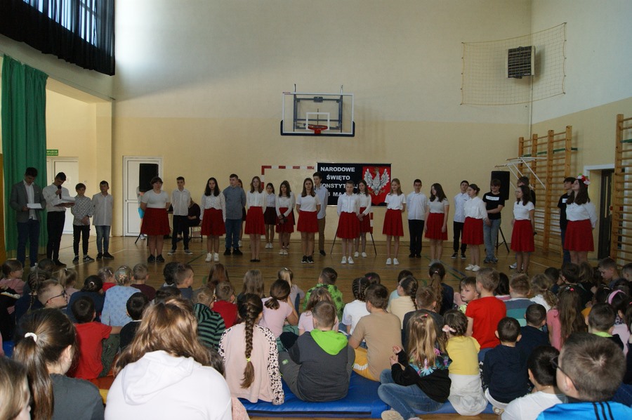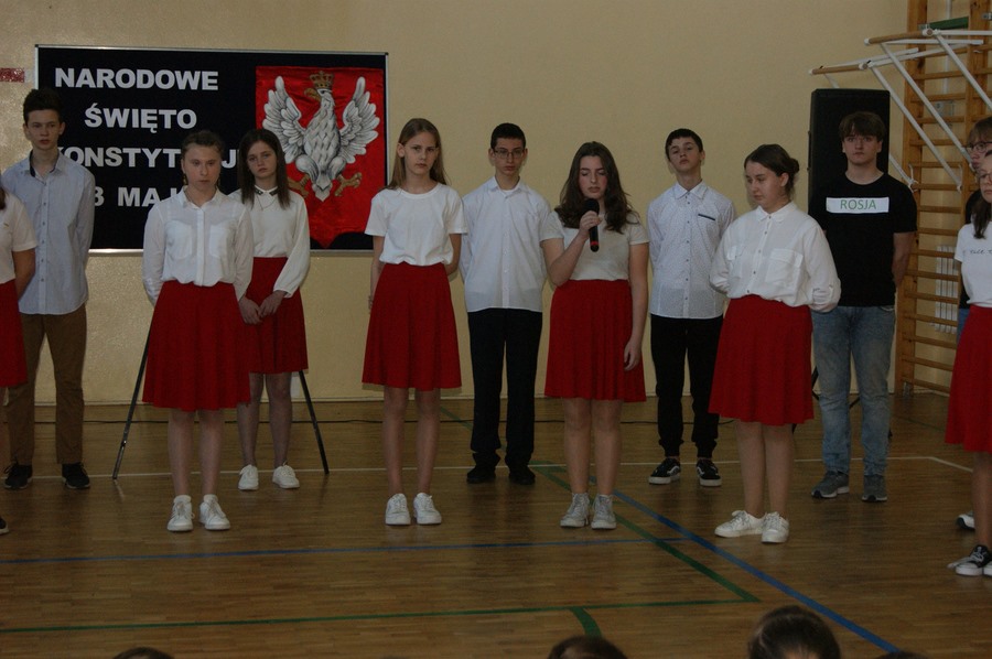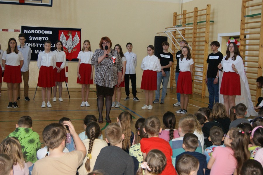Szkolne przedstawienie przygotowane przez uczniów klasy 7a pod kierunkiem p. Marzeny Dyl przybliżyło ważne wydarzenia związane z ustanowieniem Konstytucji. Recytacja poezji i inscenizacja rozbiorów Polski oddały klimat tamtych czasów, a dzieje naszej Ojczyzny stały się bardziej zrozumiałe dla oglądających występ oraz przyczyniły się do rozbudzenia uczuć patriotycznych. Występ urozmaicił śpiew pieśni patriotycznych w wykonaniu uczennic z klasy 7b przygotowanych przez p. Julitę Gąsiewską.