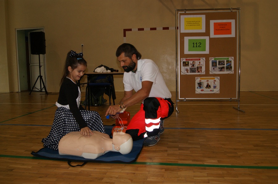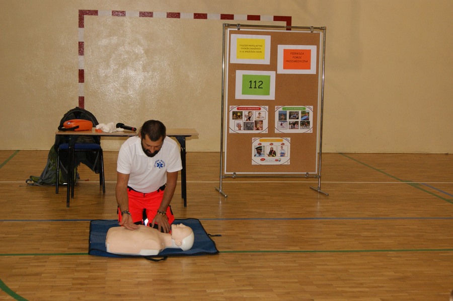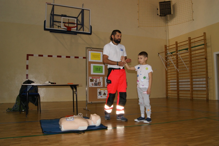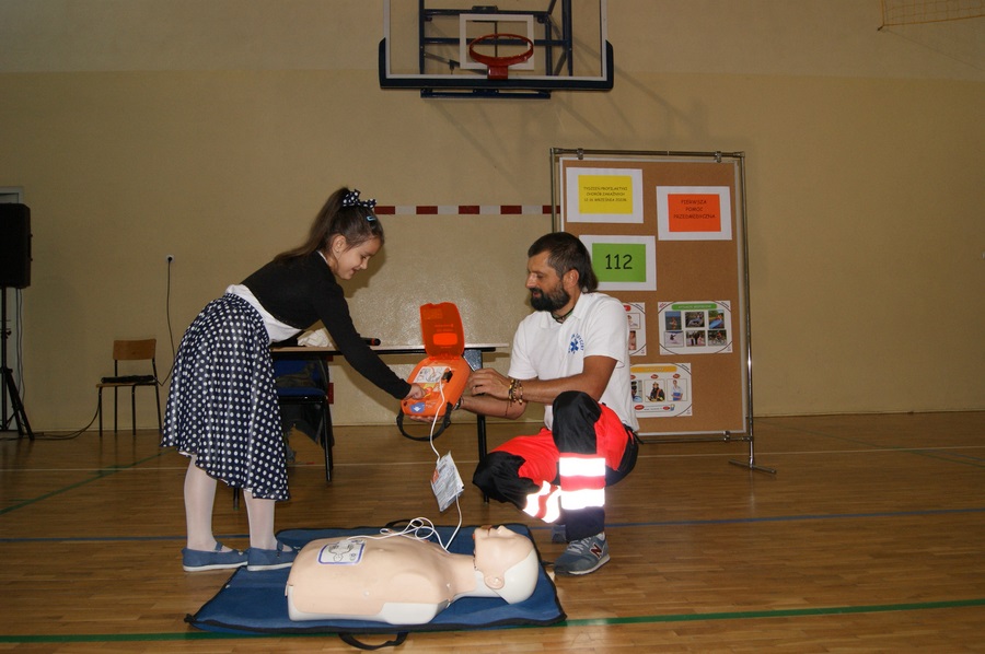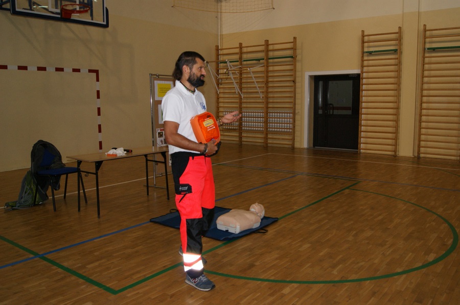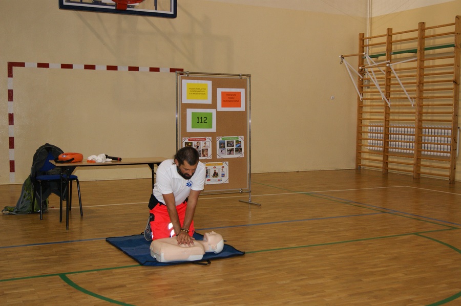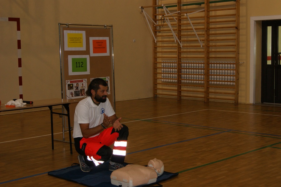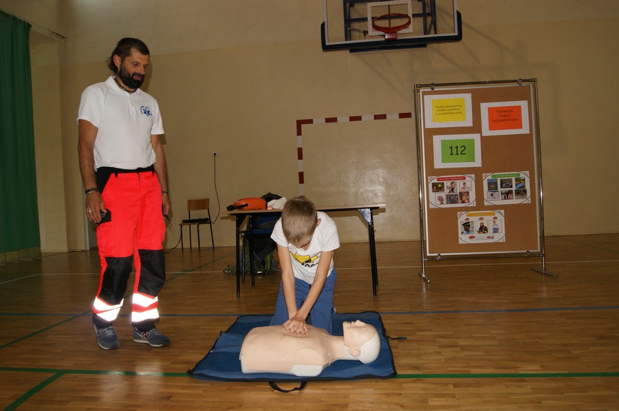 Naszym kolejnym działaniem w ramach tygodnia Profilaktyki Chorób Zakaźnych było spotkanie z ratownikiem medycznym panem Robertem Maciochem, który przypomniał uczniom telefony alarmowe, zasady wzywania pomocy oraz prawidłowy sposób wykonywania resuscytacji krążeniowo - oddechowej. Wielkim zainteresowaniem okazał się defibrylator serca, którego działanie uczniowie mogli zobaczyć pierwszy raz. Na zakończenie spotkania pan Robert zaprezentował prawidłowy sposób wykonania opatrunku różnego rodzaju skaleczeń i urazów. Dziękujemy za interesującą lekcję.