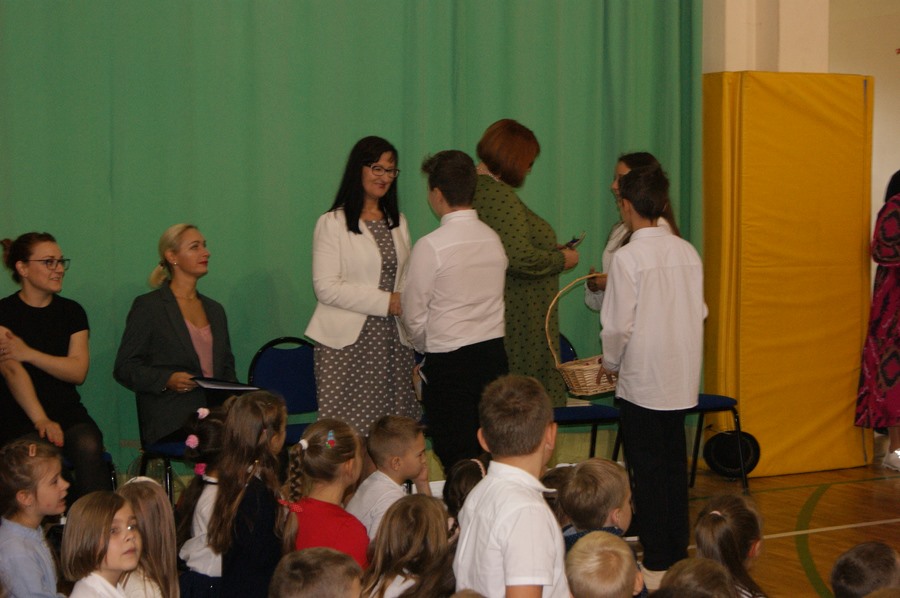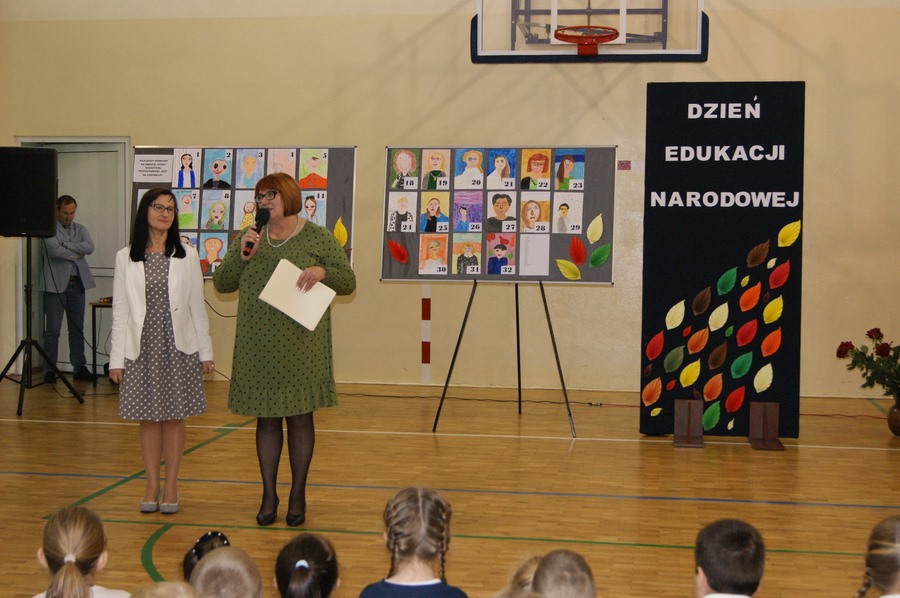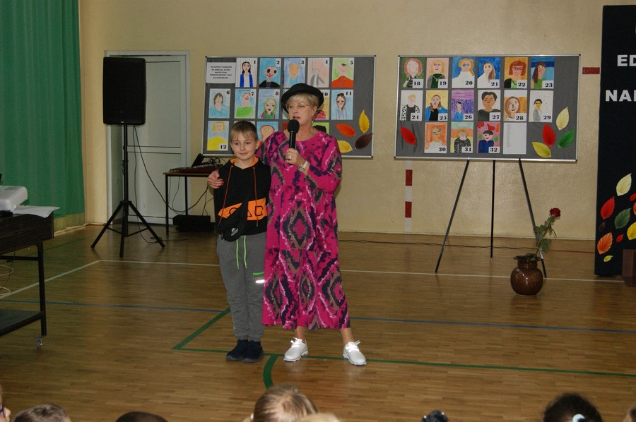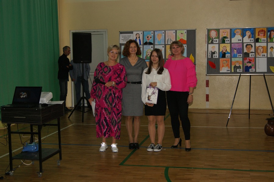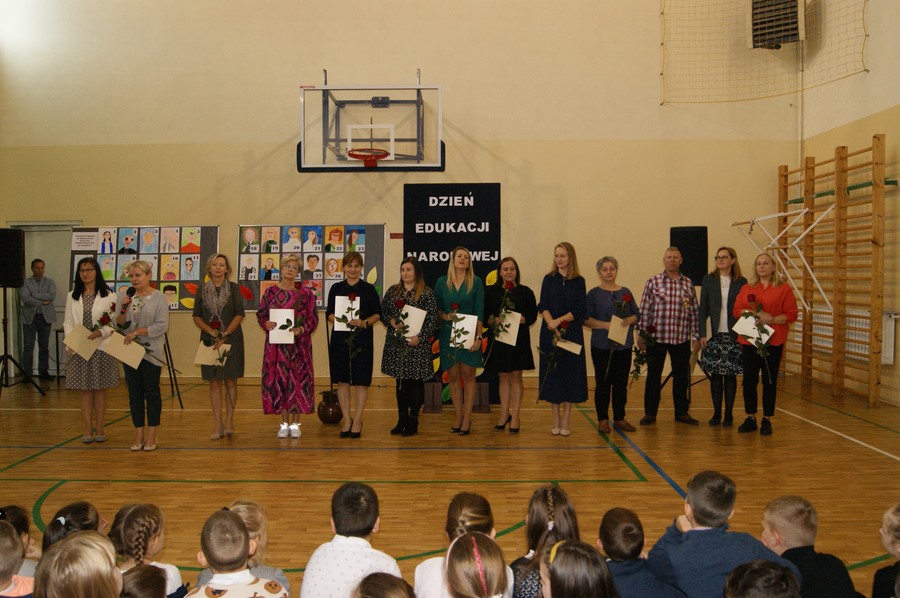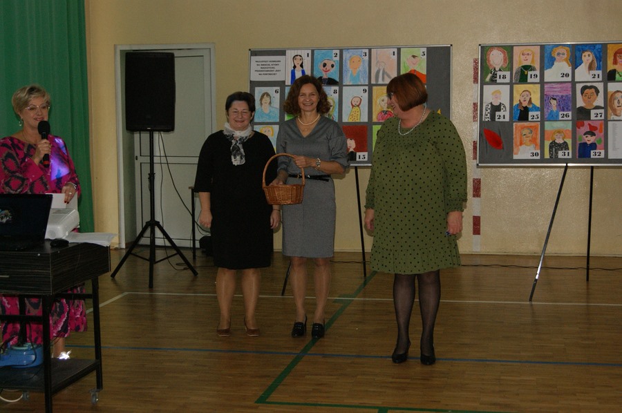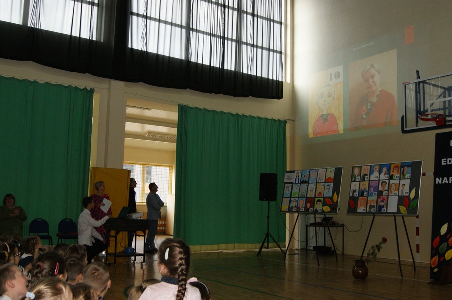 W przededniu Dnia Edukacji Narodowej Samorząd Uczniowski przygotował uroczystą akademię, aby podziękować nauczycielom i pracownikom szkoły za serce i wysiłek wkładany w rozwój młodego pokolenia. Program artystyczny wprowadził publiczność w świetny nastrój, ale szczególne wrażenie zrobiła na wszystkich prezentacja portretów nauczycieli przygotowanych przez uczniów klas I- III i odgadywanie, kto jest namalowany na wyświetlanym portrecie. Konkurs wygrała klasa VIIIb, która odgadła 15 z 31 prezentowanych pedagogów. Następnie przedstawiciele Samorządu Uczniowskiego dziękując za codzienny trud, przekazaną wiedzę i wsparcie w trudnych chwilach obdarowali pracowników szkoły pięknymi kompozycjami z suszonych kwiatów.