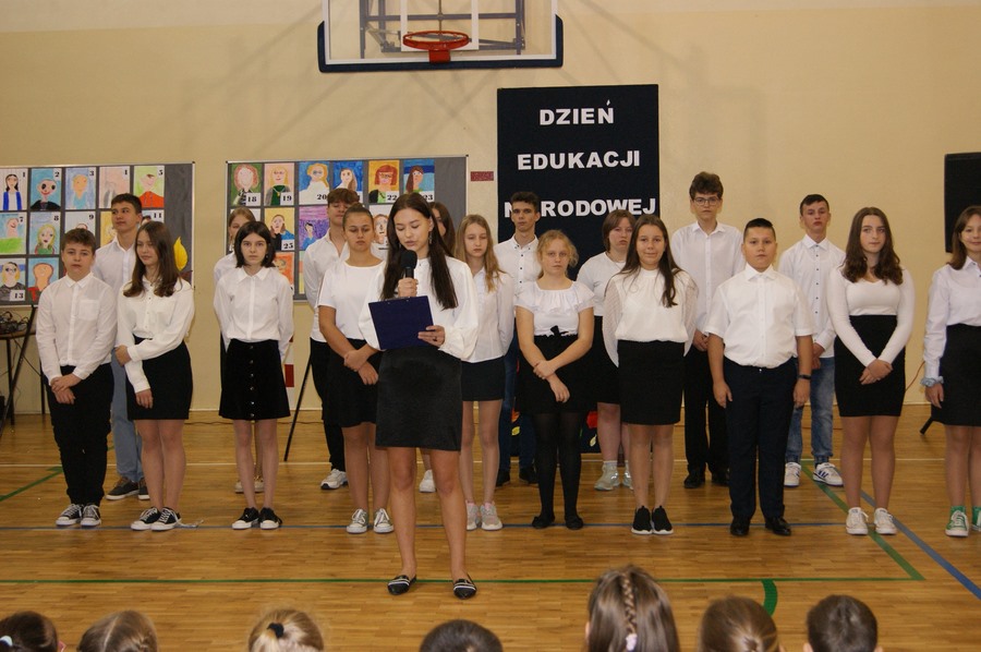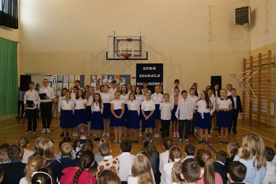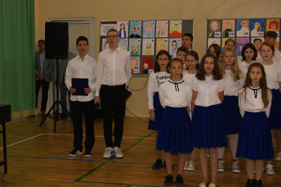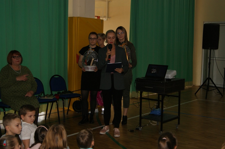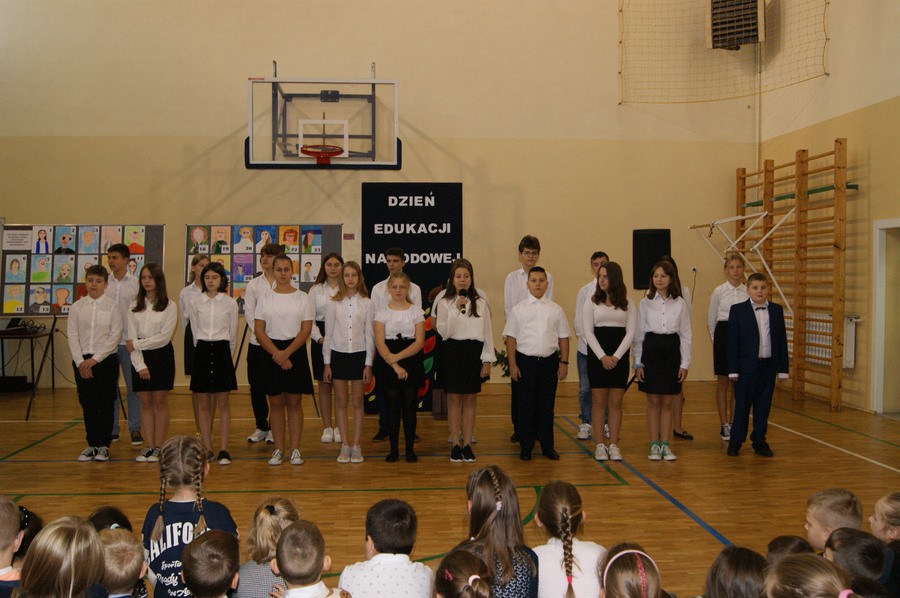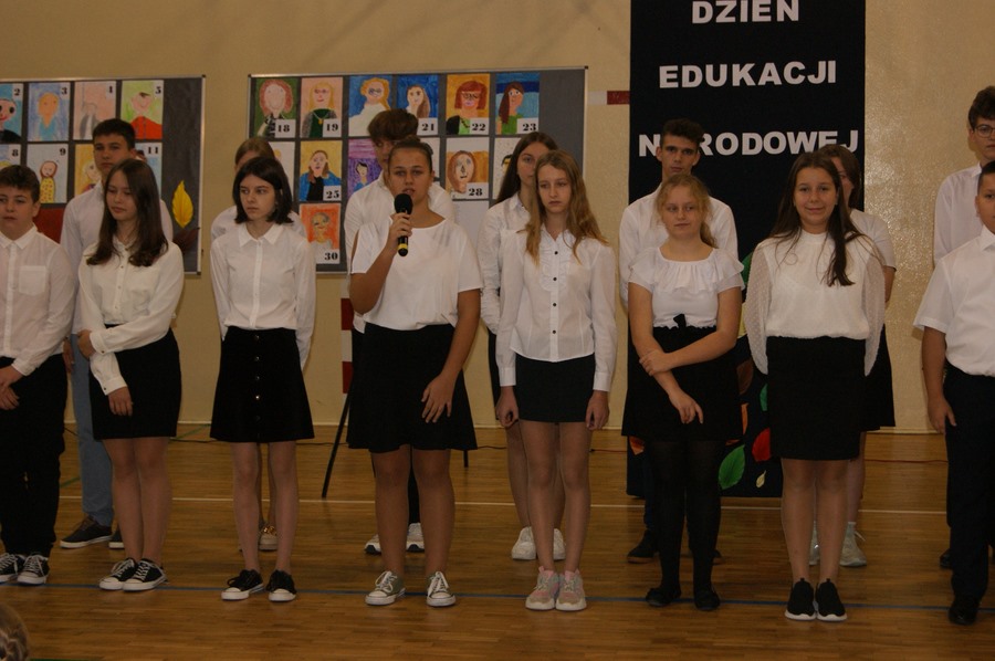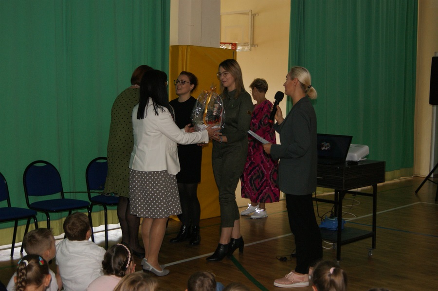 W przededniu Dnia Edukacji Narodowej Samorząd Uczniowski przygotował uroczystą akademię, aby podziękować nauczycielom i pracownikom szkoły za serce i wysiłek wkładany w rozwój młodego pokolenia. Program artystyczny wprowadził publiczność w świetny nastrój, ale szczególne wrażenie zrobiła na wszystkich prezentacja portretów nauczycieli przygotowanych przez uczniów klas I- III i odgadywanie, kto jest namalowany na wyświetlanym portrecie. Konkurs wygrała klasa VIIIb, która odgadła 15 z 31 prezentowanych pedagogów. Następnie przedstawiciele Samorządu Uczniowskiego dziękując za codzienny trud, przekazaną wiedzę i wsparcie w trudnych chwilach obdarowali pracowników szkoły pięknymi kompozycjami z suszonych kwiatów.