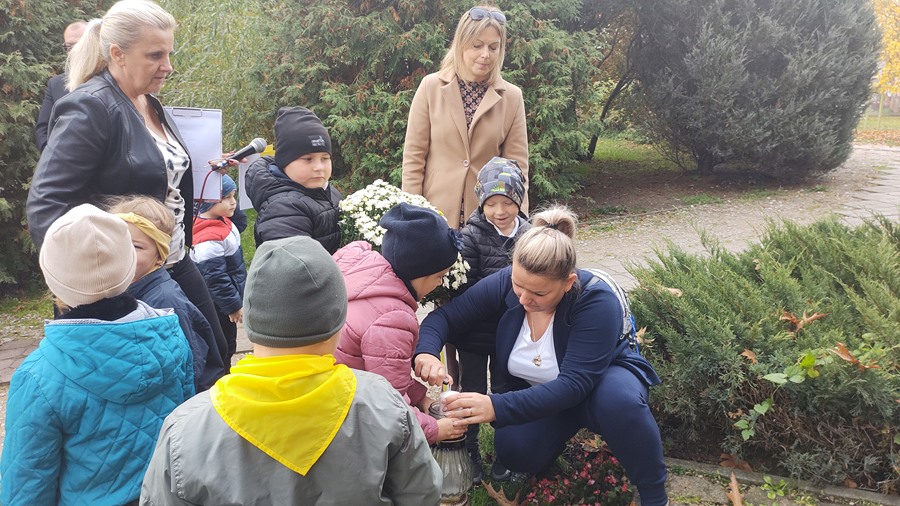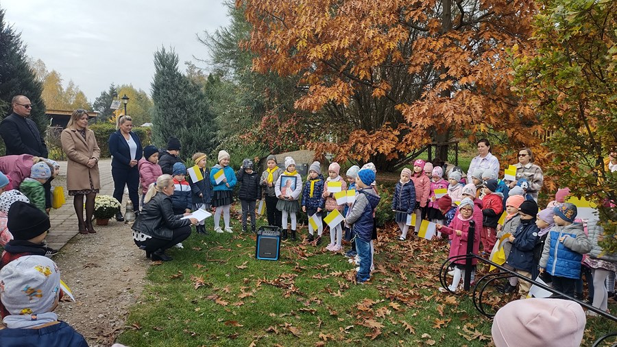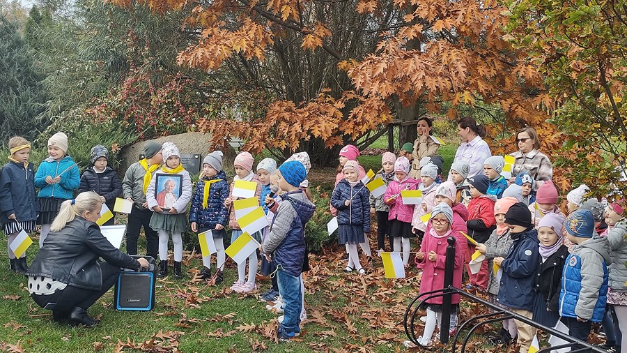 Podczas tego Dnia dzieci miały okazję przypomnieć sobie, kim był Jan Paweł II i co starał się nam przekazać przykładem swego życia, zwłaszcza jako człowiek, który ufał Bogu i jako papież, który zawierzył całą ludzkość Bożemu Miłosierdziu. Następnie udaliśmy się do parku, by przy tablicy upamiętniającej pontyfikat Papieża Polaka wysłuchać programu artystycznego przygotowanego przez dzieci 6-letnie z gr. ,,Sowy". Przedszkolaki recytowały wiersze, śpiewały piosenkę oraz zapaliły znicz.