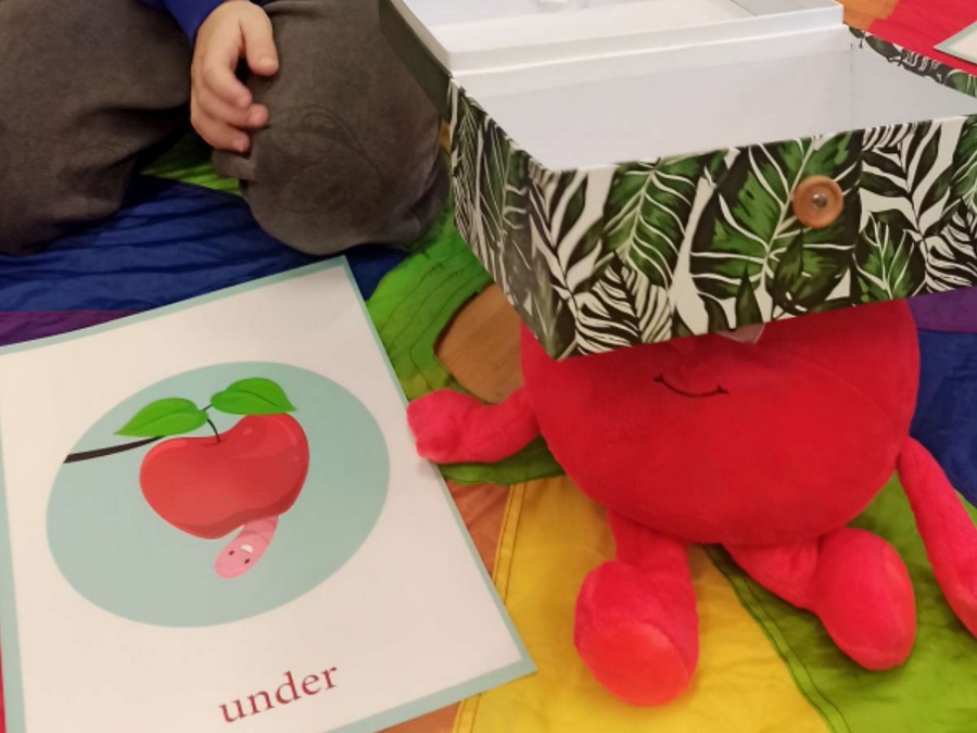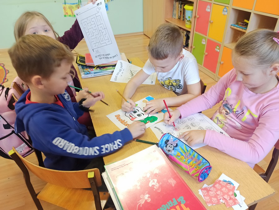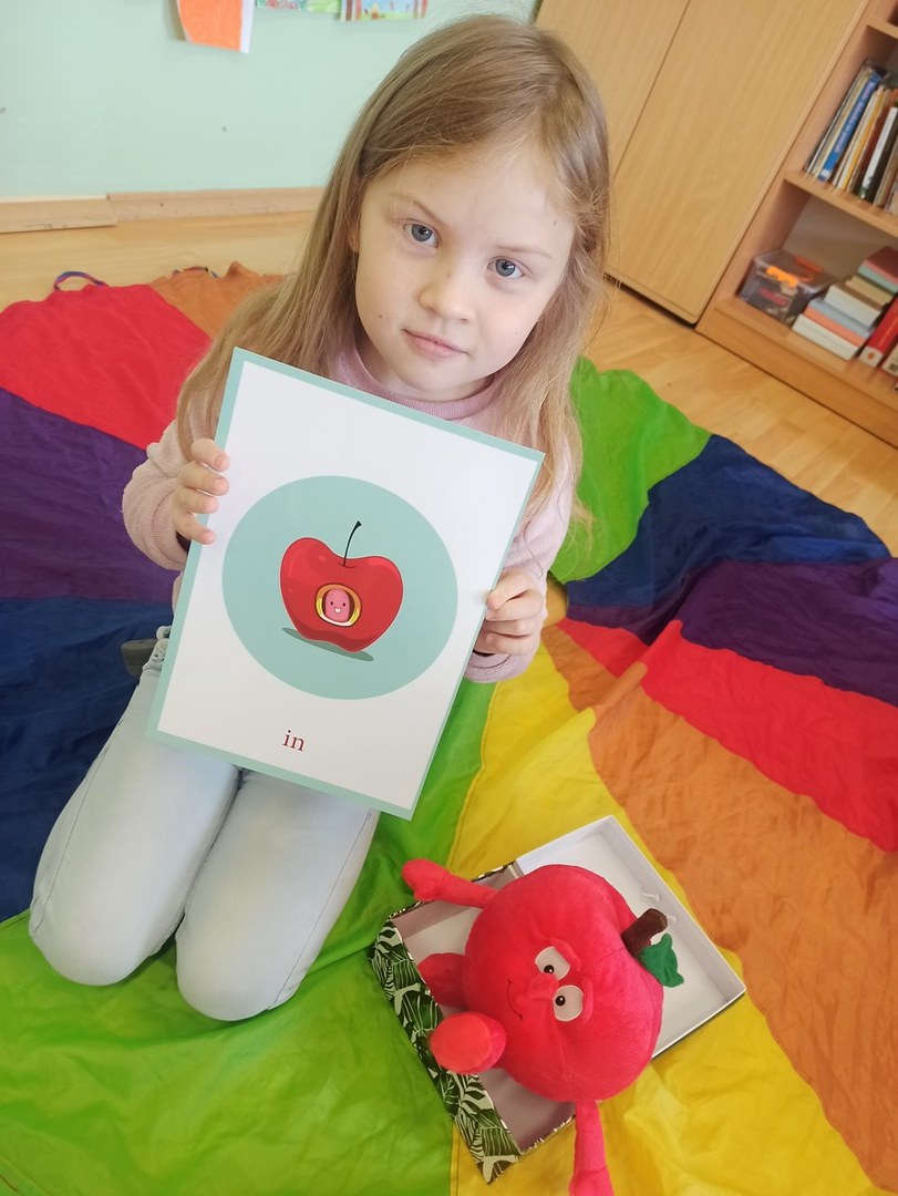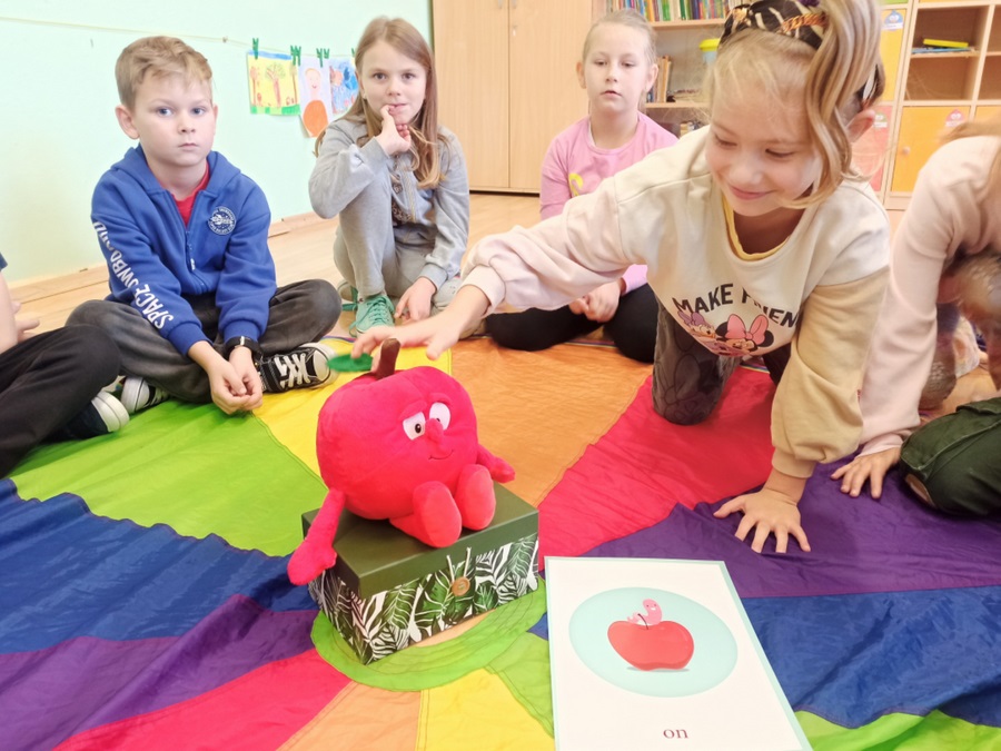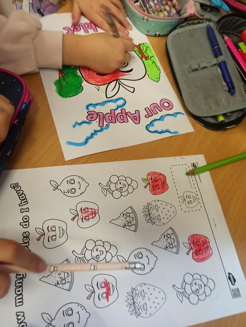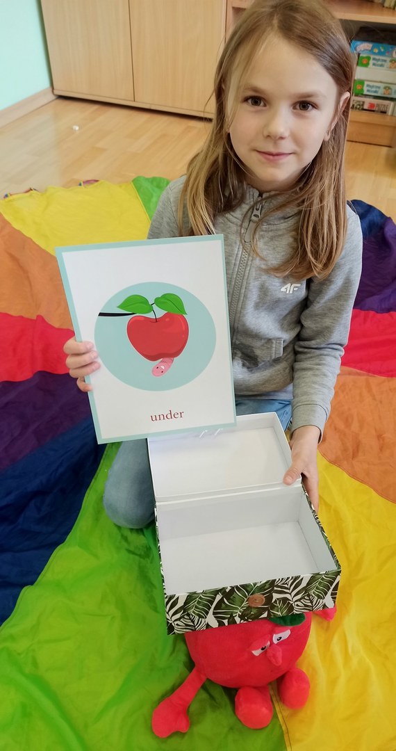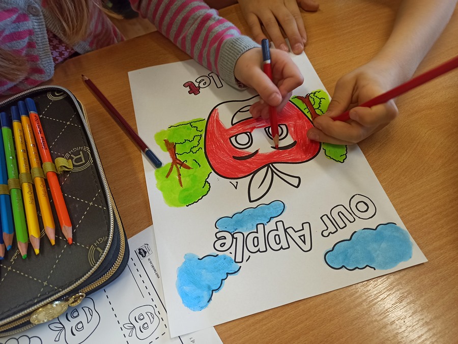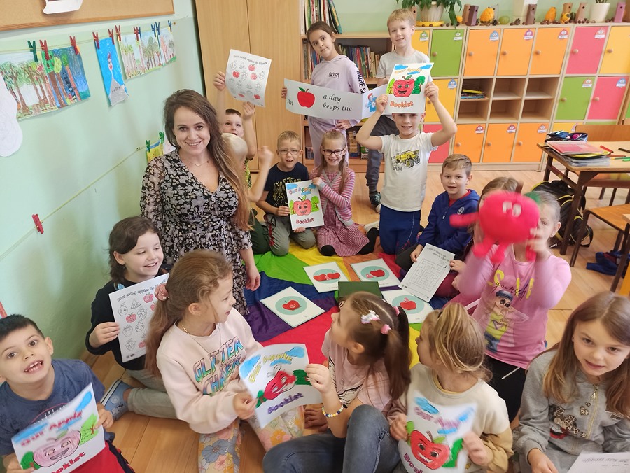 Zajęcia języka angielskiego przebiegły w radosnej atmosferze oraz były doskonałą okazją do tego, aby dowiedzieć się ciekawostek dotyczących właściwości tego smacznego owocu. Poznaliśmy stare angielskie przysłowie „An apple a day keeps the doctor away”(„Zjadaj jedno jabłko dziennie, a lekarz potrzebny Ci nie będzie”). Dzieci opisywały owoc, jego wygląd, zapach i smak. Nie zabrakło również zabaw z chustą animacyjną, przy których utrwaliliśmy nazwy kolorów, liczb oraz poznaliśmy przyimki miejsca w języku angielskim. W grupach wykonaliśmy również książeczki o jabłkach.