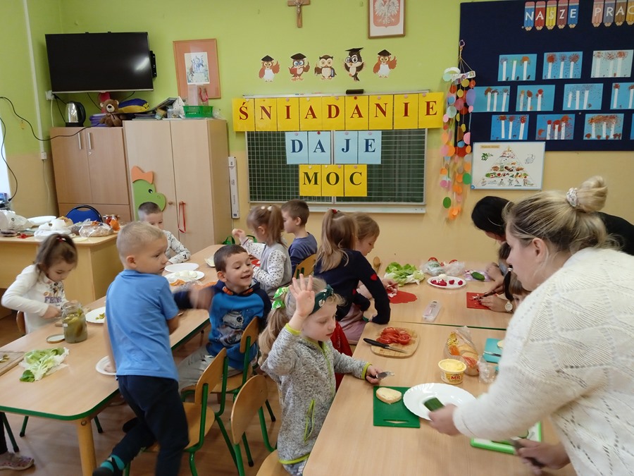 8 listopada dzieci z oddziałów Misie i Sowy wzięły udział w akcji Śniadanie Daje Moc. Dzieci razem z rodzicami przygotowały wspólne śniadanie, które potem ze smakiem zjadły. Na stołach znalazły się tylko zdrowe produkty. Celem wspólnego śniadania było uświadomienie dzieciom, że to najważniejszy posiłek w diecie każdego z nas.