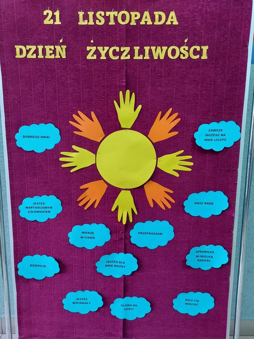 22 listopada uczniowie z klas I-III obchodzili Dzień Życzliwości. Życzliwość to cecha kogoś, kto lubi innych ludzi, chce ich dobra i gotów jest działać w tym celu, aby działo im się dobrze. Na dworze było szaro i ponuro, a w naszej szkole wszyscy byli dla siebie mili i uśmiechnięci. Bądźmy dla siebie życzliwi przez cały rok.