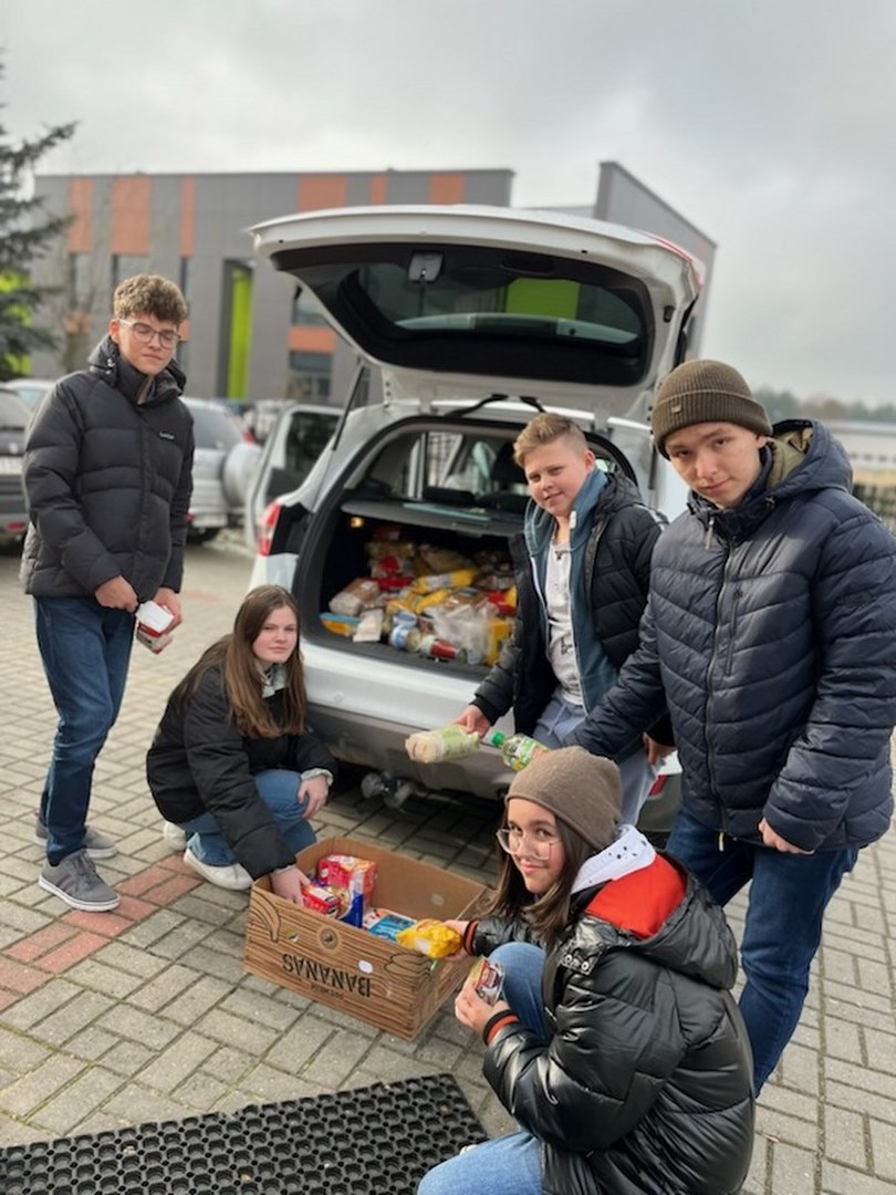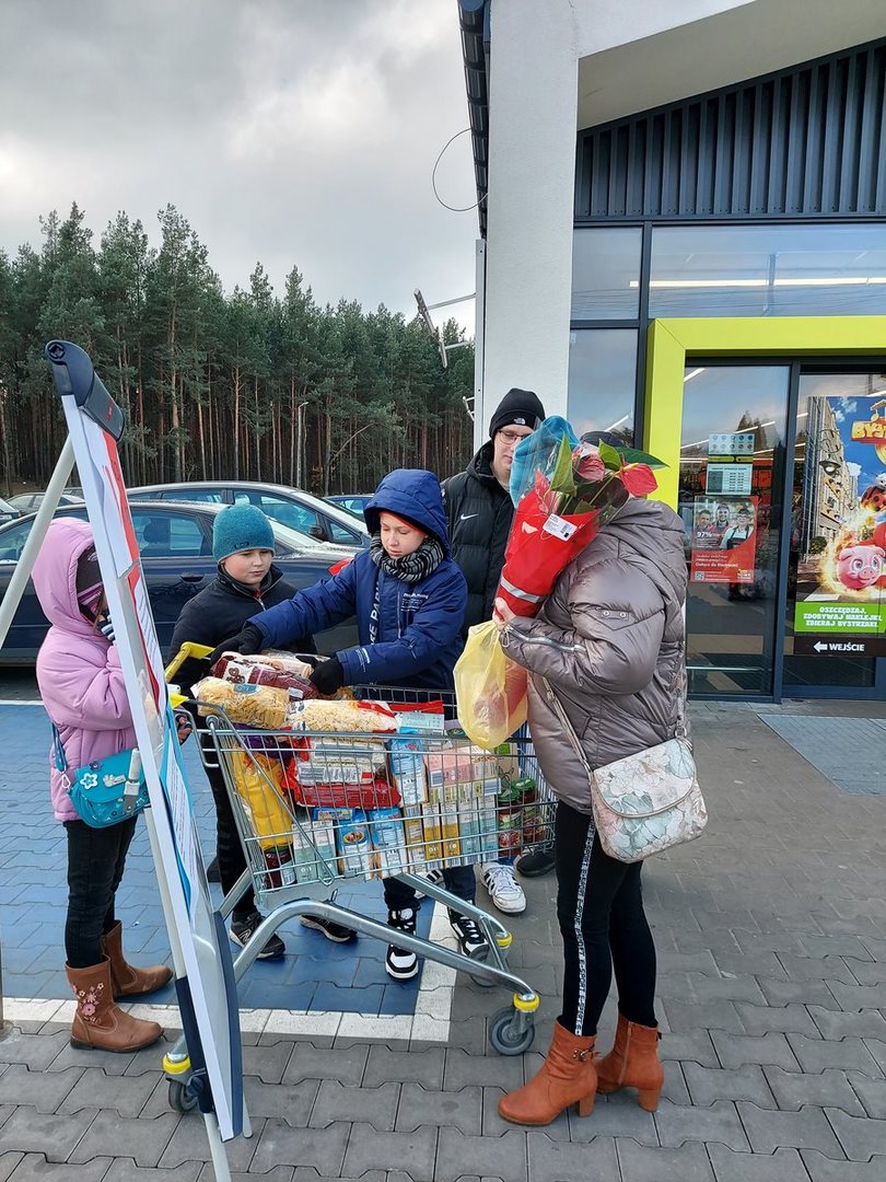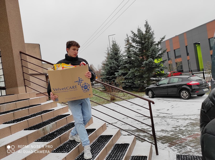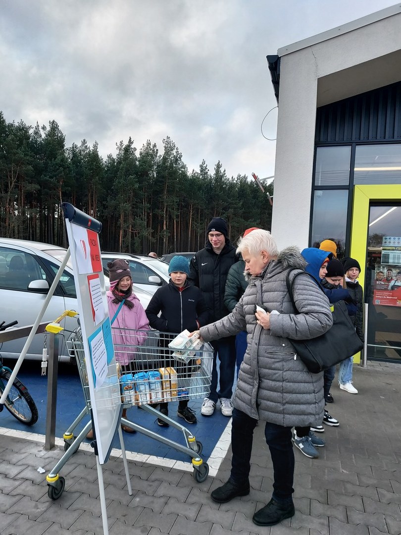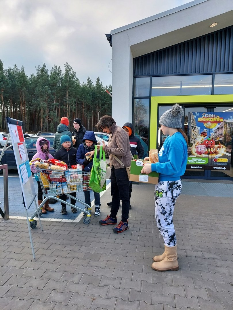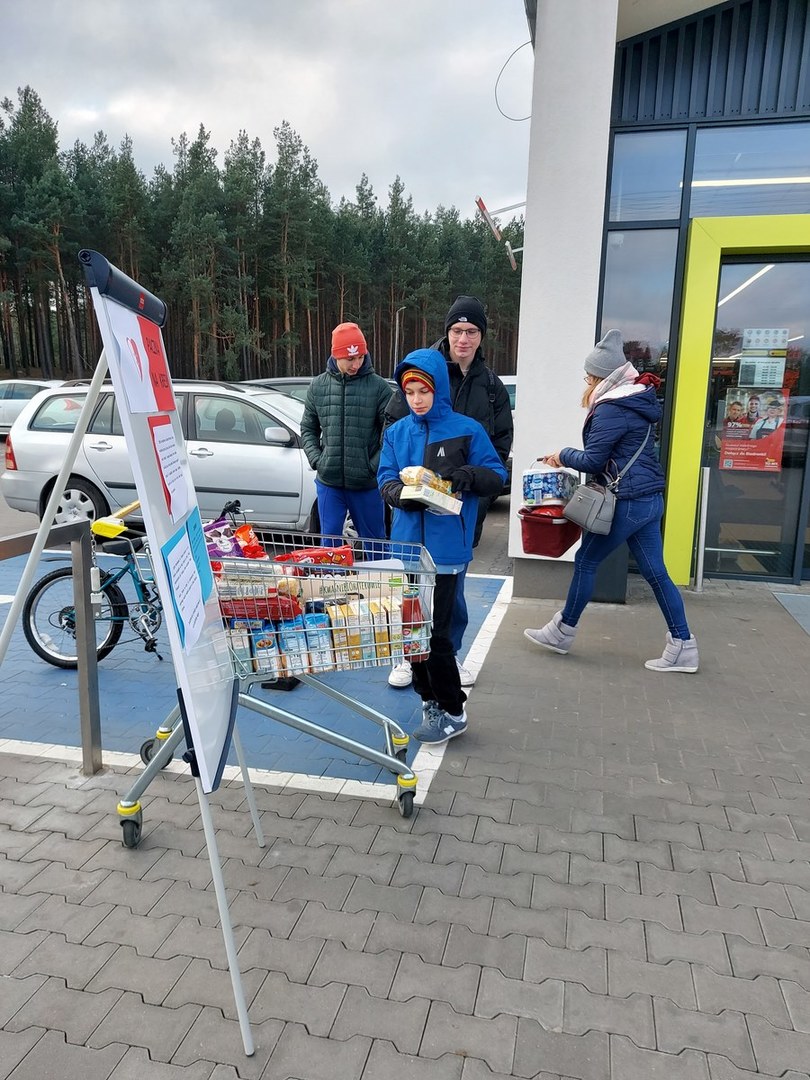 Od 15 do 30 listopada zbieraliśmy na terenie szkoły artykuły spożywcze i środki czystości. W sobotę 19 listopada wolontariusze przeprowadzili zbiórkę wśród klientów sklepów „Topaz” i „Biedronka”. Życzliwość i hojność, z jaką się spotkaliśmy przerosła nasze oczekiwania. W sumie w ciągu dwóch tygodni udało się zebrać kilkaset kilogramów produktów spożywczych i środków czystości.