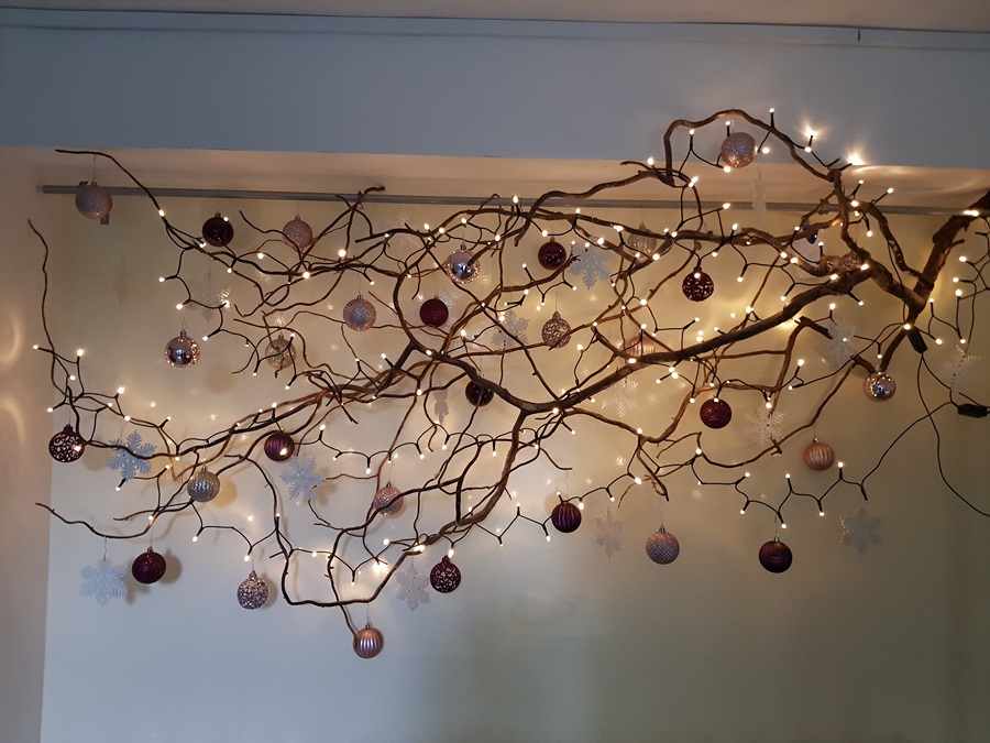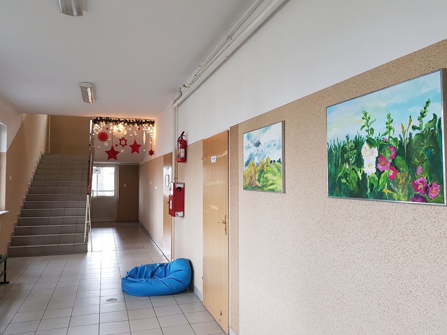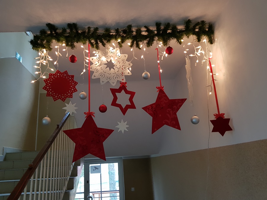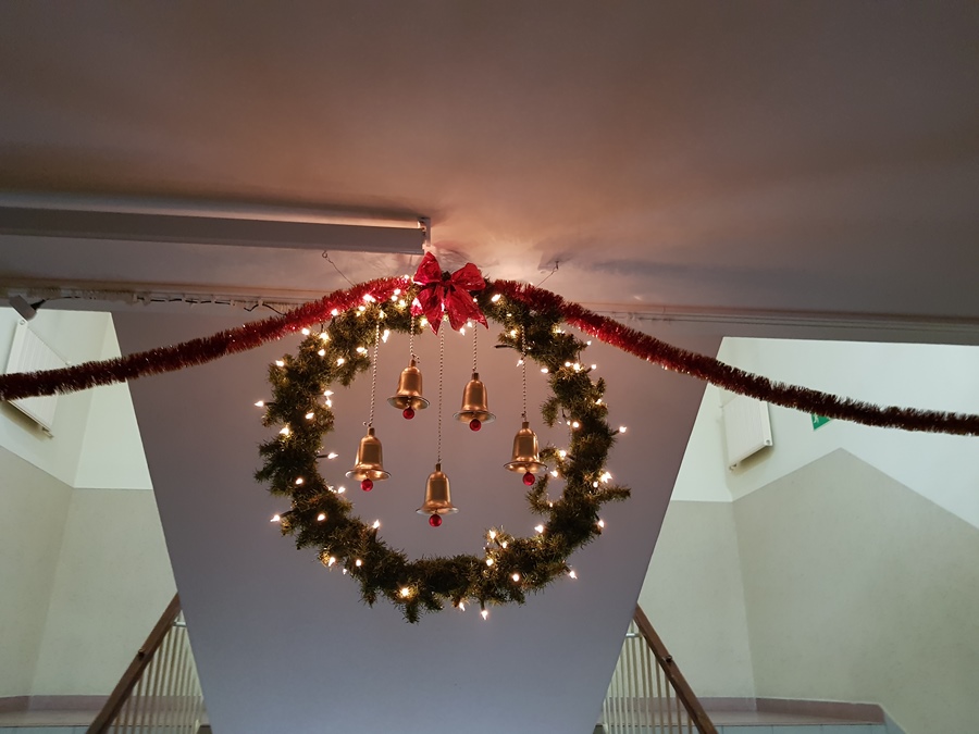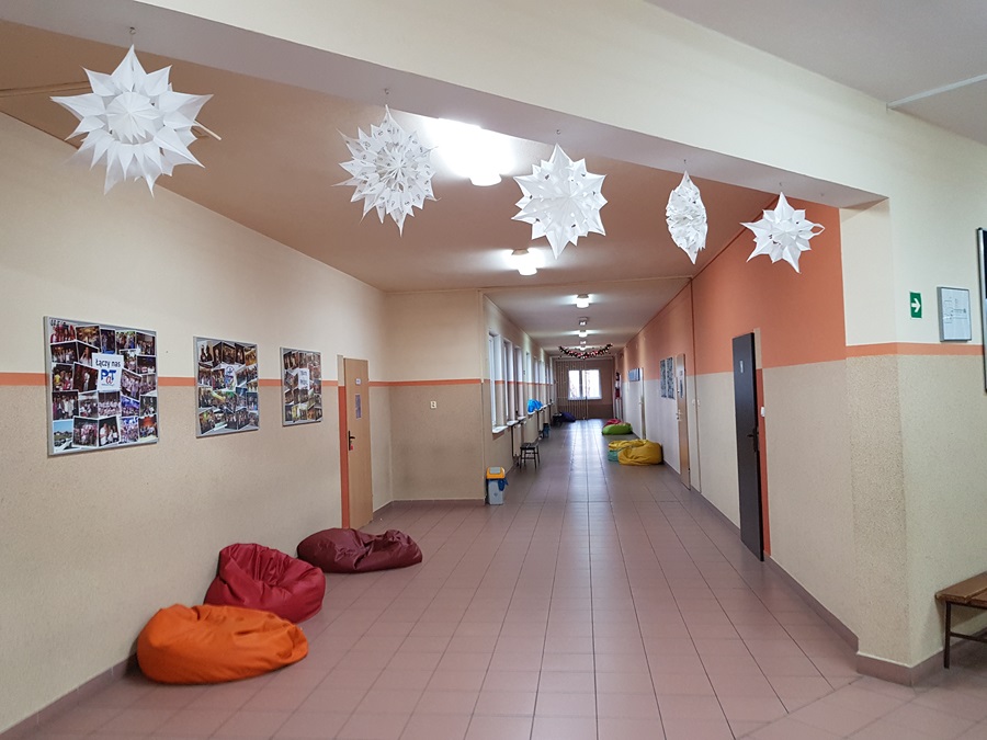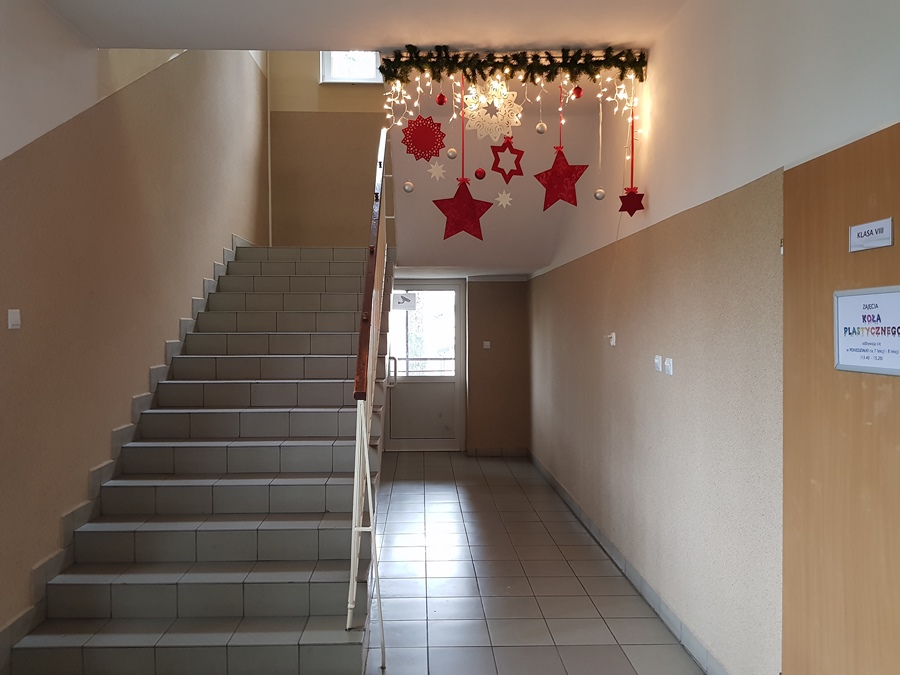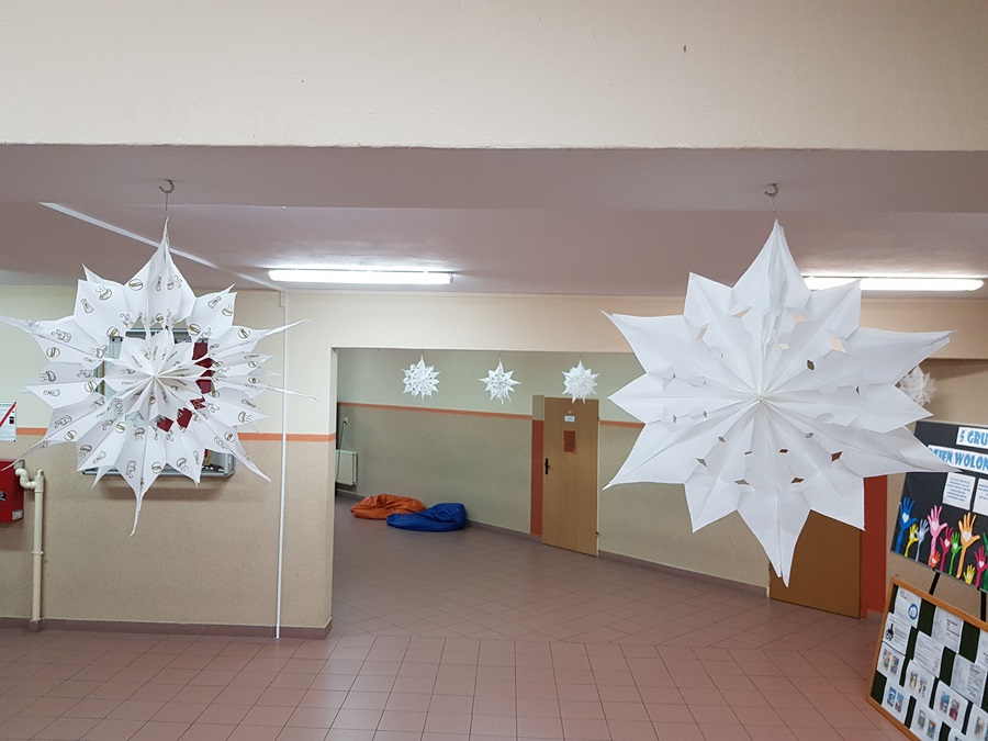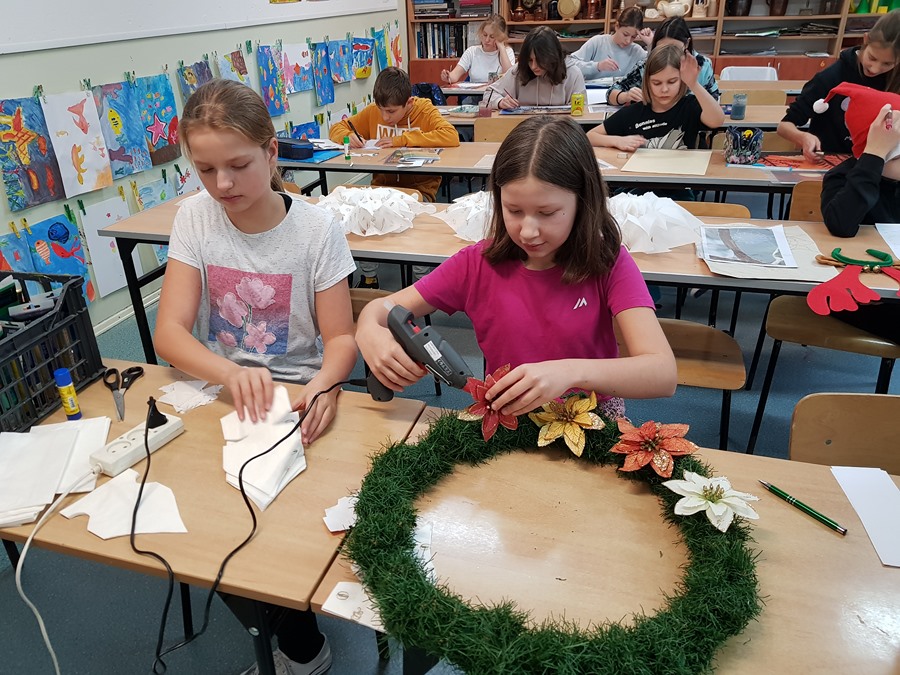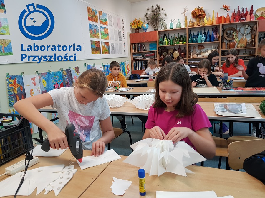 Uczniowie na zajęciach koła plastycznego pomagali w wykonywaniu dekoracji świątecznych w szkole. Skorzystano z pistoletu do klejenia na gorąco oraz zszywacza tapicerskiego otrzymanego w ramach programu Laboratoria Przyszłości.