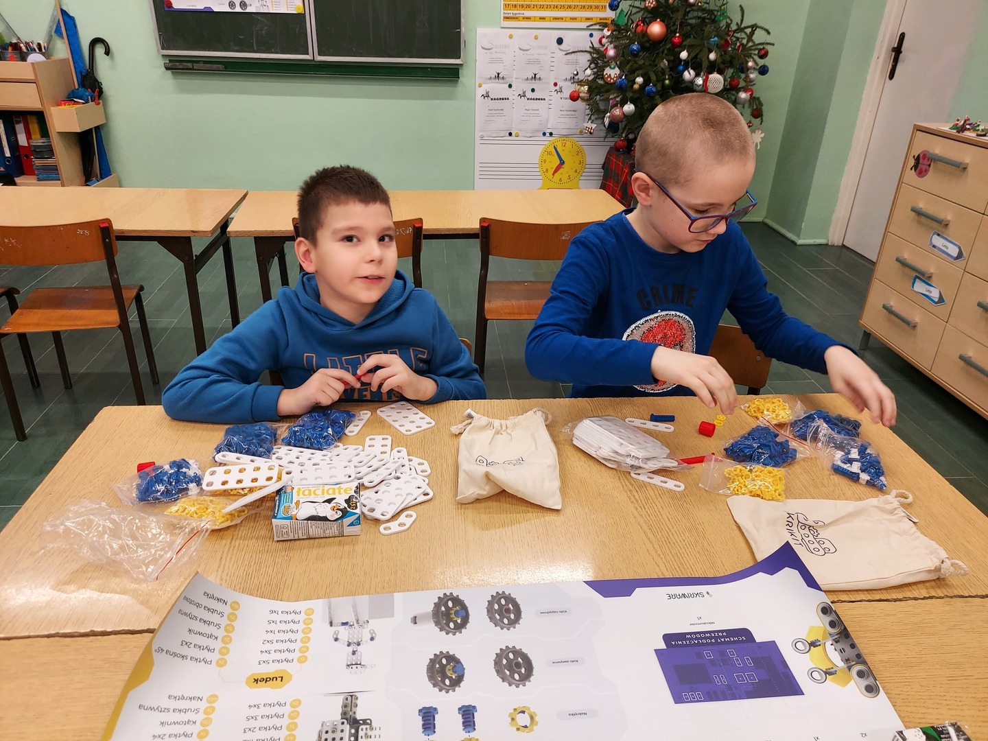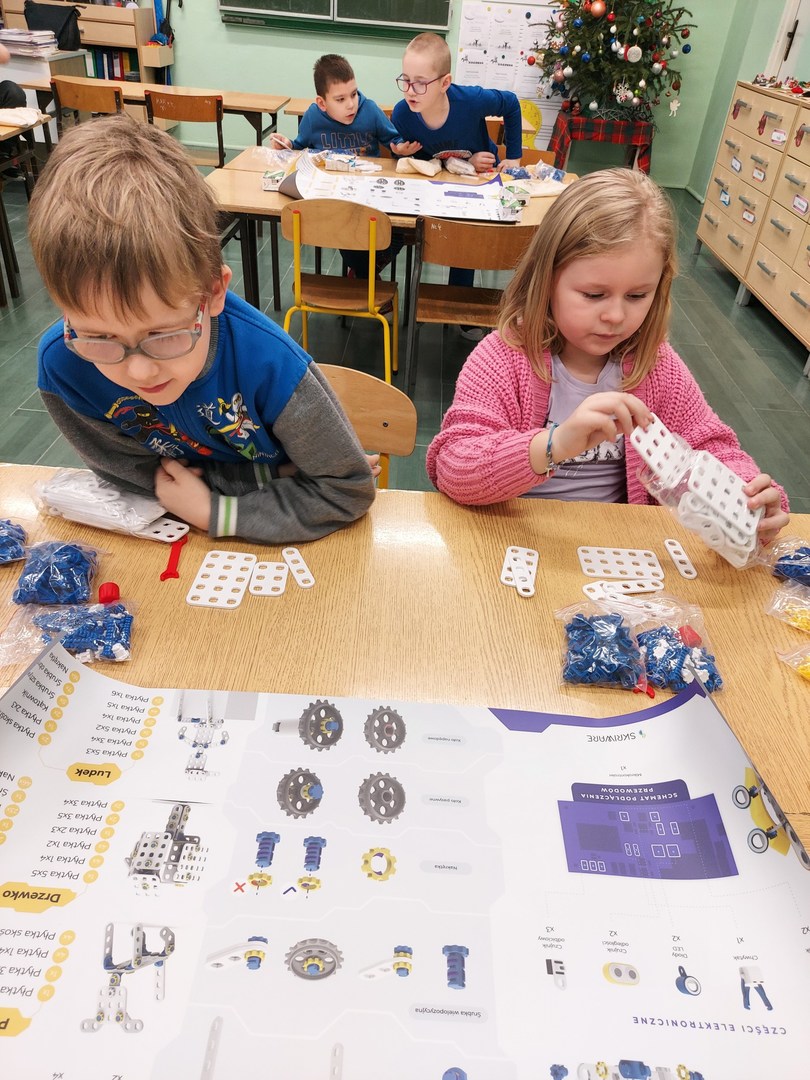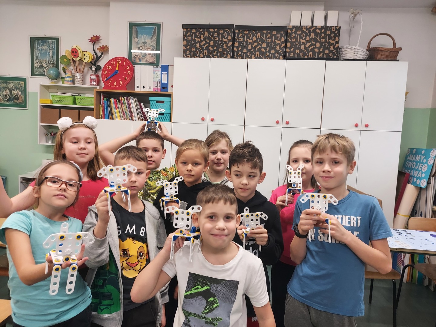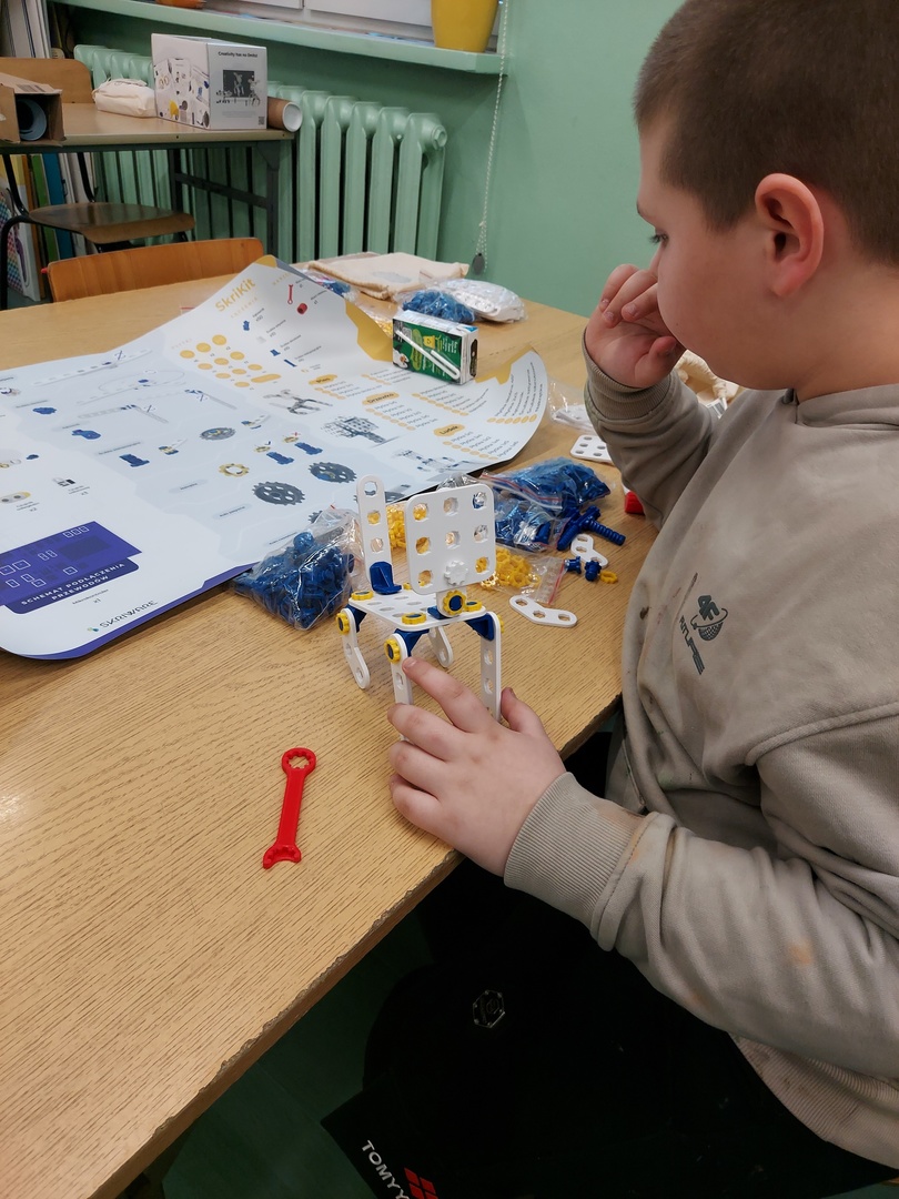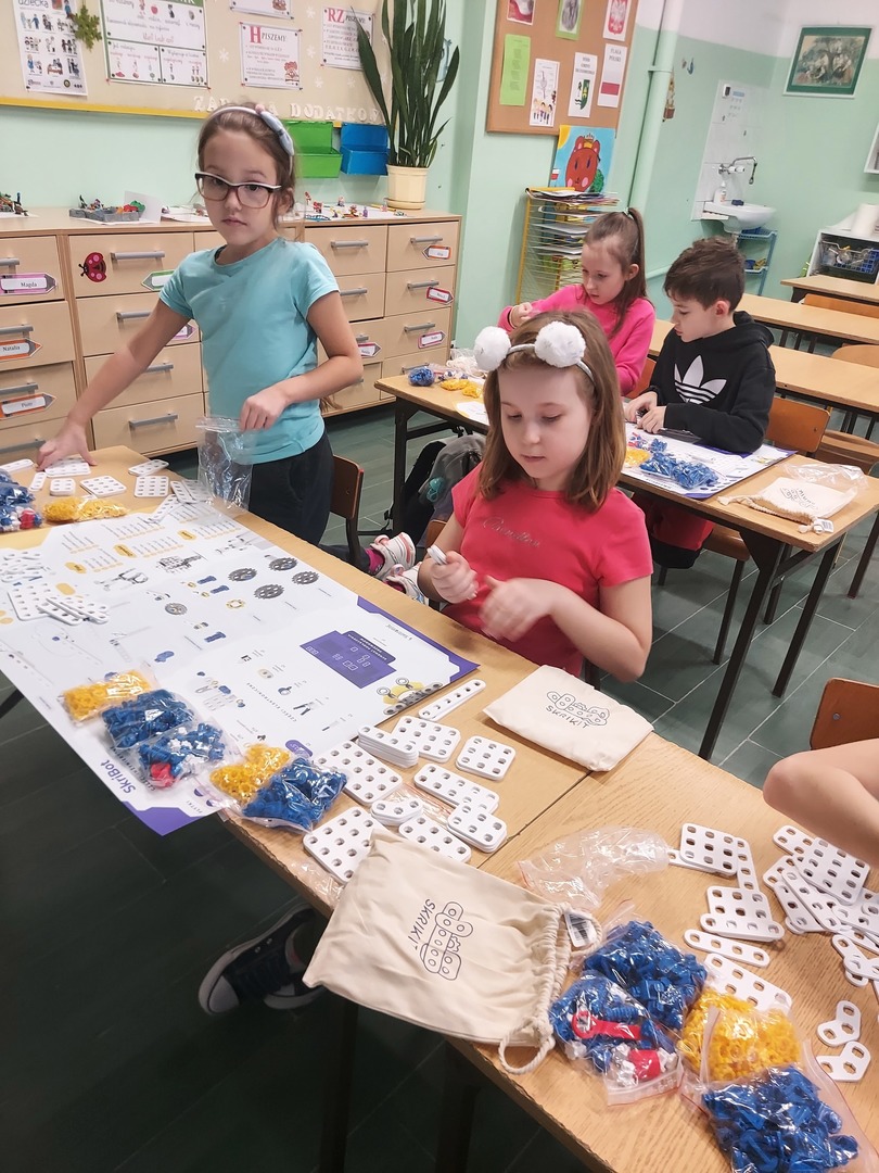 Uczniowie z klas I i II na zajęciach z programowania i robotyki wykorzystali edukacyjne klocki konstrukcyjne SkriKit zakupione w ramach projektu „Laboratoria przyszłości”, które nie tylko rozwijają umiejętności manualne, ale także myślenie i wyobraźnię przestrzenną uczniów oraz wprowadzają do zagadnienia algorytmów.