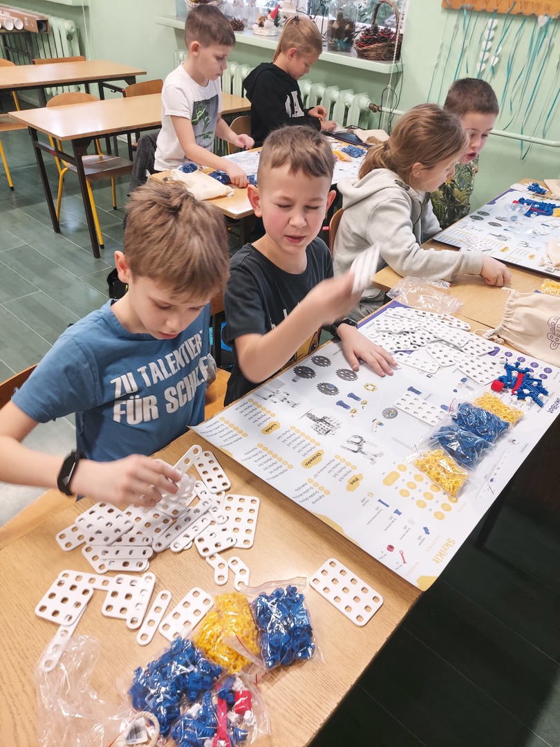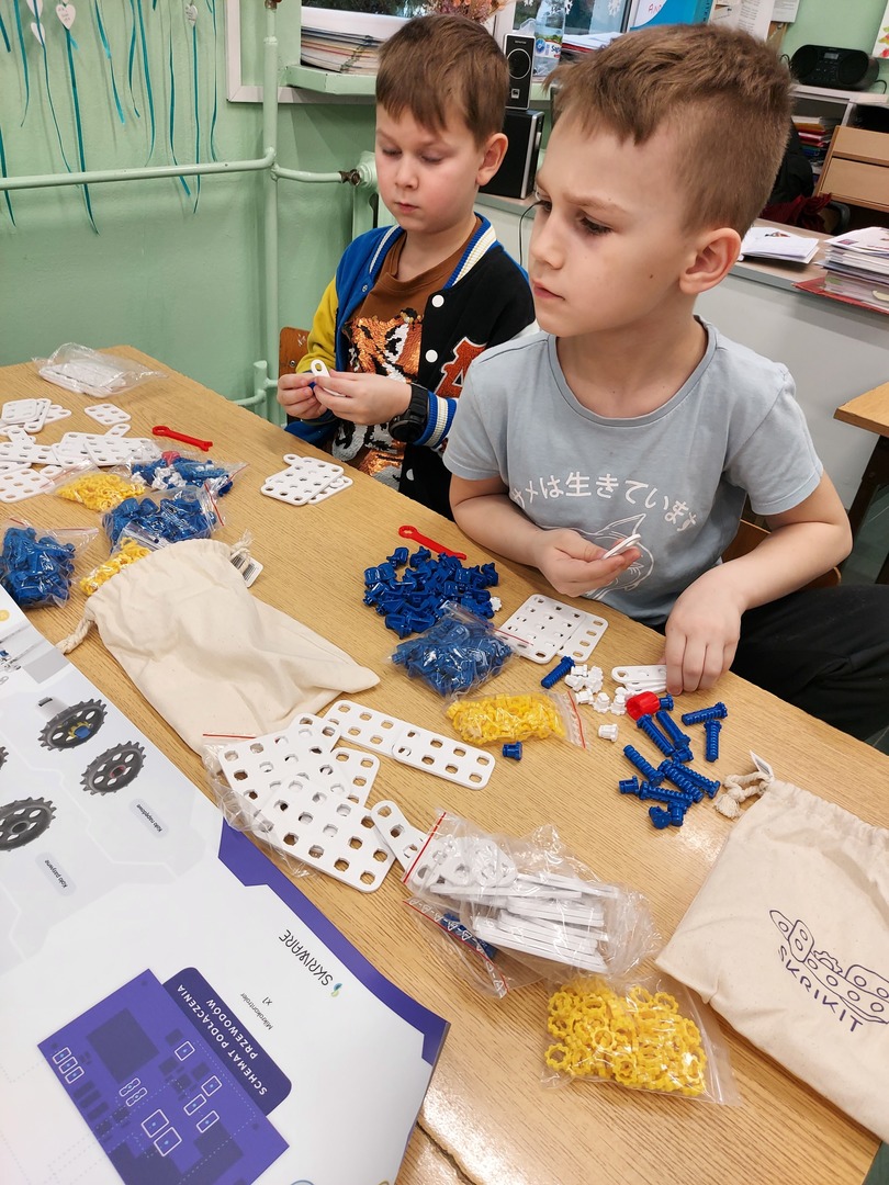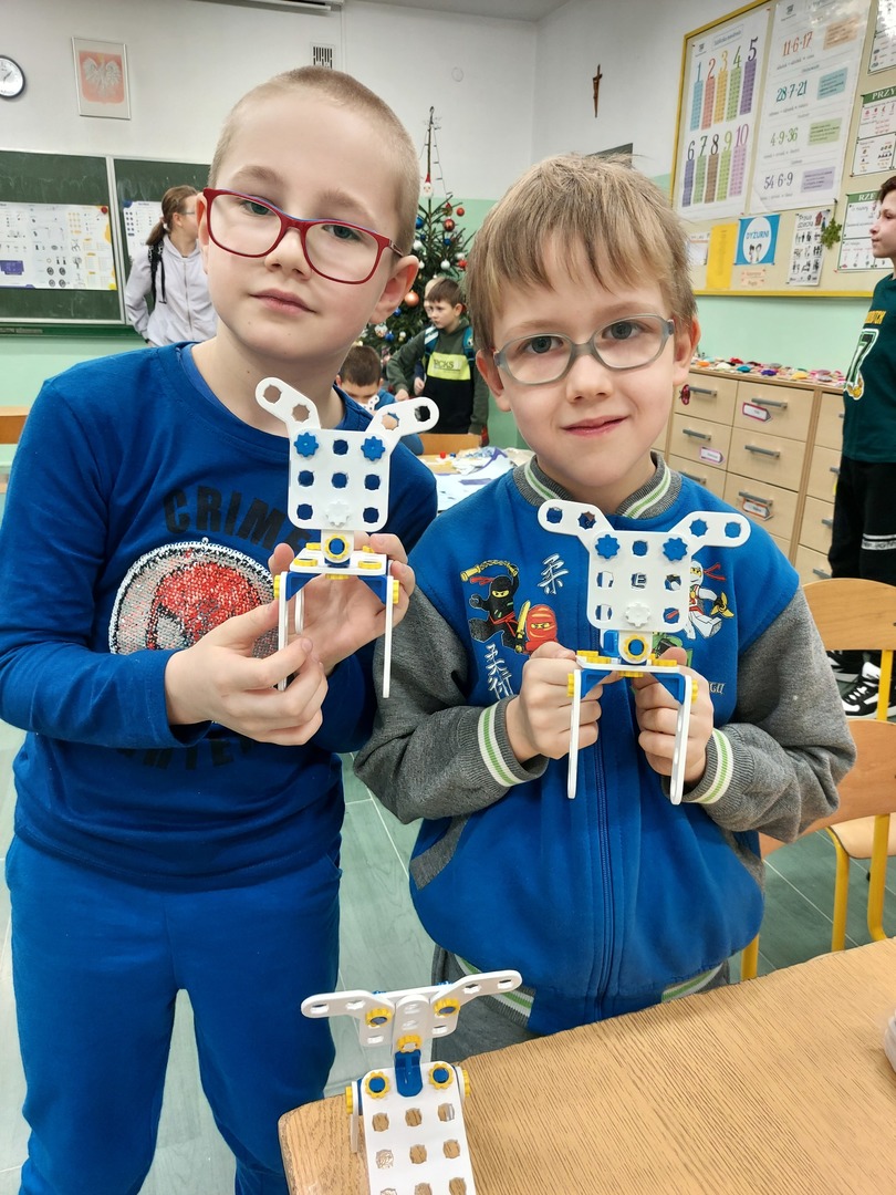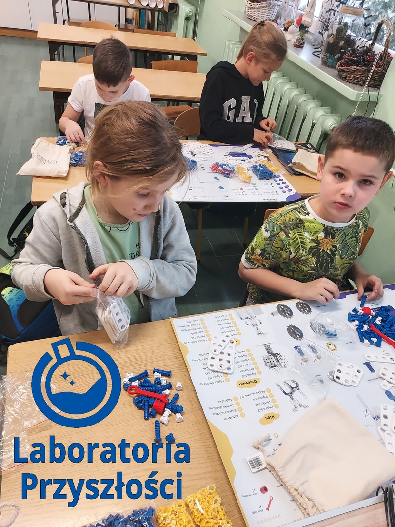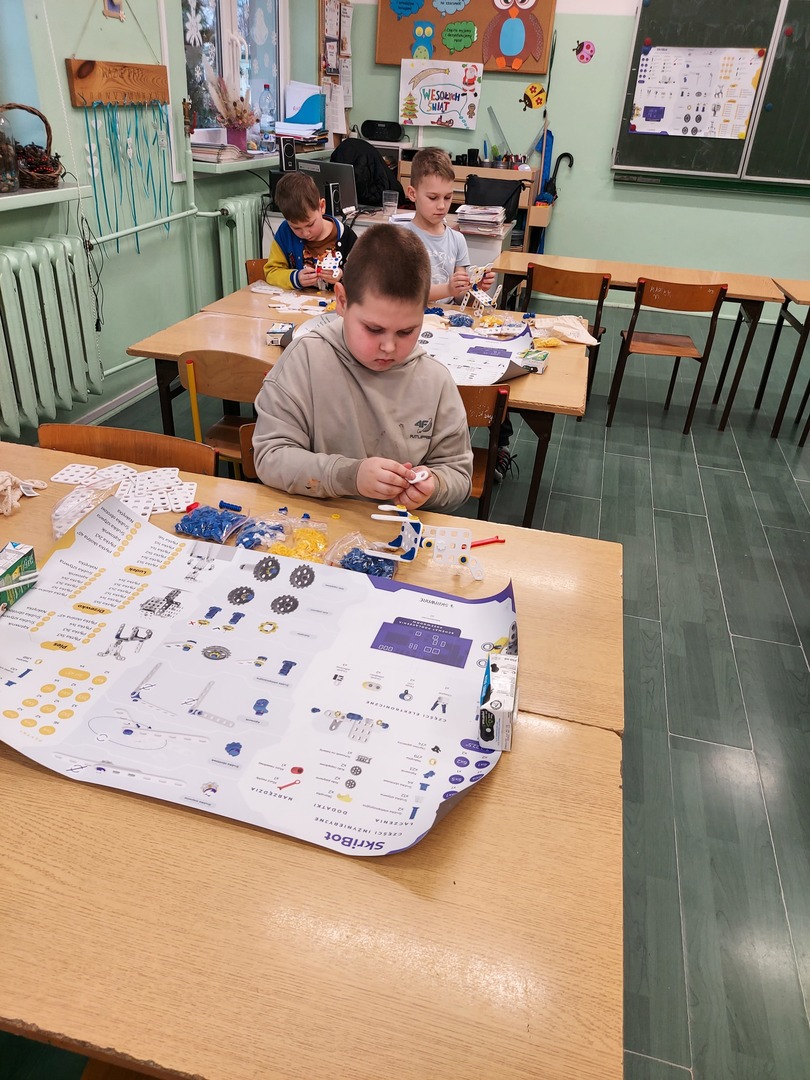 Uczniowie z klas I i II na zajęciach z programowania i robotyki wykorzystali edukacyjne klocki konstrukcyjne SkriKit zakupione w ramach projektu „Laboratoria przyszłości”, które nie tylko rozwijają umiejętności manualne, ale także myślenie i wyobraźnię przestrzenną uczniów oraz wprowadzają do zagadnienia algorytmów.