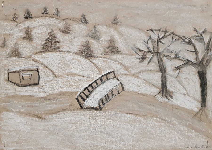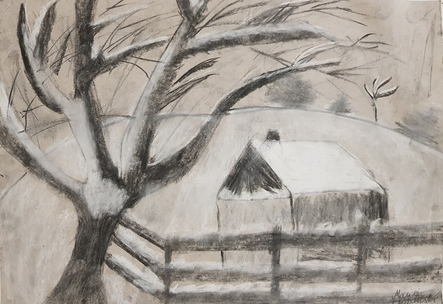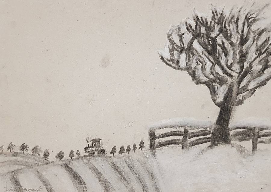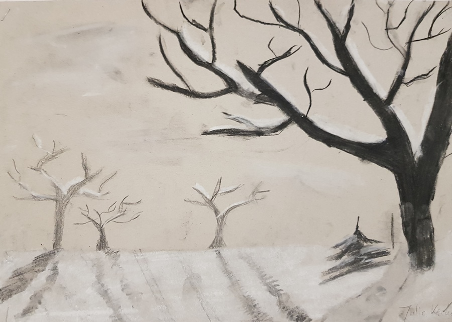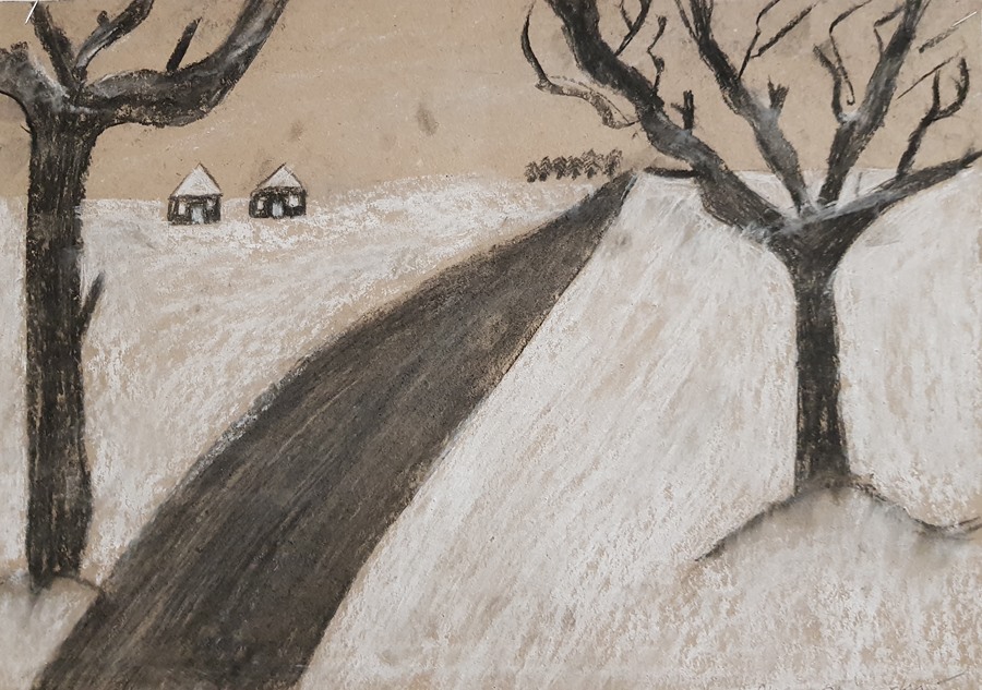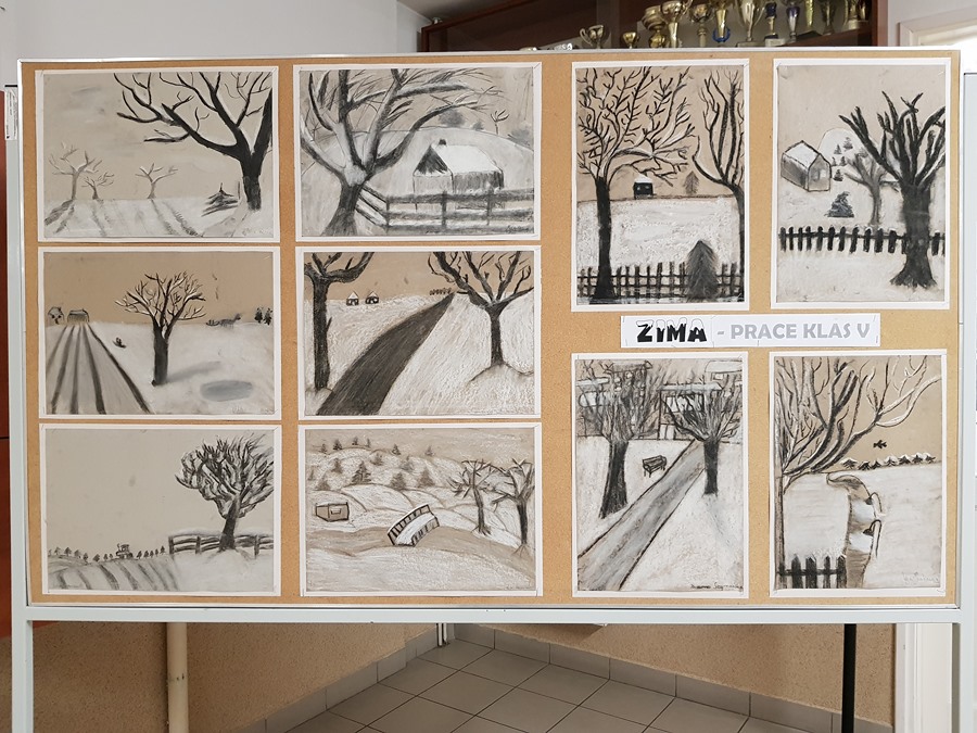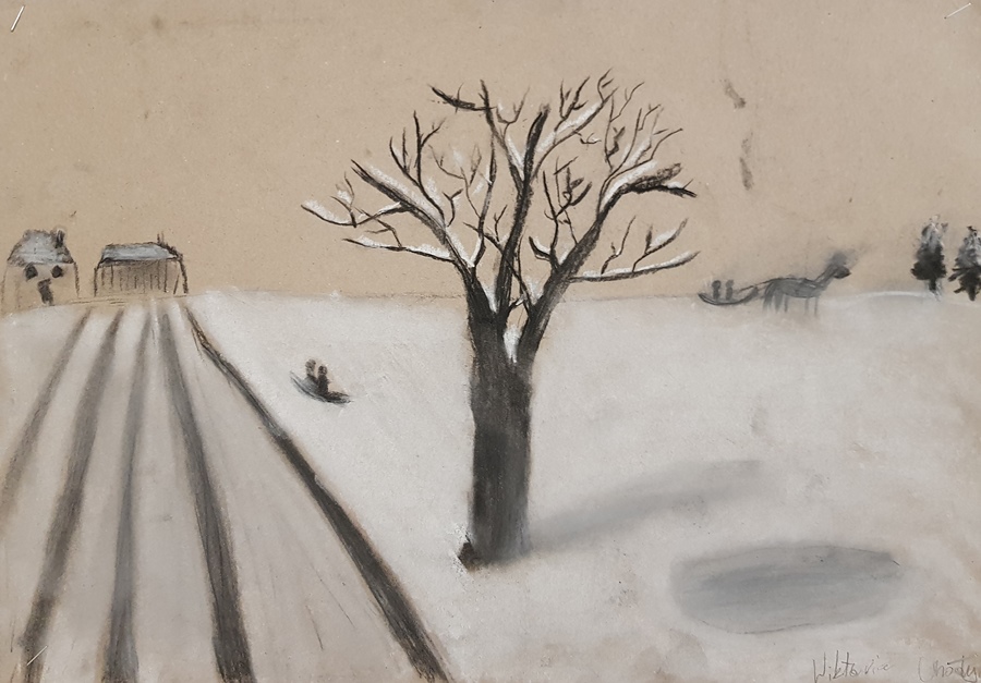 SZKOLNA GALERIA. "Zimowy pejzaż" - rysunki kredą i węglem uczniów z klas V