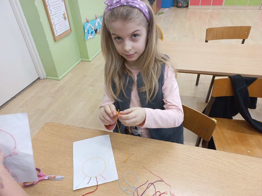 Uczniowie korzystając z materiałów, które szkoła otrzymała w ramach programu Laboratoria Przyszłości (mulina, igły, nożyczki) wyszyli swoje pierwsze serca i słoneczka.