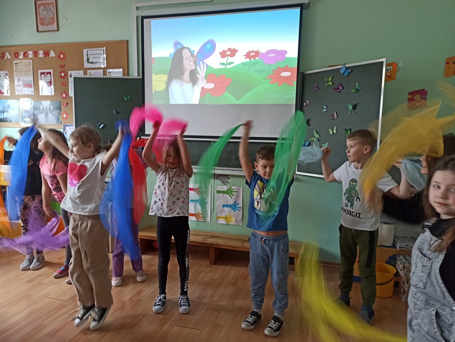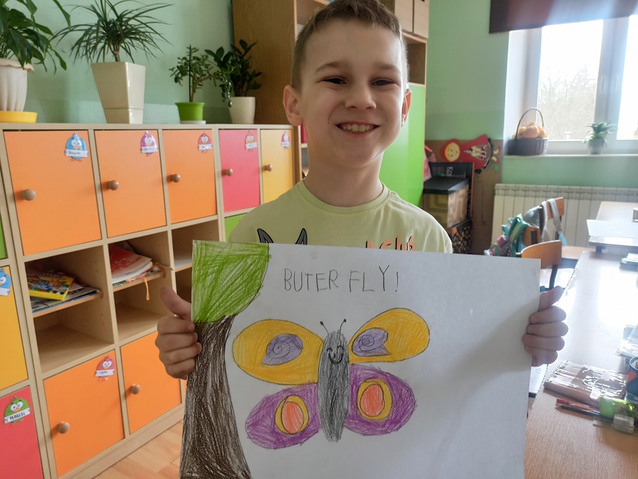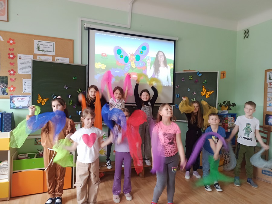 Uczniowie klasy Ib na zajęciach języka angielskiego obchodzili dzień motyla. Uczestniczyli w zabawach tematycznych, dzięki którym dowiedzieli się, jaka jest ich budowa oraz zapoznali się z cyklem życia motyli. Tego dnia uczniowie pracowali w grupach, doskonaląc umiejętność współpracy i wykazując się swoimi zdolnościami artystycznymi. Nie zabrakło również wesołego tańca przy piosence „The Butterfly dance”, przy której uczniowie świetnie się bawili.