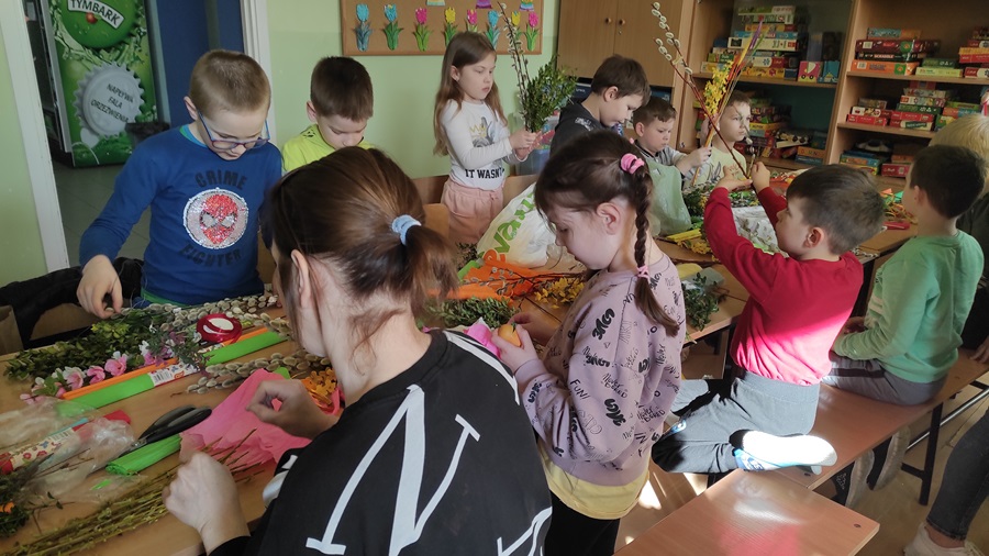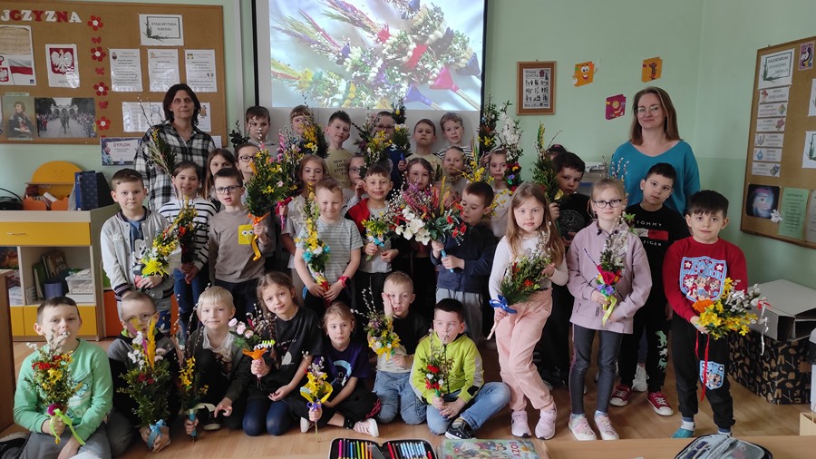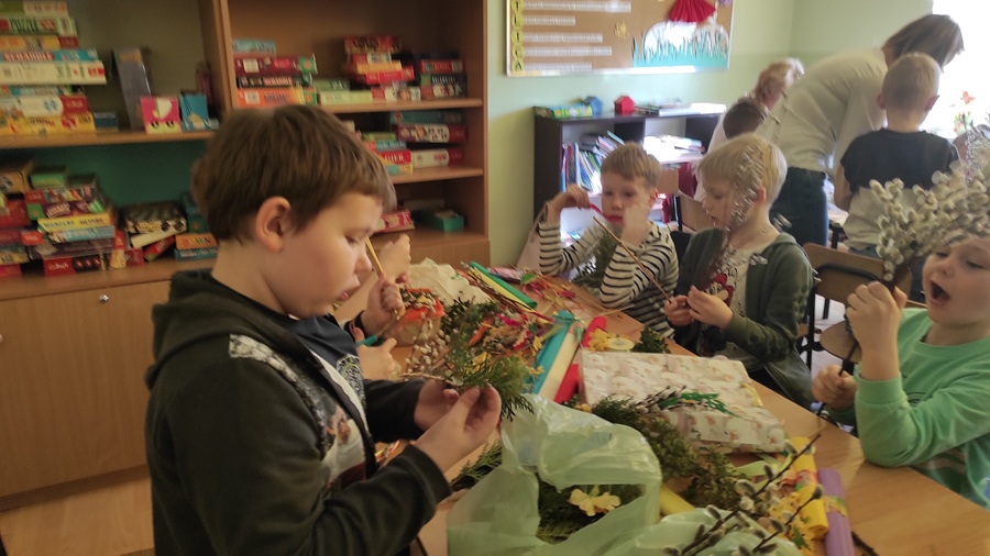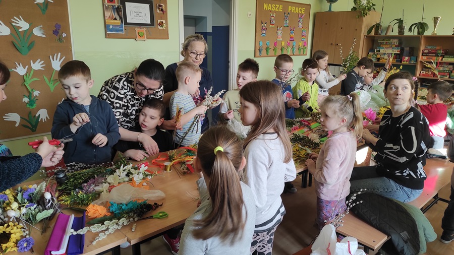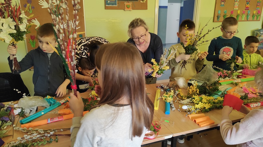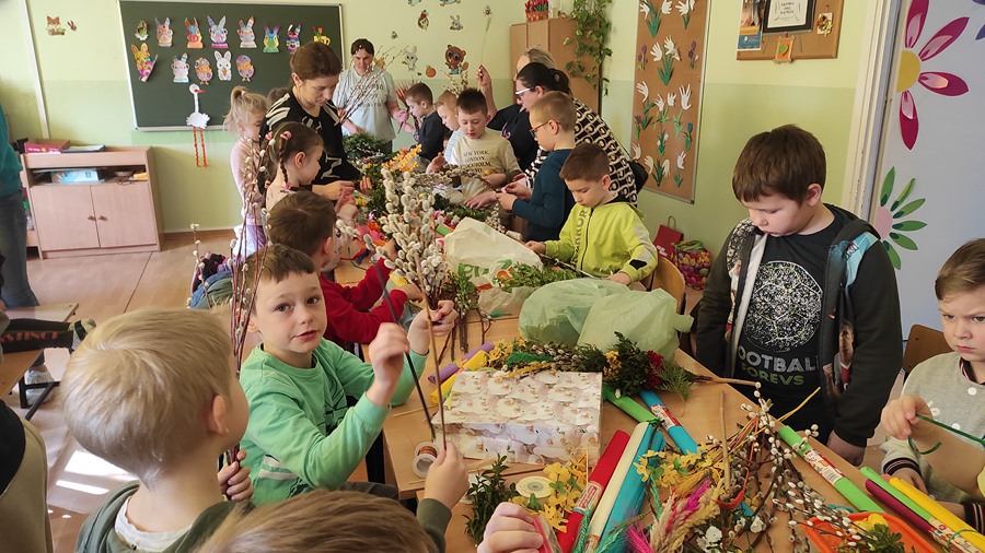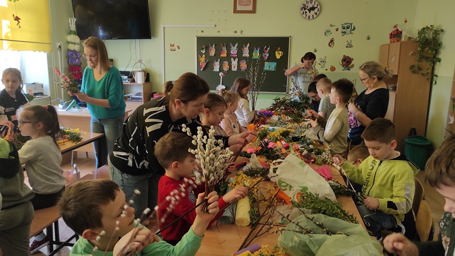 Z okazji zbliżających się Świąt Zmartwychwstania Pańskiego 30 marca uczniowie klas I uczestniczyli w warsztatach, na których wykonywali palmy wielkanocne. Zajęcia miały charakter praktyczny. Głównym celem było kultywowanie tradycji i zwyczajów związanych ze świętami wielkanocnymi. Była to również okazja do aktywizacji dzieci, integracji międzypokoleniowej oraz kreatywnego spędzania czasu. Serdeczna i miła atmosfera podczas tego spotkania wprowadziła nas w przedświąteczny nastrój.