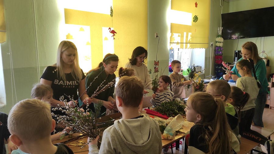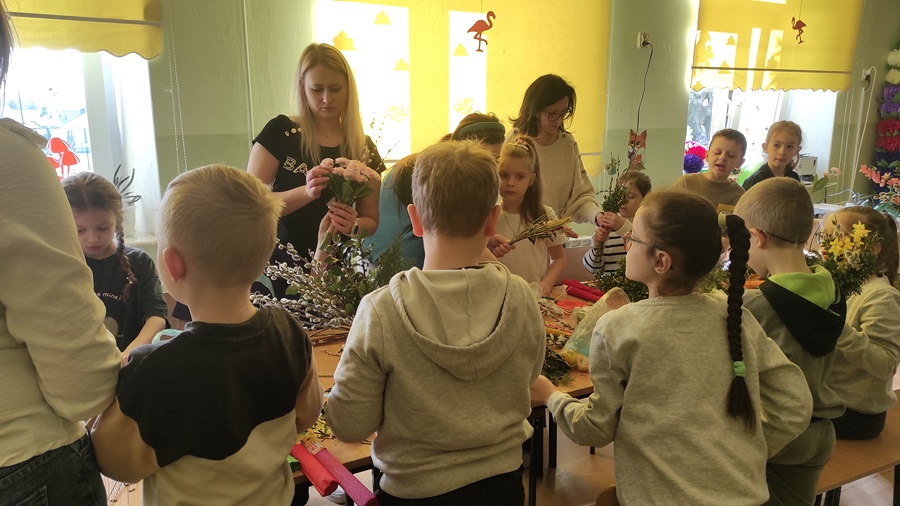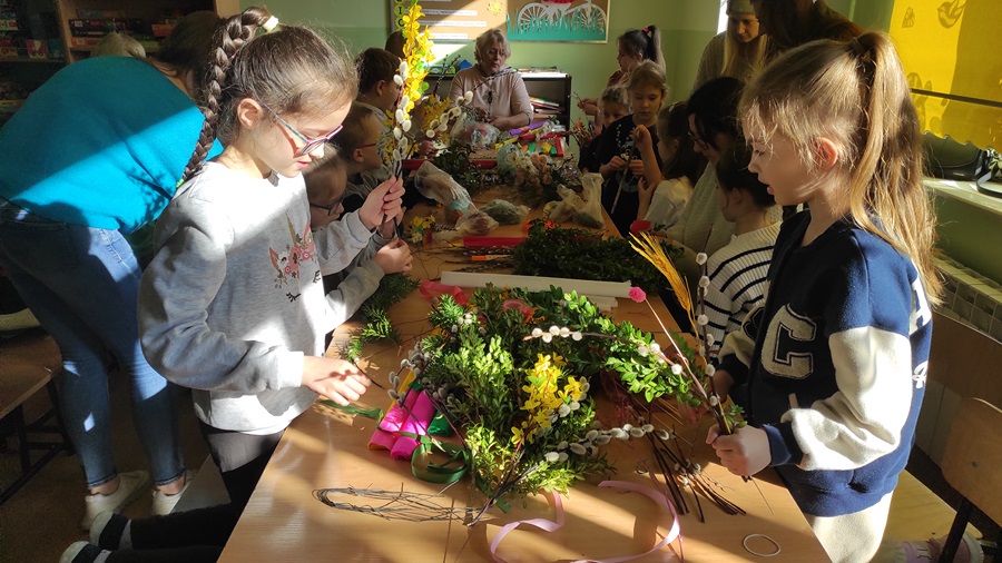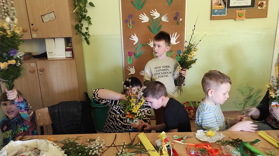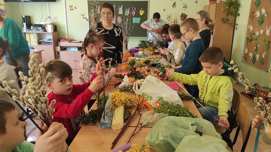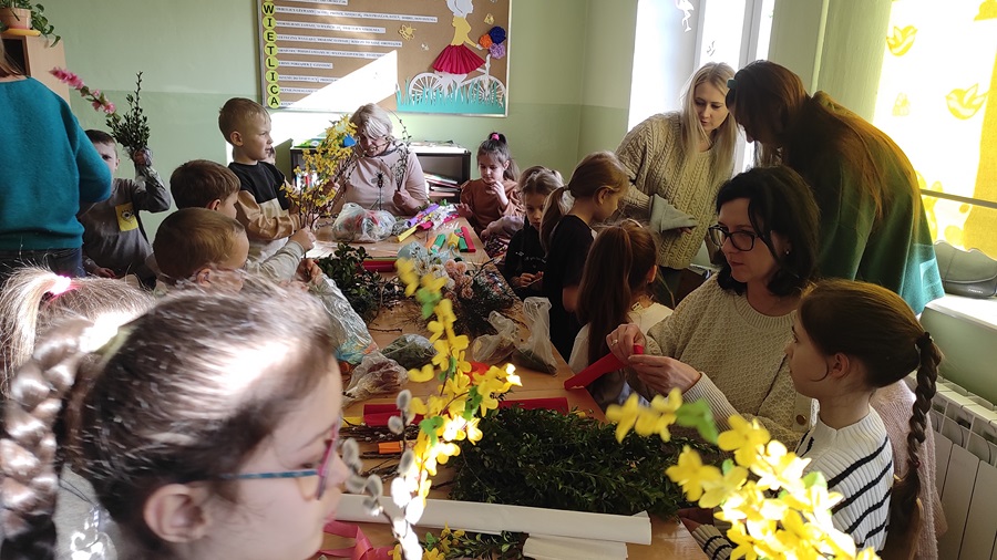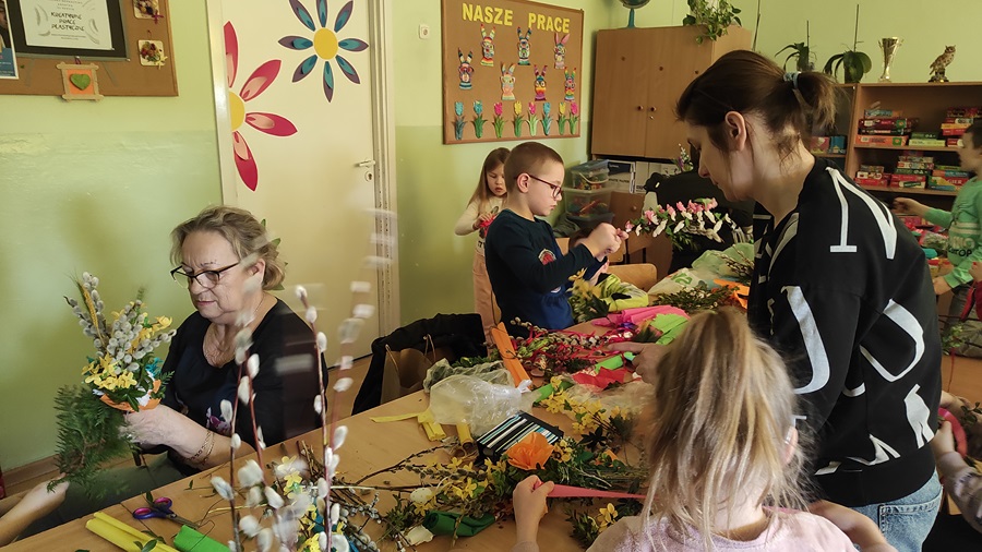 Z okazji zbliżających się Świąt Zmartwychwstania Pańskiego 30 marca uczniowie klas I uczestniczyli w warsztatach, na których wykonywali palmy wielkanocne. Zajęcia miały charakter praktyczny. Głównym celem było kultywowanie tradycji i zwyczajów związanych ze świętami wielkanocnymi. Była to również okazja do aktywizacji dzieci, integracji międzypokoleniowej oraz kreatywnego spędzania czasu. Serdeczna i miła atmosfera podczas tego spotkania wprowadziła nas w przedświąteczny nastrój.