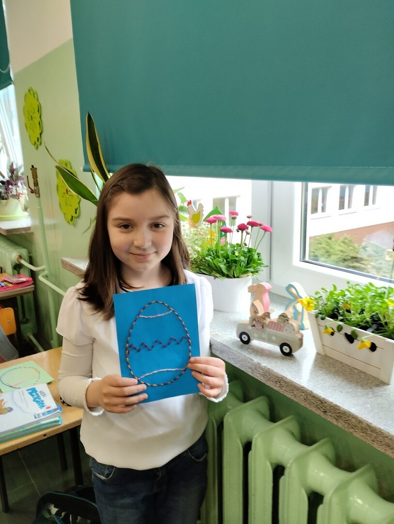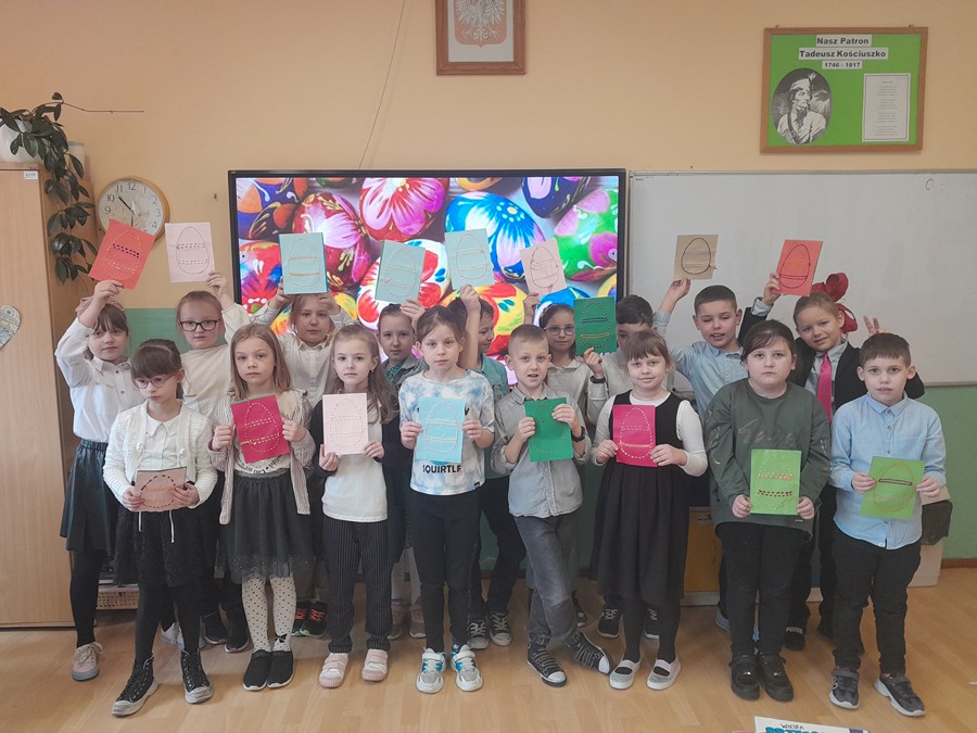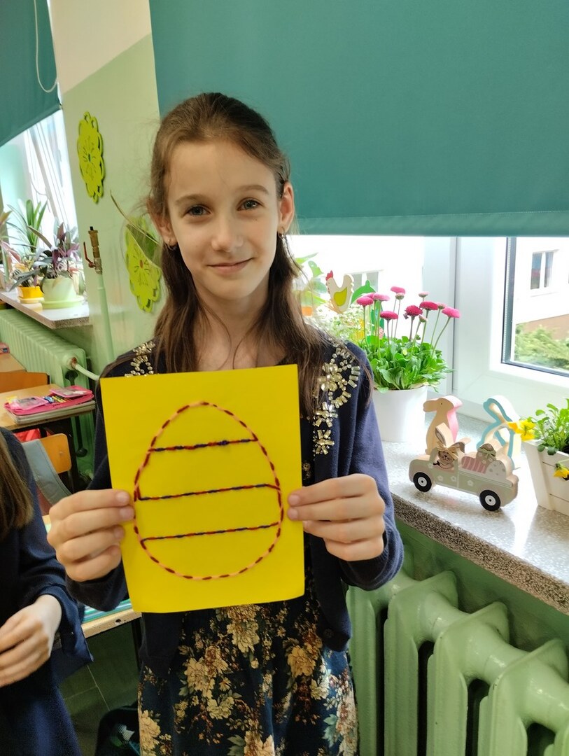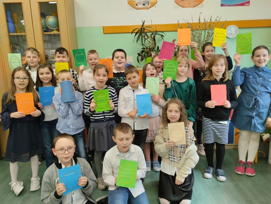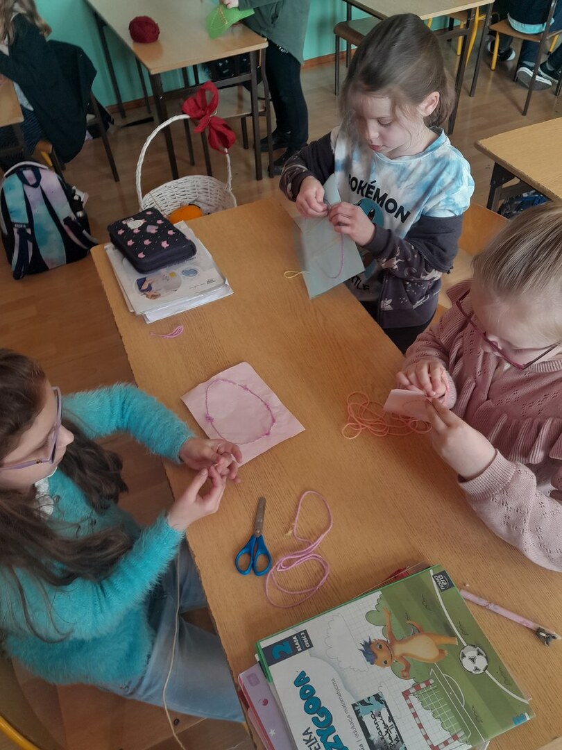 Ulubionym przedświątecznym zajęciem dzieci jest przygotowywanie pisanek, kraszanek, wydrapywanek czy oklejanek. Uczniowie klas drugich wzięli udział w świątecznych zajęciach technicznych, w trakcie których wyszywali na papierze kształty jajek i różne wzory kolorowymi włóczkami, zakupionymi w ramach Programu „Laboratoria Przyszłości”.