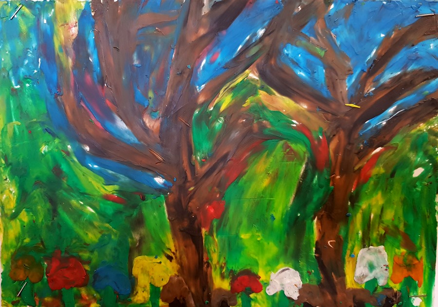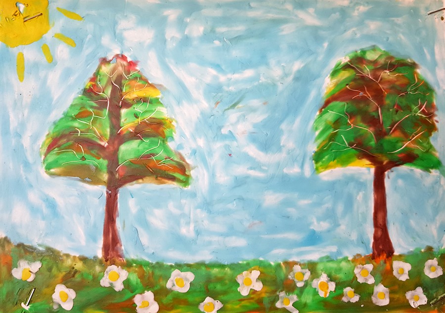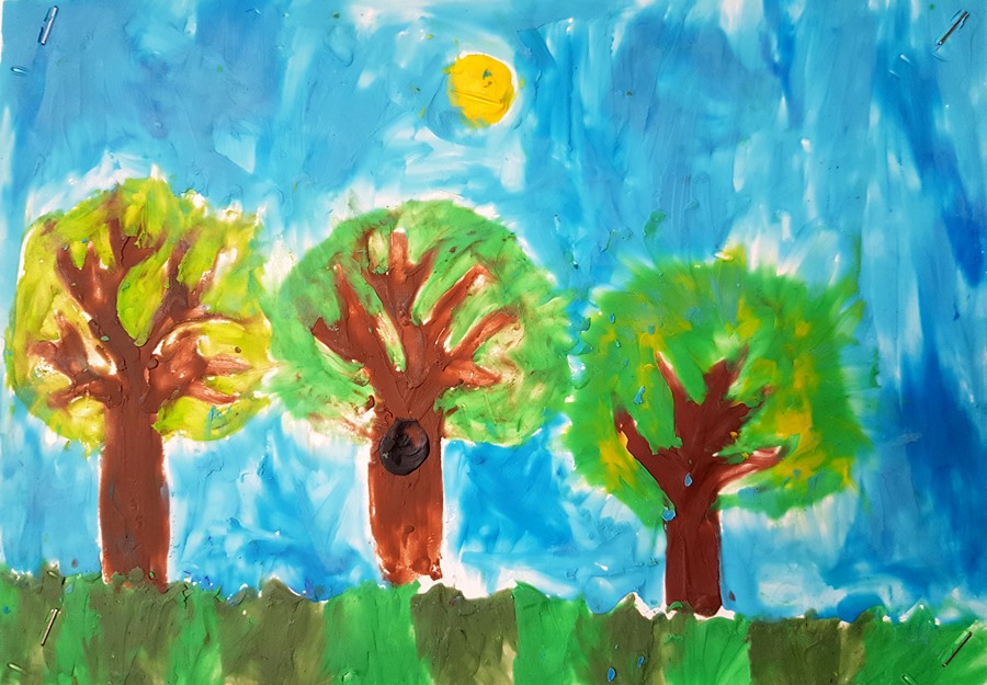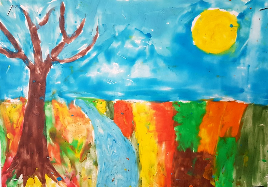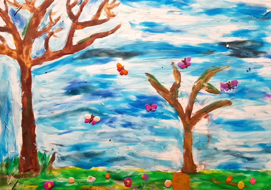 SZKOLNA GALERIA. "Pejzaż wiosenny" - prace plastyczne uczniów z klas V malowane plasteliną