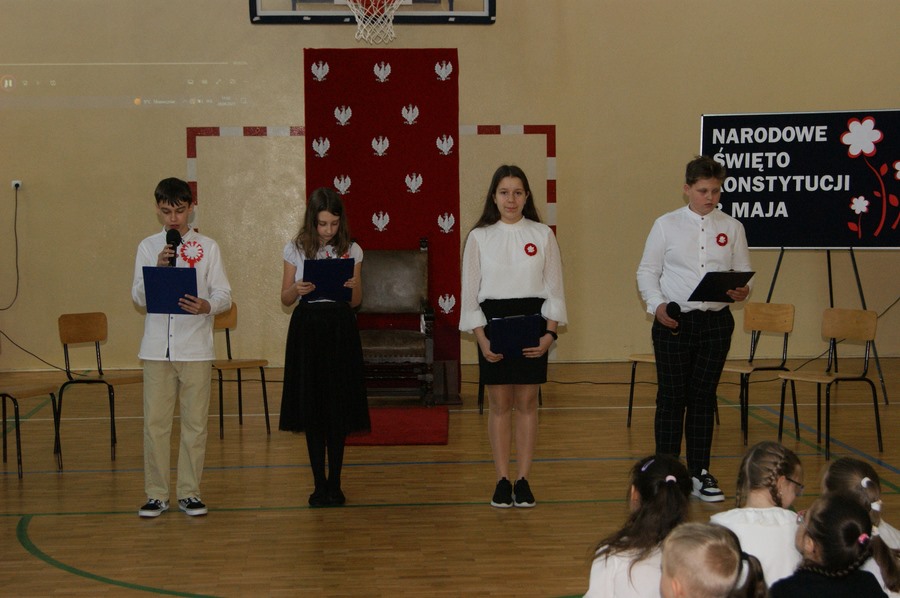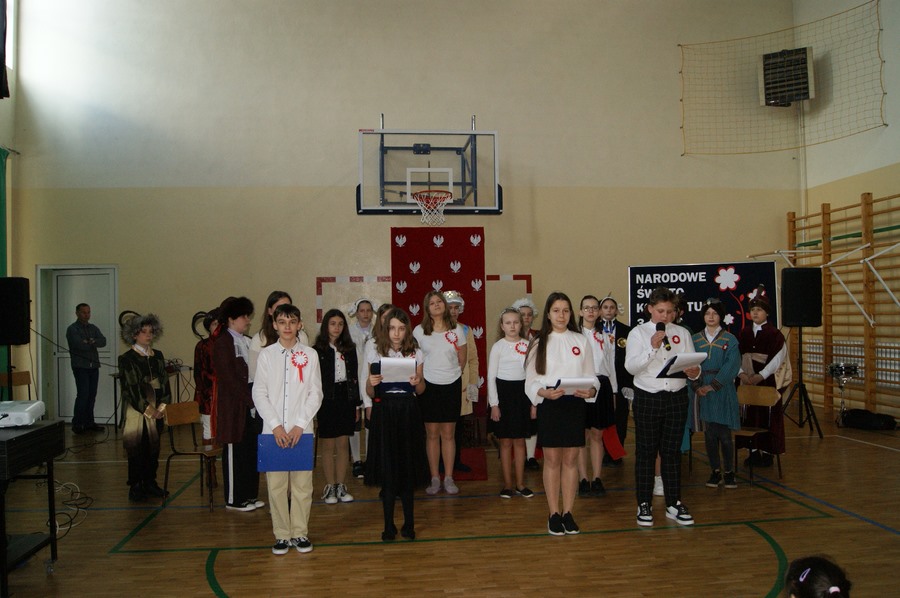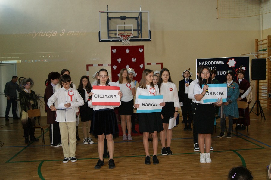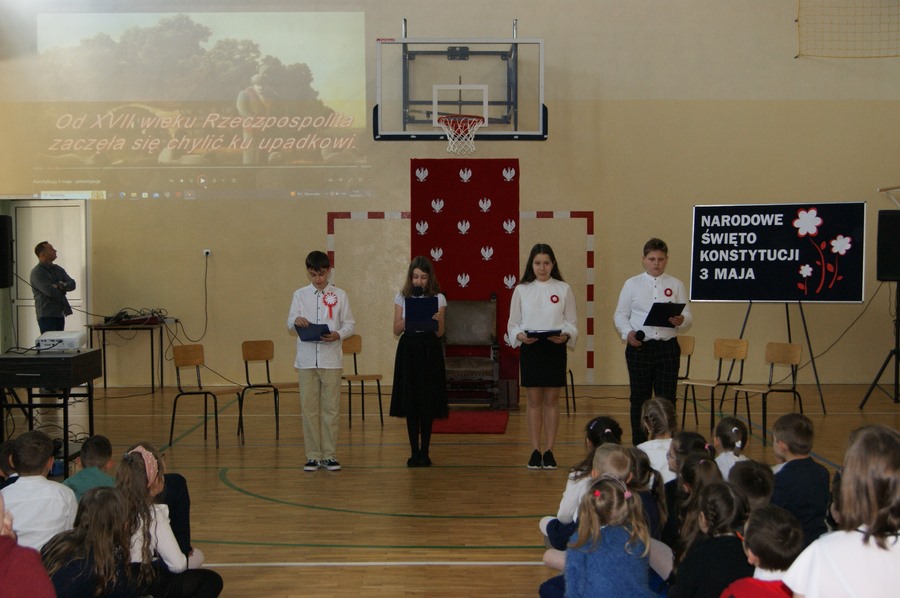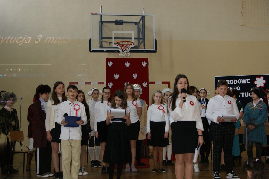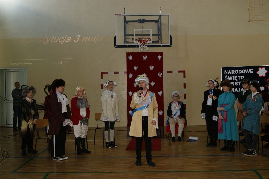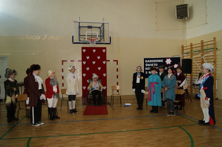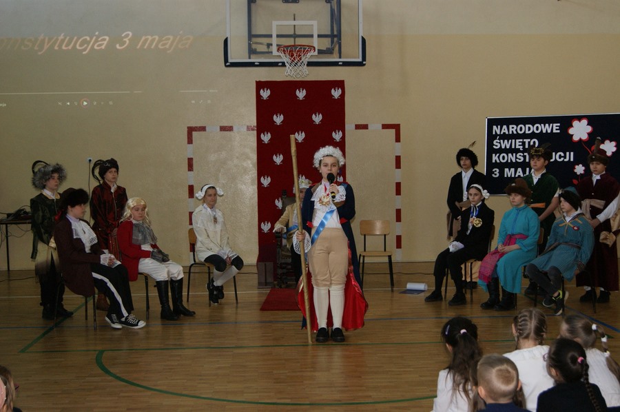 Wprawdzie 28 kwietnia 2023 r., ale wraz ze zbliżającą się 232.rocznicą ważnego dla naszego kraju wydarzenia obchodziliśmy NARODOWE ŚWIĘTO KONSTYTUCJI 3 MAJA. Apel przygotowali uczniowie z klas Vb i VI, którzy wcielili się w postacie historyczne. Dzięki montażowi słowno - muzycznemu, strojom z epoki – z czasów stanisławowskich - i krótkiemu filmowi przenieśli siebie oraz swoje koleżanki i swoich kolegów z poszczególnych klas do roku 1791, gdy na Zamku Królewskim w Warszawie obradował sejm, który do historii przeszedł pod nazwą Sejmu Czteroletniego lub inaczej - Wielkiego.
