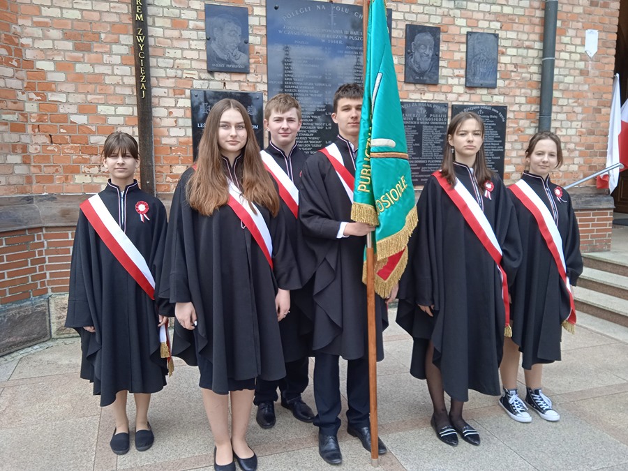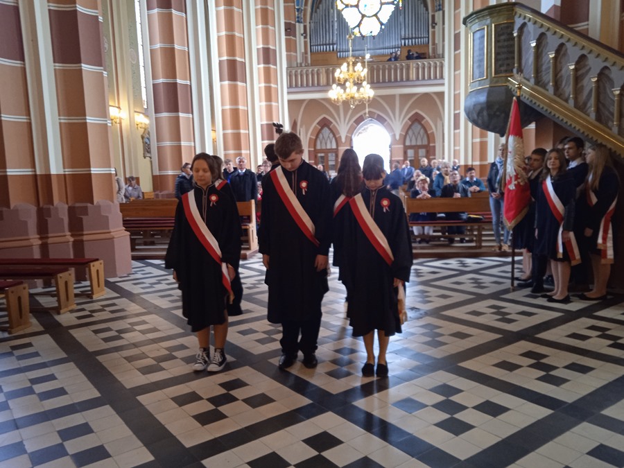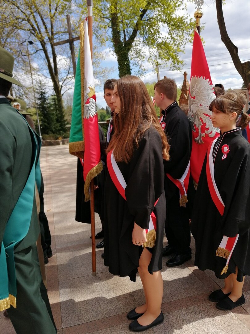 Uczniowie reprezentujący naszą szkołę w poczcie sztandarowym uczestniczyli w parafialnych obchodach kolejnej rocznicy Konstytucji 3 Maja. Tego dnia o godz. 12:00 wzięliśmy udział w uroczystej Mszy św. sprawowanej przez ks. proboszcza Z. Żebrowskiego, na której modliliśmy się za Ojczyznę za wstawiennictwem Matki Bożej Królowej Polski. Obecne były również władze naszej gminy, strażacy, poczty sztandarowe z sąsiednich szkół oraz społeczność naszej gminy.