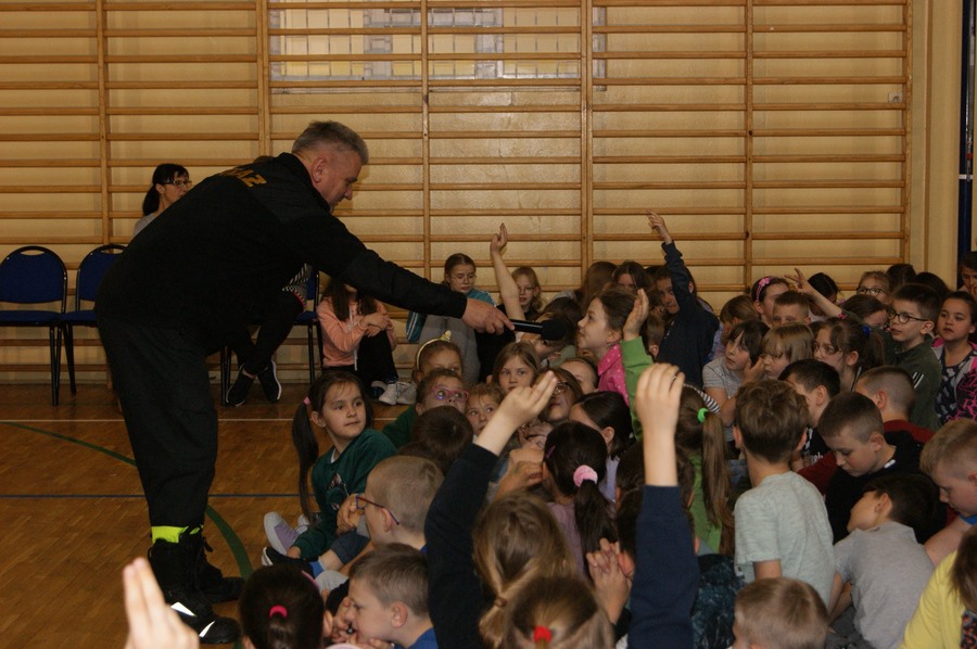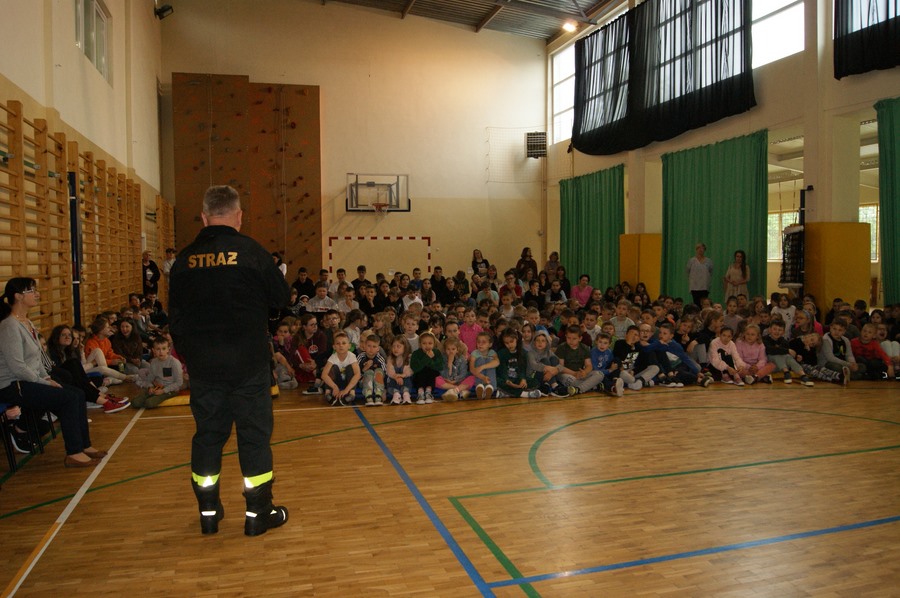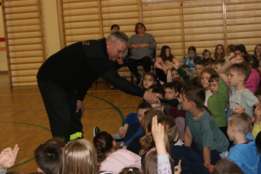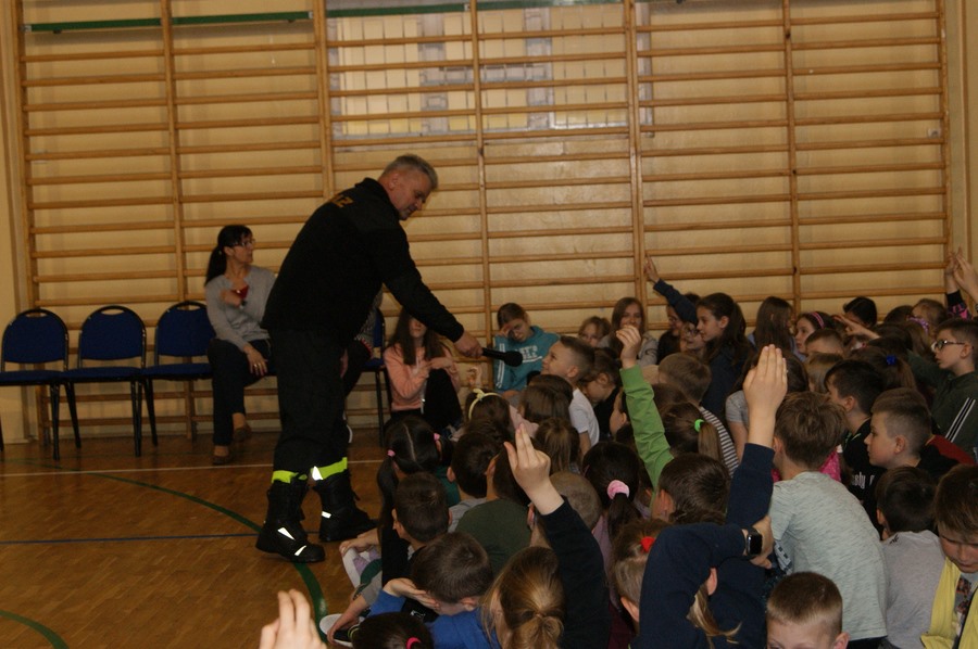 Podczas spotkania strażak w bardzo interesujący sposób opowiedział uczniom klas I-VIII o swojej pracy oraz przekazał wiele cennych informacji na temat przestrzegania zasad bezpieczeństwa. Poinformował także o tym w jakich okolicznościach można wezwać straż pożarną. Uczniowie dowiedzieli się również, że strażacy nie tylko gaszą pożary, ale też usuwają skutki wypadków samochodowych, pomagają w czasie powodzi, sprzątają połamane przez wichury drzewa, a nawet ratują zwierzęta.