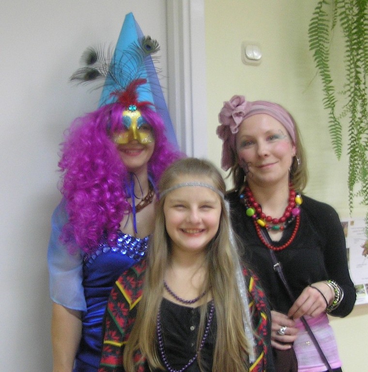 Wspólna zabawa rozpoczęła się wróżbami. W tym roku naszym szkolnym wróżkom (dało się też zauważyć wróżbitę) pomogły również mamy. Wróżbiarki w oszałamiających barwami strojach i fascynujących makijażach przepowiadały (przeważnie) wspaniałą przyszłość. Najpierw odwiedziły wszystkie klasy i znajdujących się tam uczniów oraz nauczycieli. Potem zagościły na poczcie, w Urzędzie Gminy i na Policji. Wszyscy, którym została przepowiedziana świetlana przyszłość, byli bardzo zachwyceni i odprężeni, co ułatwiło im dalszą pracę tego dnia i z pewnością poprawiło nastrój.