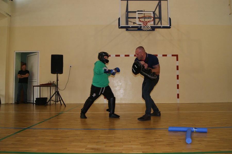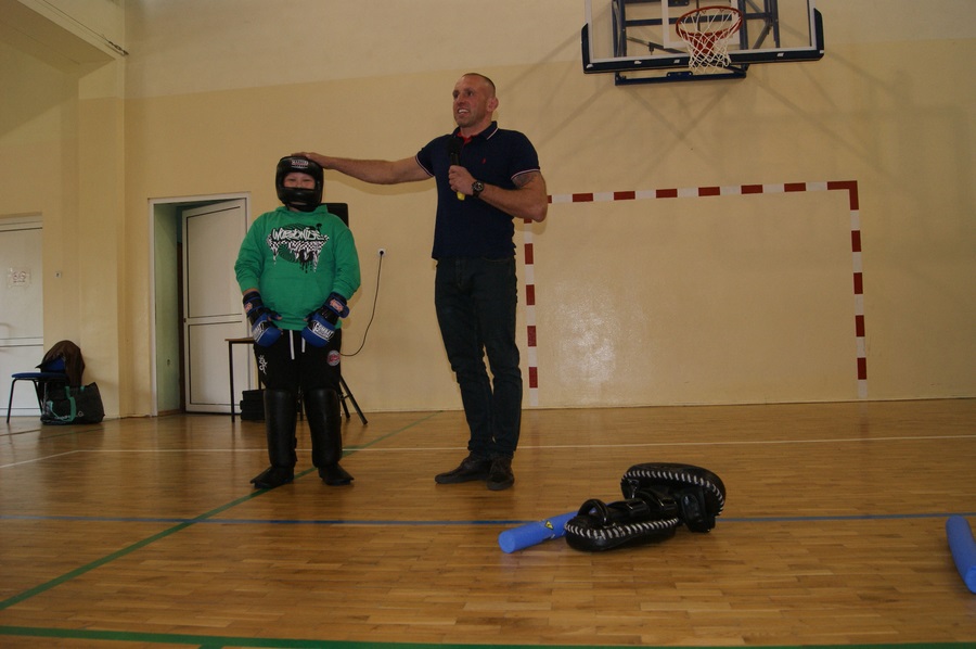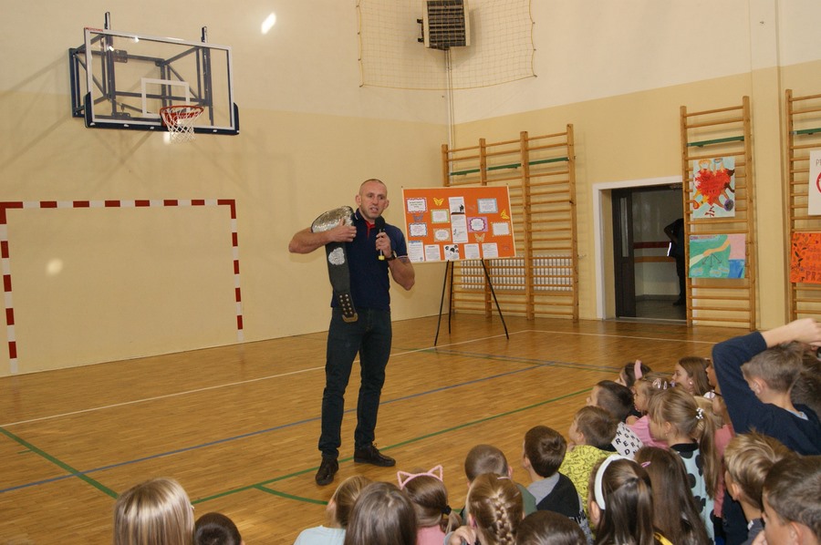 Słowa pani mediator potwierdził mistrz walk, mówiąc, że żaden sportowiec nie wykorzystuje swoich umiejętności do złych celów w życiu prywatnym. Mieliśmy możliwość obejrzenia stroju do walki oraz zdobytego pasa mistrzowskiego. Pan Marcin zaprezentował nam także podstawowe elementy walki. Potem został zasypany gradem pytań. Po spotkaniu mogliśmy dostać autograf oraz zrobić zdjęcia z mistrzem.