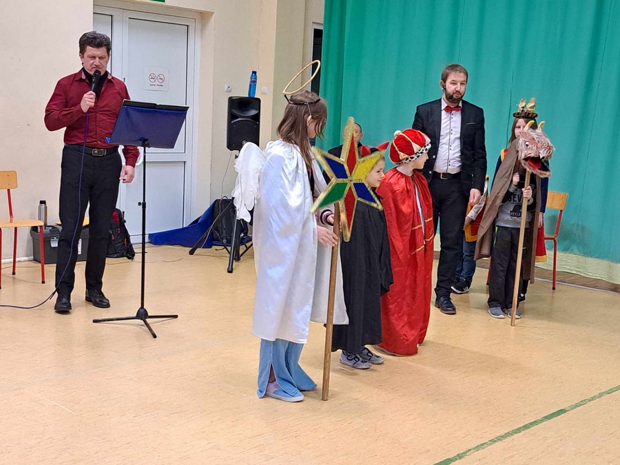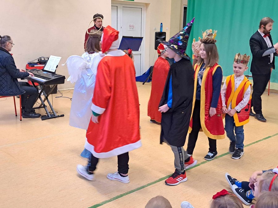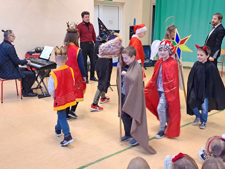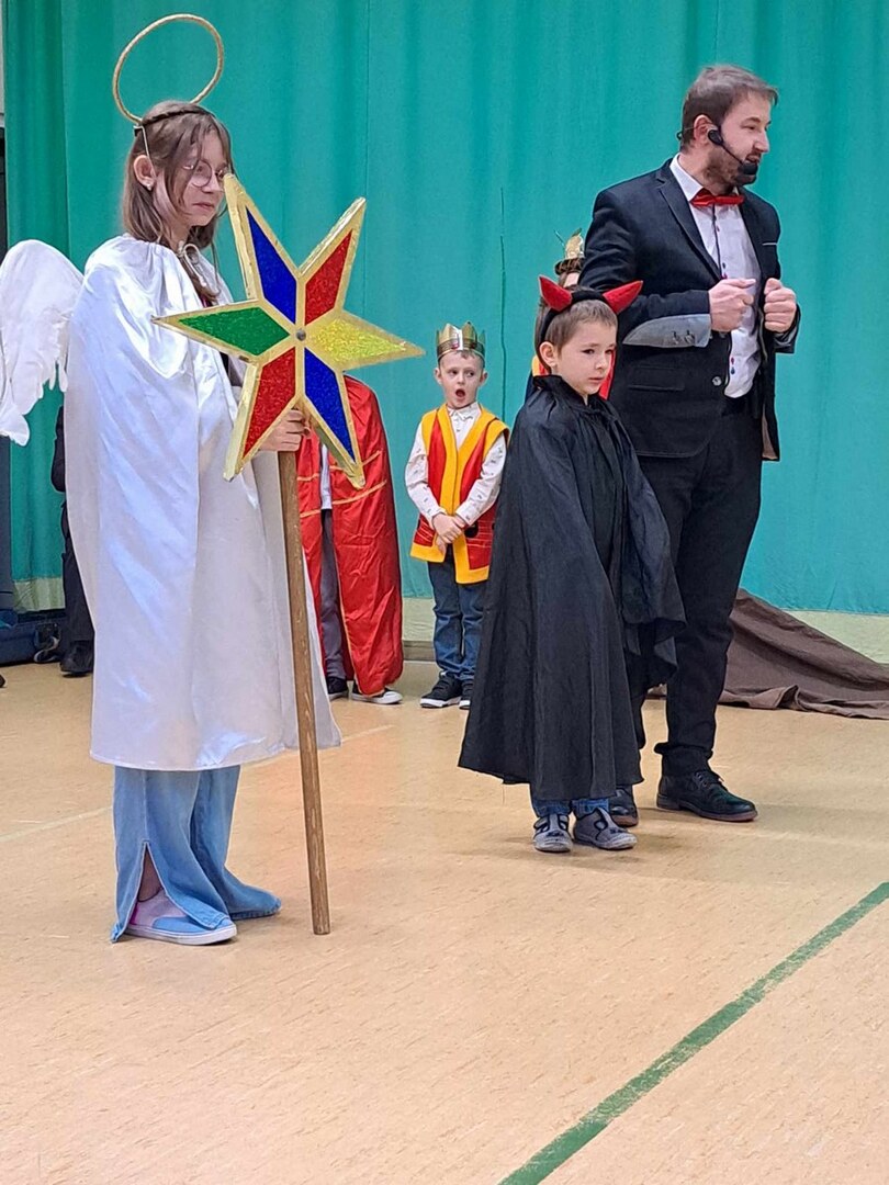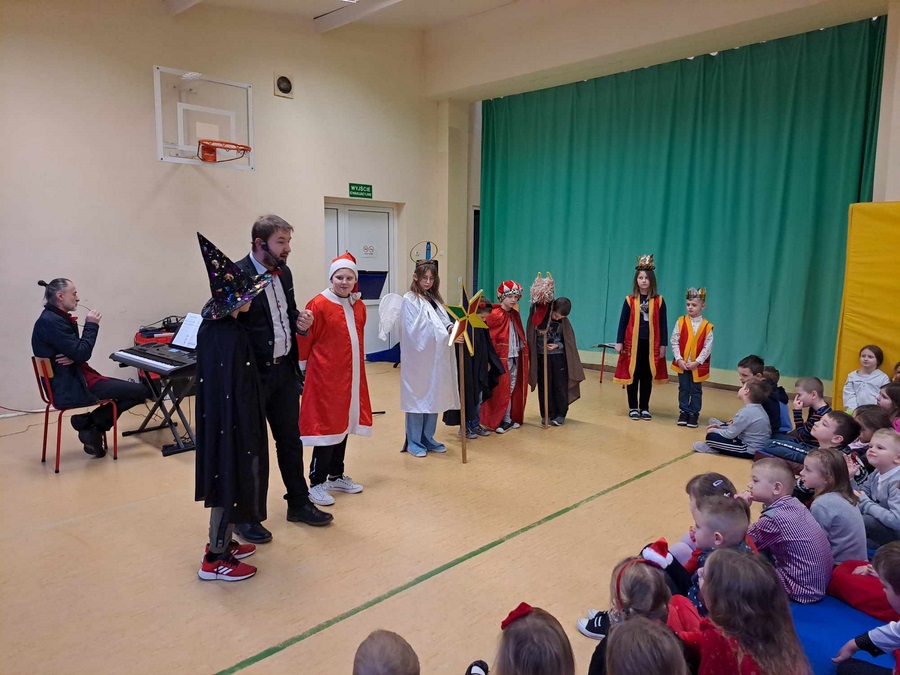 Agencja Artystyczna MAT 20 grudnia 2023 r. zabrała nas w świat bożonarodzeniowych tradycji, wprowadzając nas w świąteczny nastrój. Przypomniała czym są kolędy i pastorałki. Wspólnie śpiewaliśmy pieśni związane z narodzeniem Chrystusa np. międzynarodową kolędę „Cicha noc” oraz jedną z najstarszych polskich kolęd „Przybieżeli do Betlejem pasterze”. Dzieci wcieliły się w postać anioła, króla Heroda, turonia i diabła by zaprezentować nam stary zwyczaj – kolędowania .