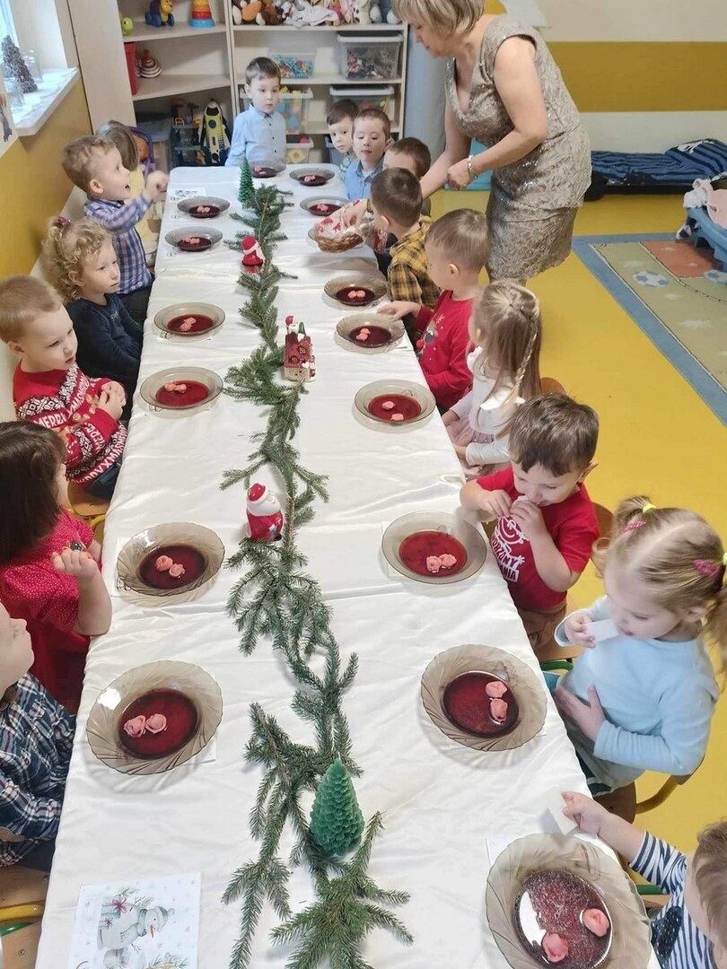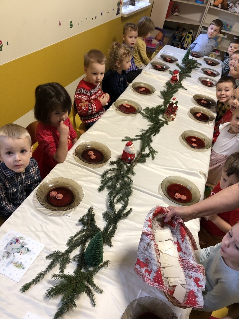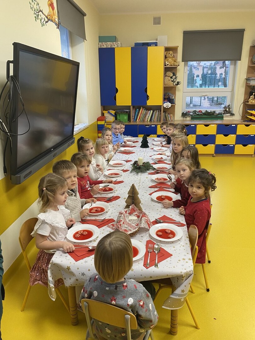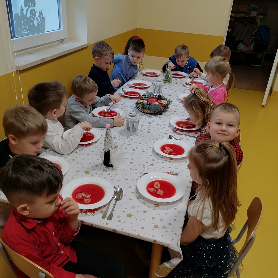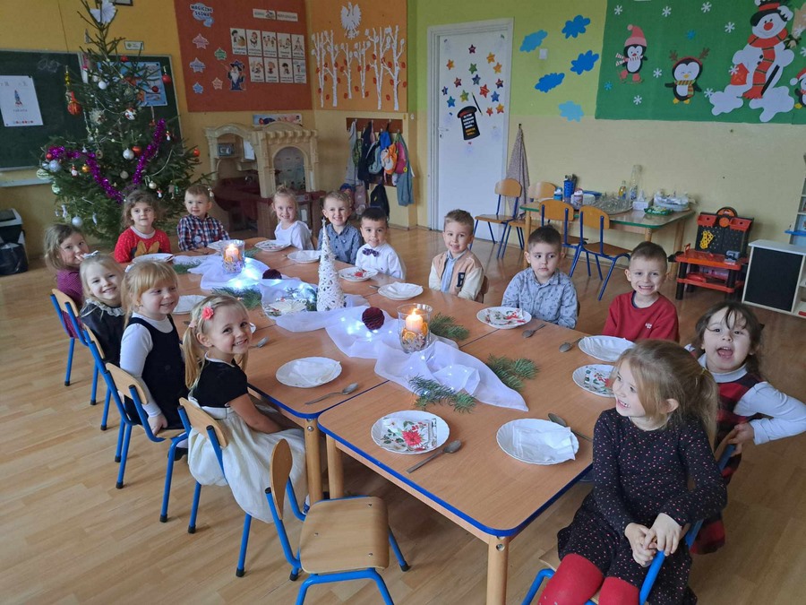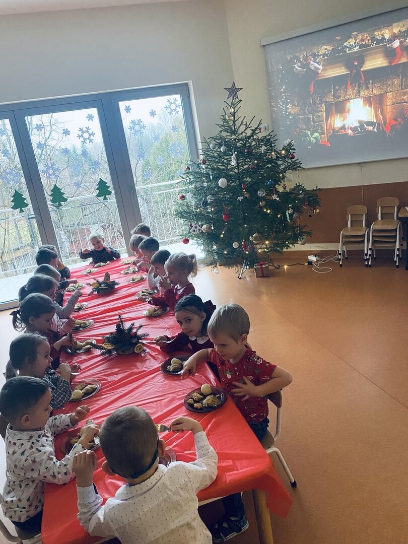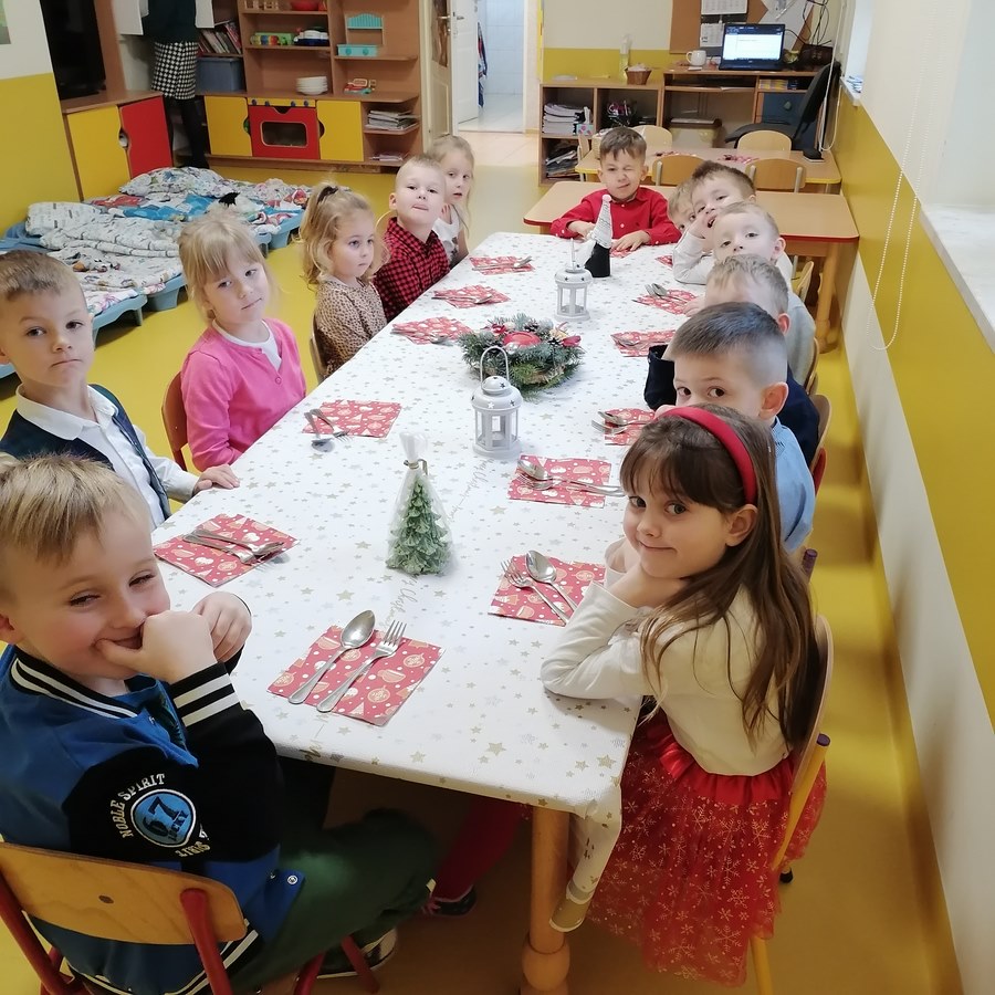 Zgodnie z tradycją Świąt Bożego Narodzenia w Wigilię zasiadamy z rodziną do uroczystej kolacji. Przedszkole to też jedna wielka rodzina, dlatego 18 grudnia zorganizowaliśmy w grupach Obiad Wigilijny. Aby pokreślić odświętny charakter tego dnia, wszyscy byli elegancko ubrani. Wspólnie udekorowaliśmy stoły białymi obrusami, świątecznymi stroikami, świeczkami, bombkami i kolorowymi serwetkami. Zostały także ustawione inaczej niż zwykle. Zsunięte razem pozwalały na odczucie wspólnoty oraz dodały świątecznego charakteru tego posiłku. Tego dnia nie zabrakło pysznych potraw, łamania się opłatkiem, życzeń płynących prosto z serca i oczywiście wspólnego słuchania kolęd. Takie podniosłe chwile nie tylko utrwalają w dzieciach znajomość tradycji i świątecznych zwyczajów, lecz przede wszystkim wzmacniają w nich bliskie i serdeczne relacje międzyludzkie. To był piękny czas .