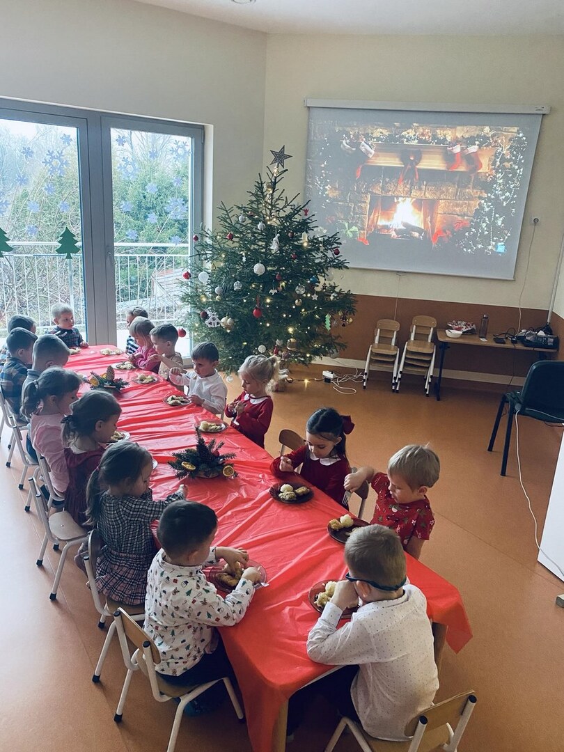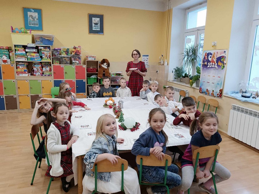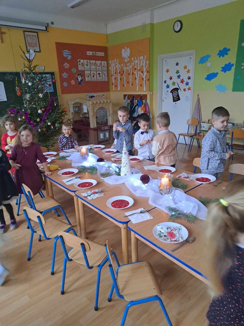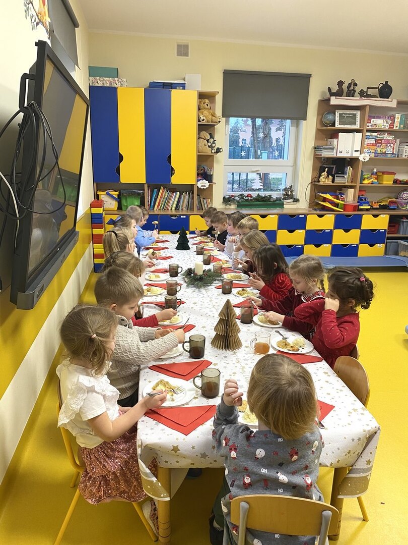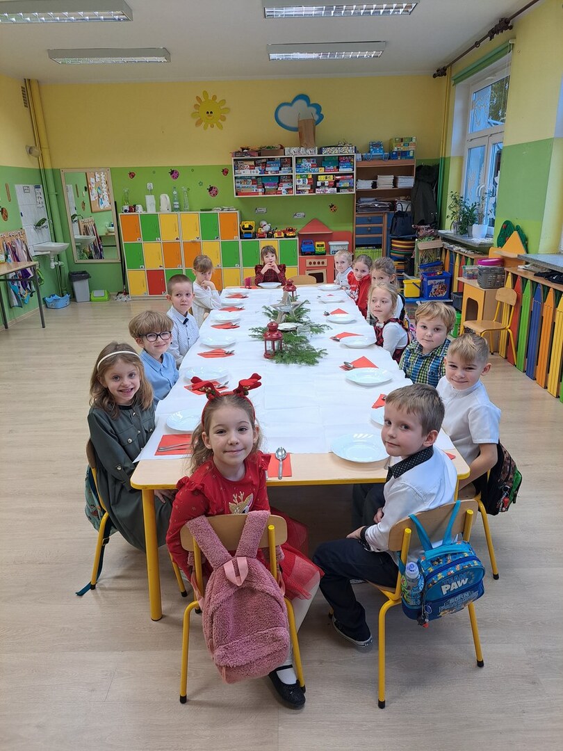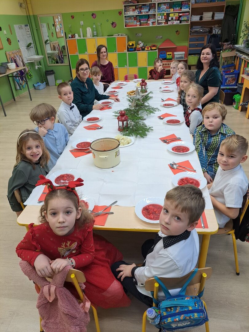 Zgodnie z tradycją Świąt Bożego Narodzenia w Wigilię zasiadamy z rodziną do uroczystej kolacji. Przedszkole to też jedna wielka rodzina, dlatego 18 grudnia zorganizowaliśmy w grupach Obiad Wigilijny. Aby pokreślić odświętny charakter tego dnia, wszyscy byli elegancko ubrani. Wspólnie udekorowaliśmy stoły białymi obrusami, świątecznymi stroikami, świeczkami, bombkami i kolorowymi serwetkami. Zostały także ustawione inaczej niż zwykle. Zsunięte razem pozwalały na odczucie wspólnoty oraz dodały świątecznego charakteru tego posiłku. Tego dnia nie zabrakło pysznych potraw, łamania się opłatkiem, życzeń płynących prosto z serca i oczywiście wspólnego słuchania kolęd. Takie podniosłe chwile nie tylko utrwalają w dzieciach znajomość tradycji i świątecznych zwyczajów, lecz przede wszystkim wzmacniają w nich bliskie i serdeczne relacje międzyludzkie. To był piękny czas .