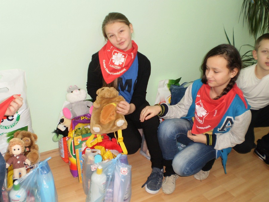 Dzieci ze Szkolnego Koła Caritas i nie tylko, w jesienne miesiące zbierały w lesie szyszki, z których później powstały małe choinki. Wykonanie ich zajmowało nam sporo czasu i wymagało dużej precyzji, ale efekt był imponujący. Nasze choinki, aniołki i kartki świąteczne sprzedawaliśmy w naszej szkole, a pieniędze zasiliły fundusz naszego Caitasu. Mozolnie zbierane fundusze przekazaliśmy na paczki świąteczne dla pięciu rodzin potrzebujących. Kilka rodzin odwiedziliśmy osobiście.