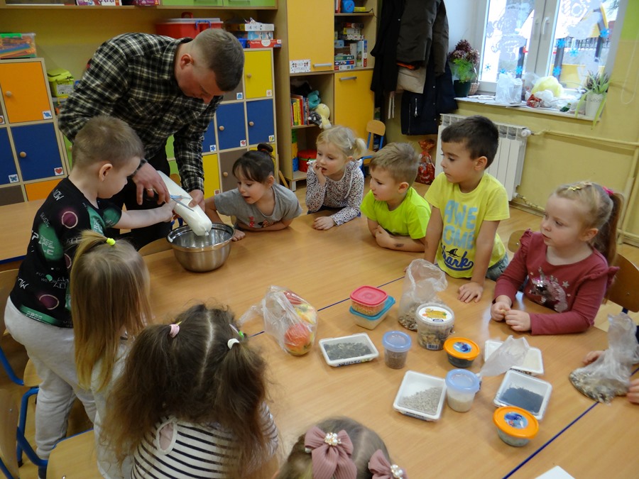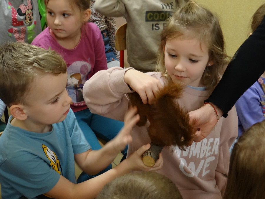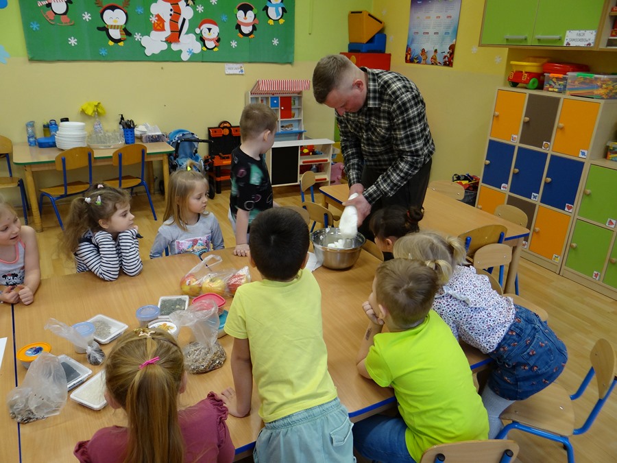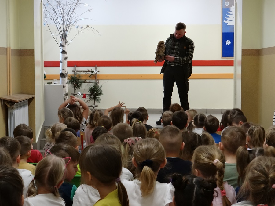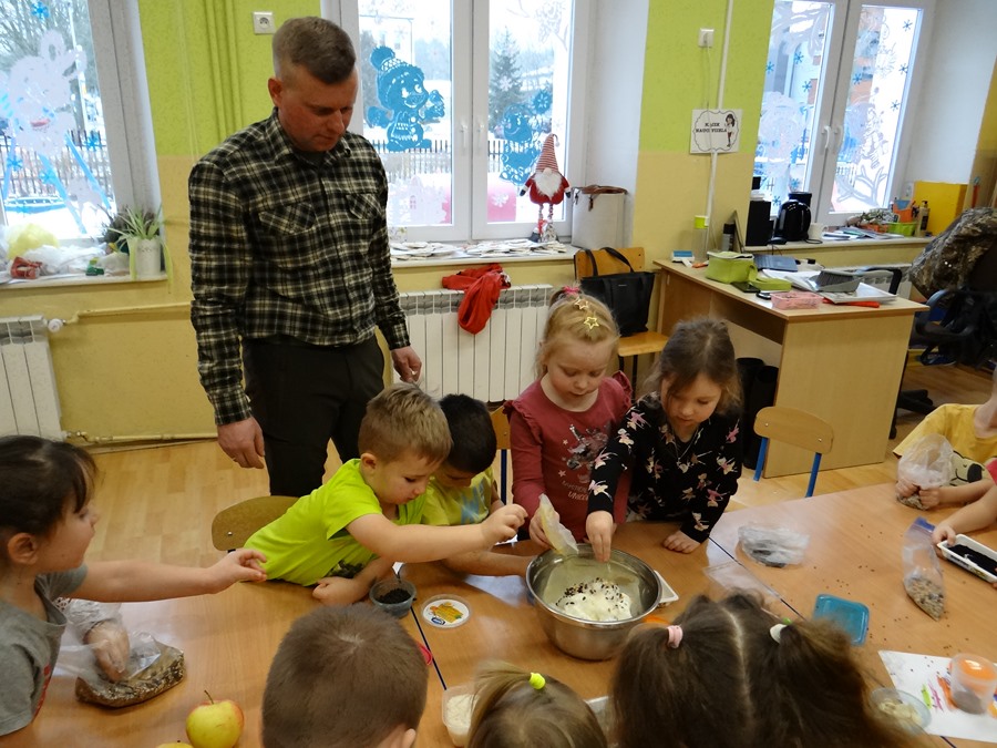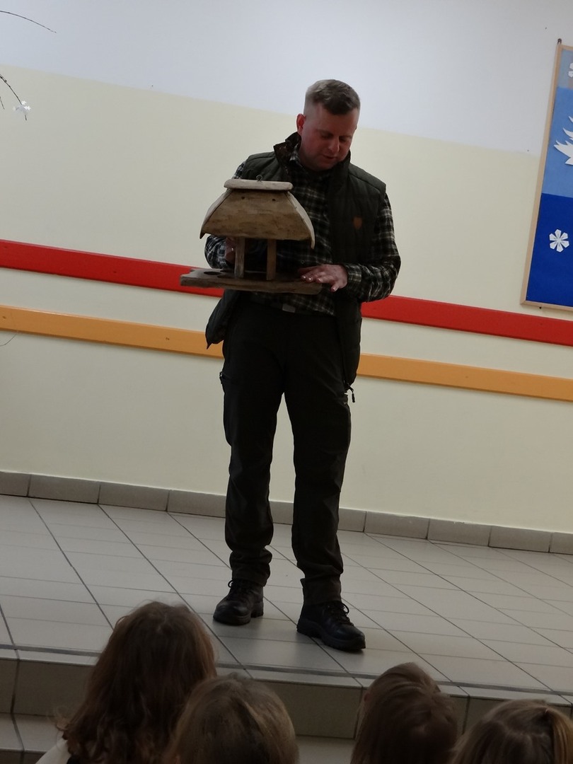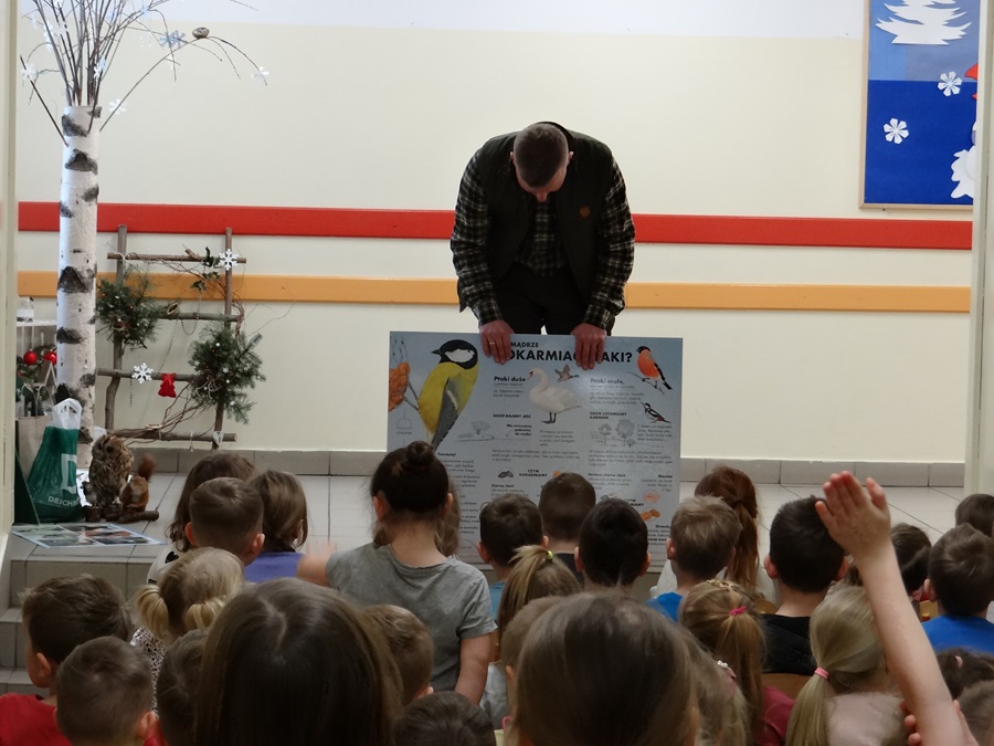 Dzieci dowiedziały się że: ptaki dokarmiamy tylko wtedy, gdy zima jest śnieżna i mroźna, karmniki należy umieszczać w miejscach zacisznych i niedostępnych dla takich drapieżników jak koty, naturalnym pokarmem dla ptaków są owoce i ziarna zbóż, w karmniku należy utrzymywać czystość. Ptaki przyzwyczajają się do stałej dostawy pokarmu, więc jeśli już zaczynamy je dokarmiać, powinniśmy to robić regularnie przez całą zimę! Zaznaczył, że nieodpowiednim pokarmem dla ptaków jest chleb – gdyż zawiera dużą ilość soli, która jest niebezpieczna dla naszych latających przyjaciół. W przeciwieństwie do ptaków, dieta leśnych zwierząt powinna być wzbogacona o sól, dlatego w lasach często można zauważyć tzw. „lizawki”.
