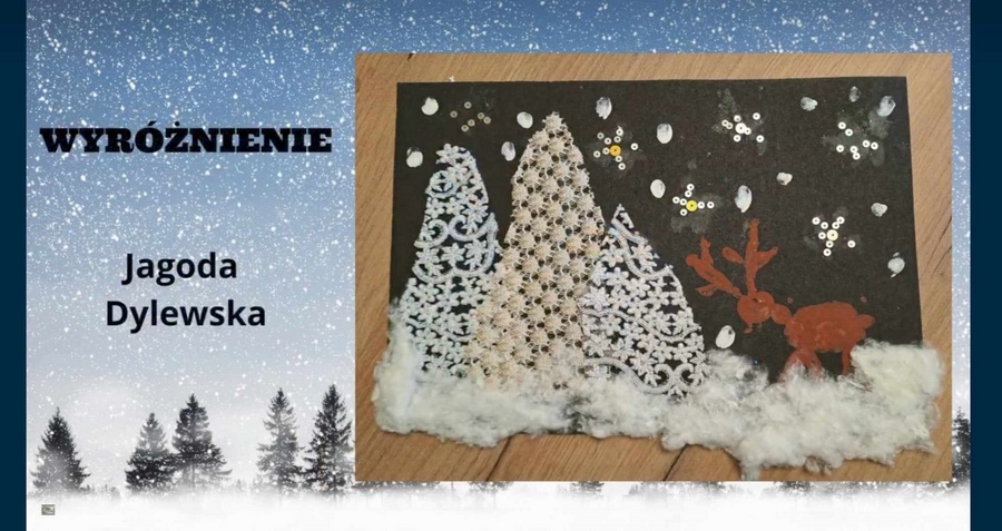 Serdeczne gratulacje dla Jagody Dylewskiej z grupy Kangurki. Jagódka otrzymała wyróżnienie w ogólnopolskim konkursie pt. „Zaczarowany las zimową porą”, organizowanym przez Przedszkole z Oddziałami Integracyjnymi nr 17 im. Jana Brzechwy w Rybniku. Życzymy dalszych sukcesów.