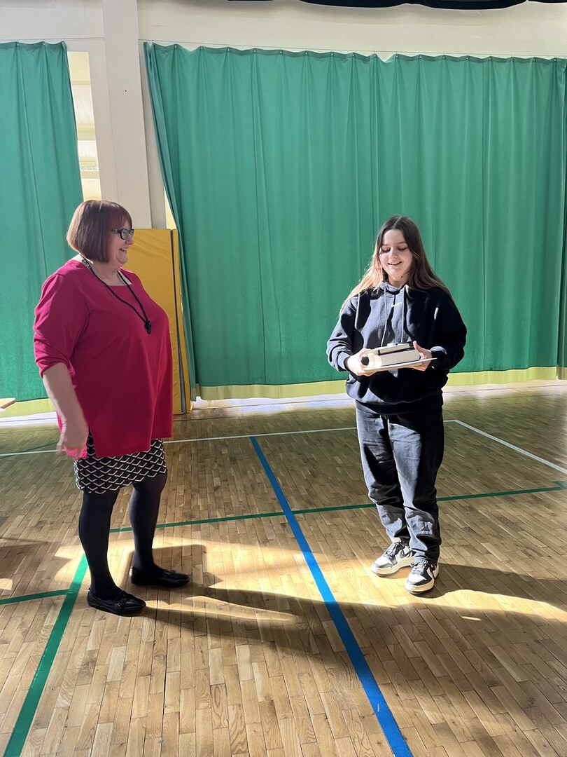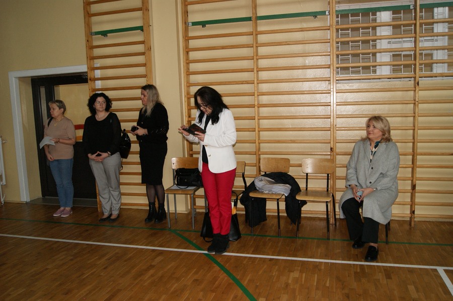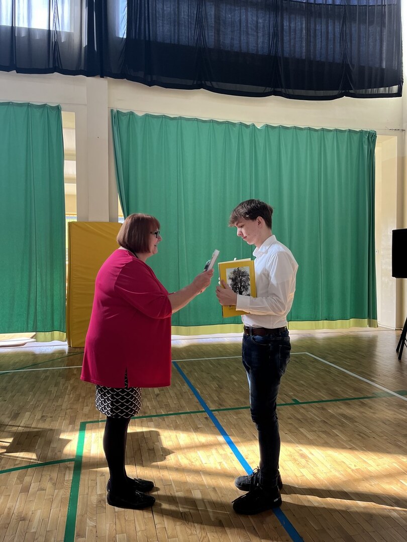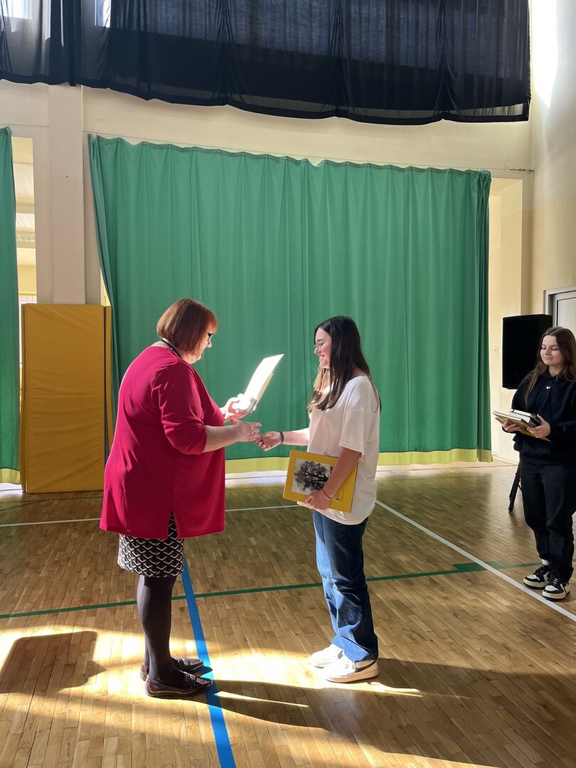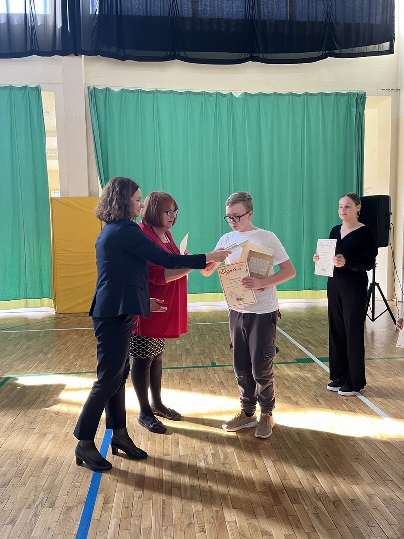 Laureaci otrzymali z rąk dyrektor szkoły Urszuli Kmoch dyplomy oraz piękne nagrody (książki, notesy, zestawy długopisów).