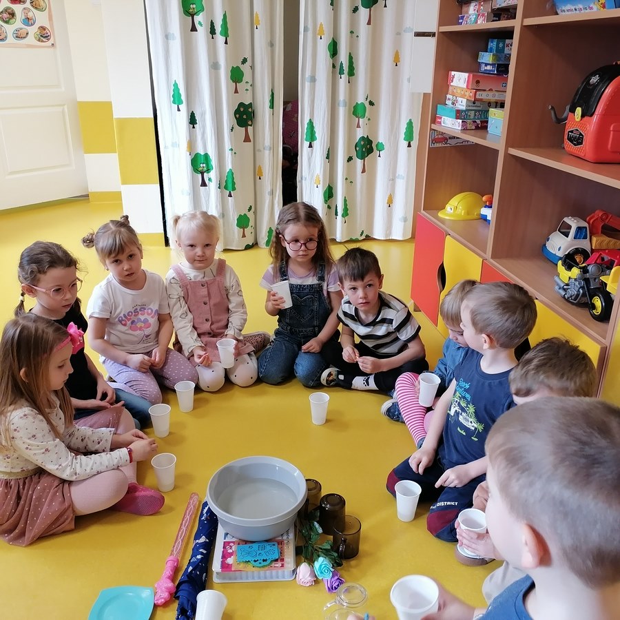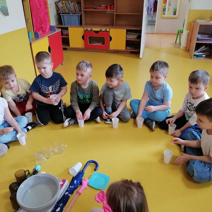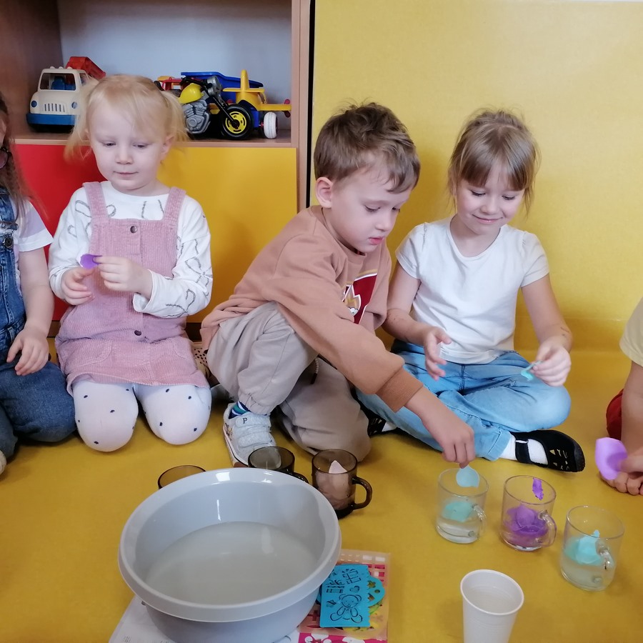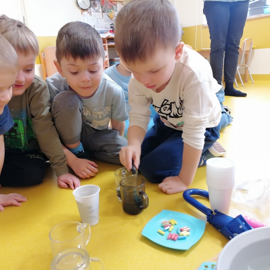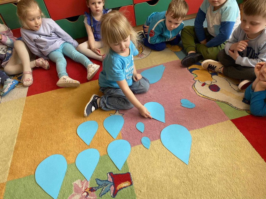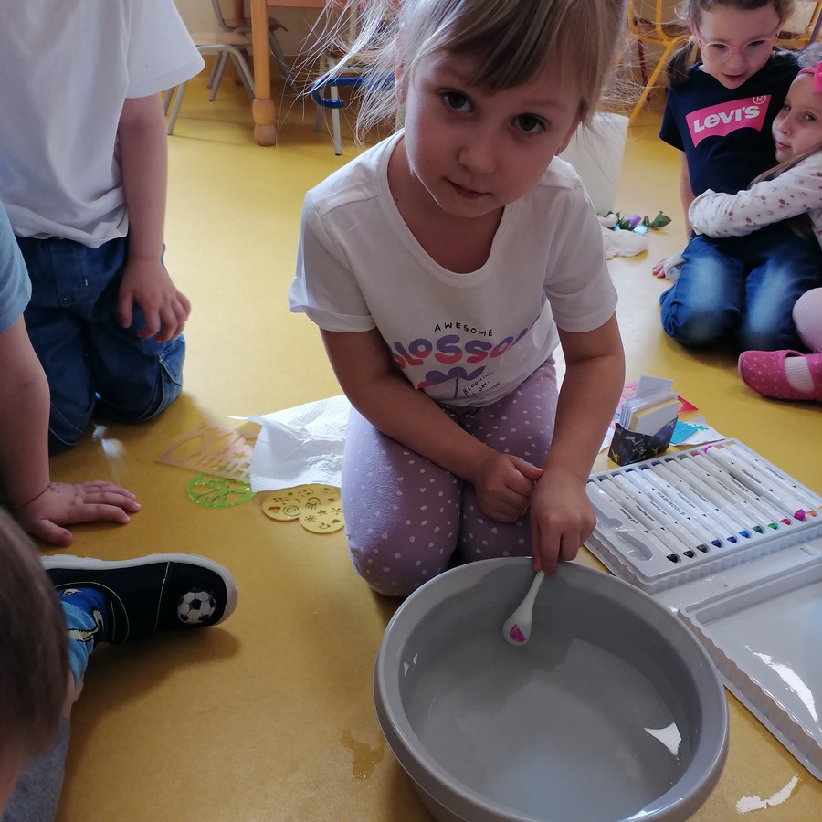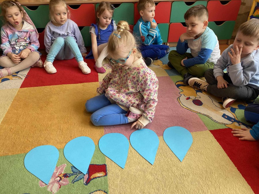 W czasie zabaw badawczych bliżej przyjrzały się wodzie. Badały i poznawały jej różne właściwości: smak, zapach i kolor. Rozwiązywały zagadki, rozpoznawały odgłosy deszczu, strumyka, burzy, morza…, zamieniały się w krople wody. Jak na przedszkolaków przystało, nie zabrakło również prac plastycznych.