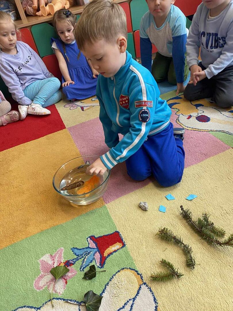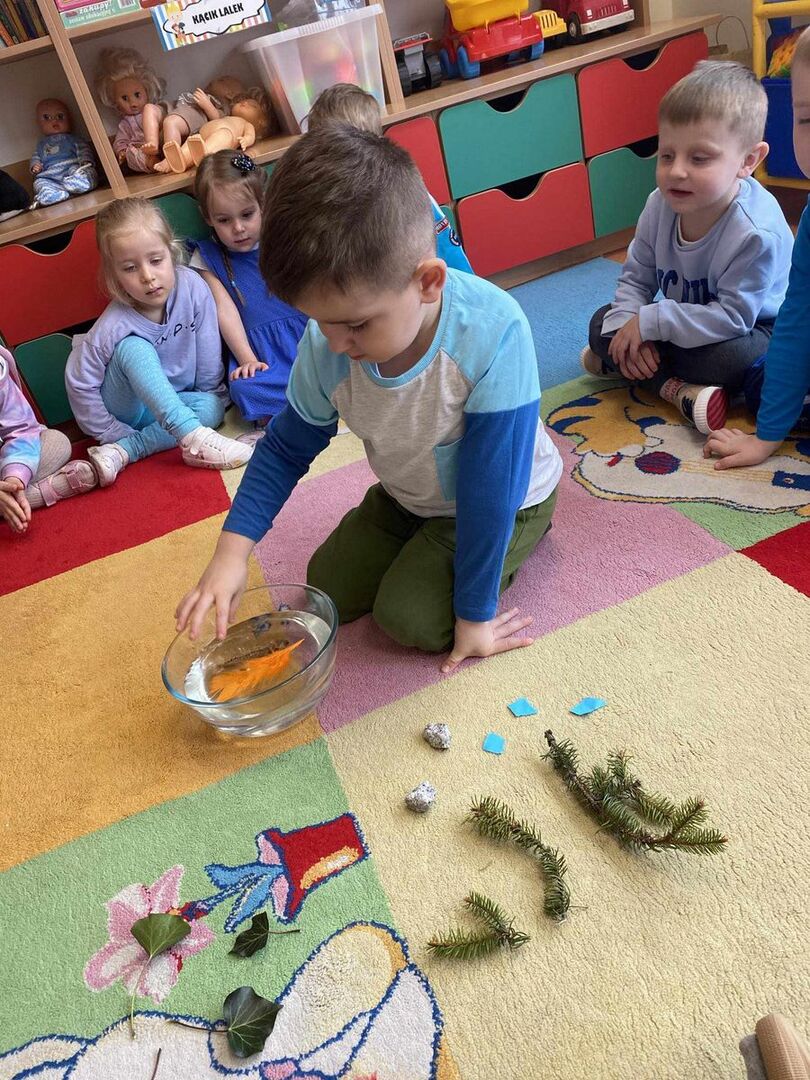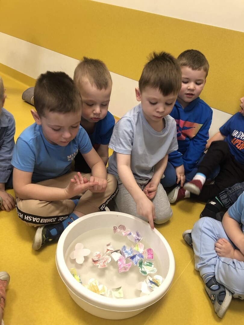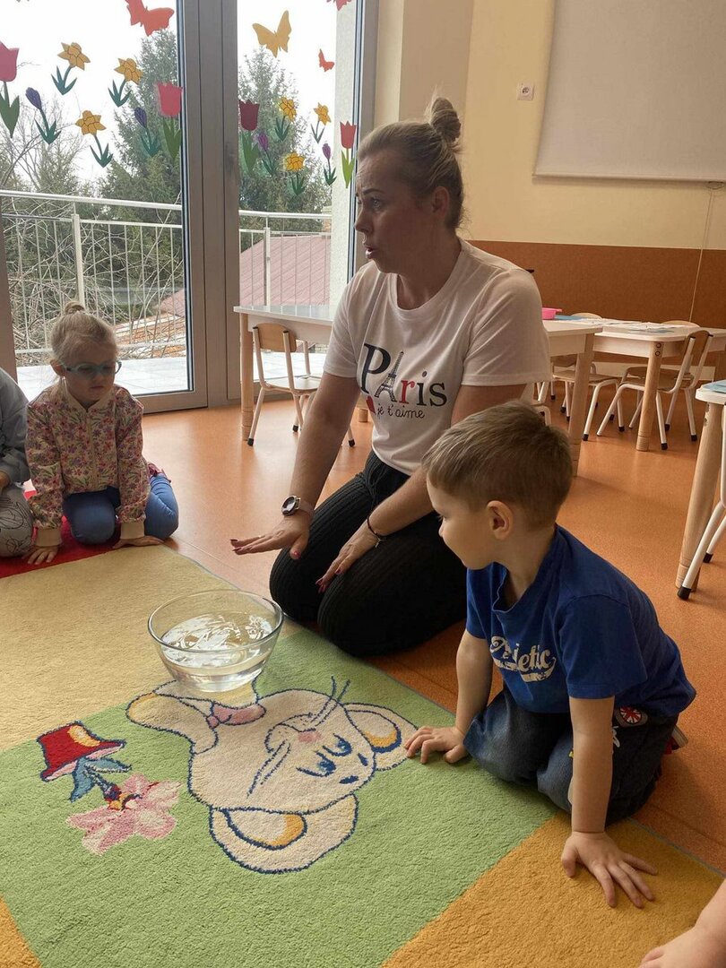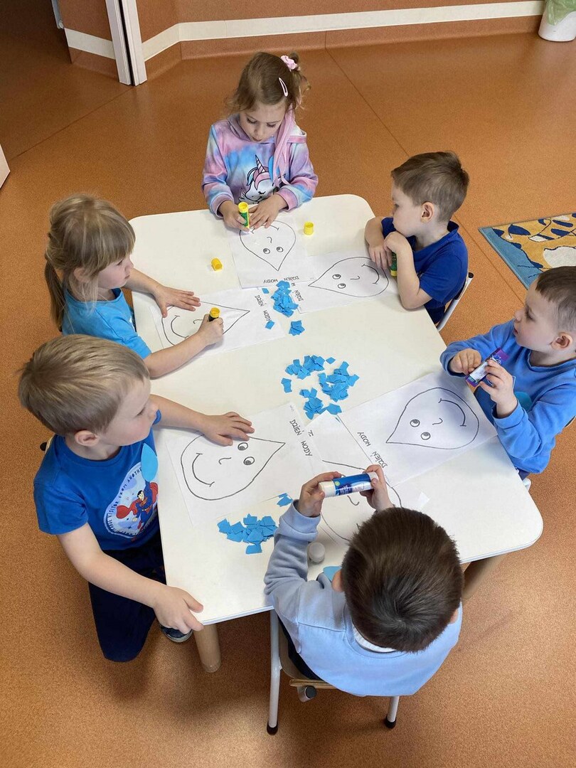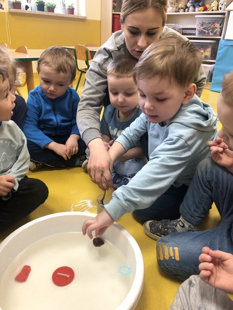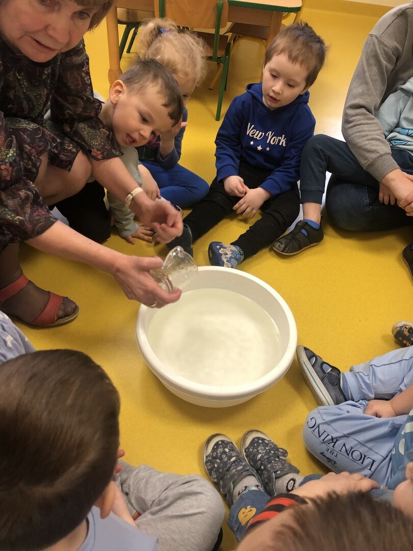 W czasie zabaw badawczych bliżej przyjrzały się wodzie. Badały i poznawały jej różne właściwości: smak, zapach i kolor. Rozwiązywały zagadki, rozpoznawały odgłosy deszczu, strumyka, burzy, morza…, zamieniały się w krople wody. Jak na przedszkolaków przystało, nie zabrakło również prac plastycznych.