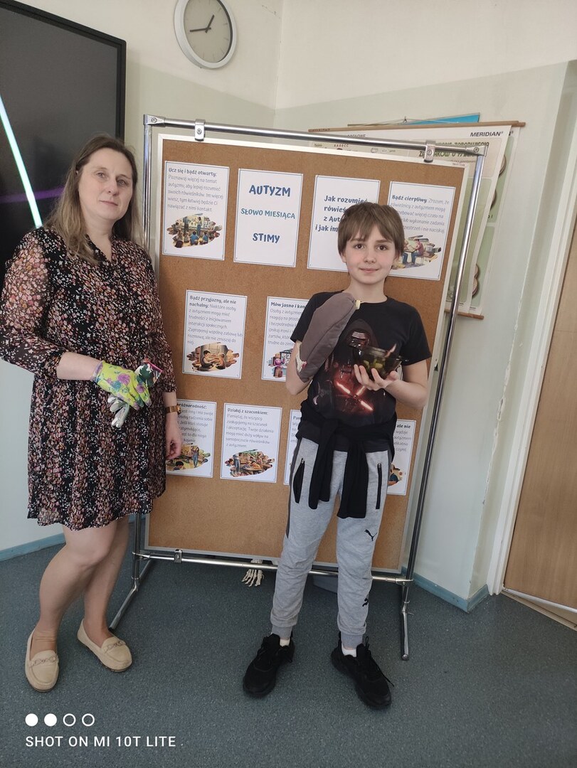 Kwiecień jest miesiącem świadomości autyzmu. W naszej szkole 11 kwietnia uczniowie klasy Va wzięli udział w warsztatach pt. „Spektrum autyzmu, spektrum możliwości”. Wydarzenie to zostało zorganizowane przez Samorząd Uczniowski. Warsztaty poprowadziły p. Anna Dąbkowska i p. M. Skiba. Uczniowie poszerzyli swoją wiedzę na temat funkcjonowania osób w spektrum autyzmu, poznali ich zachowania, trudności, ograniczenia oraz szczególne uzdolnienia. Mogli też dostrzec, jak taka osoba postrzega rzeczywistość i jak jej zmysły odbierają bodźce z otoczenia. Doświadczyli pracy zmysłów osoby ze spektrum autyzmu, biorąc udział w ćwiczeniach. Z zamkniętymi oczami, mając grube rękawice kuchenne na dłoni, musieli: pozbierać wykałaczki, wykonać rysunek bądź napis oraz poczuć przedmiot, jaki trzymają w dłoni. Zadaniem uczniów było także przetłumaczenie tekstu z języka obcego na język polski oraz odgadnięcie smaku i rodzaju spożywanego produktu. Uczniowie uczestniczyli w zajęciach z zaciekawieniem i zaangażowaniem. Zapewne odtąd z większym zrozumieniem i empatią będą podchodzić do osób w spektrum autyzmu.