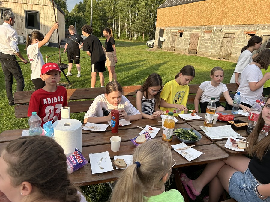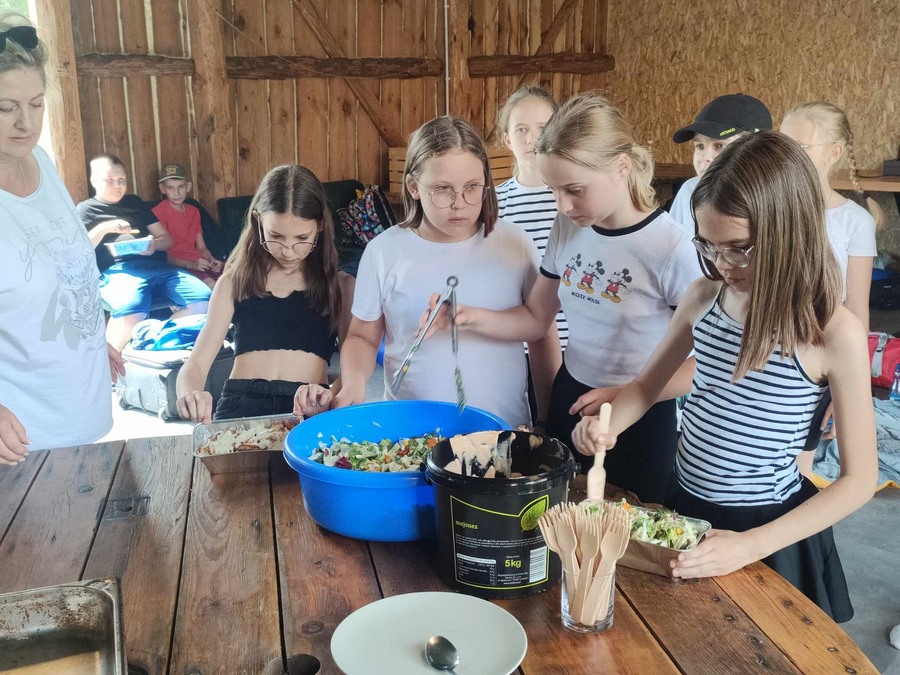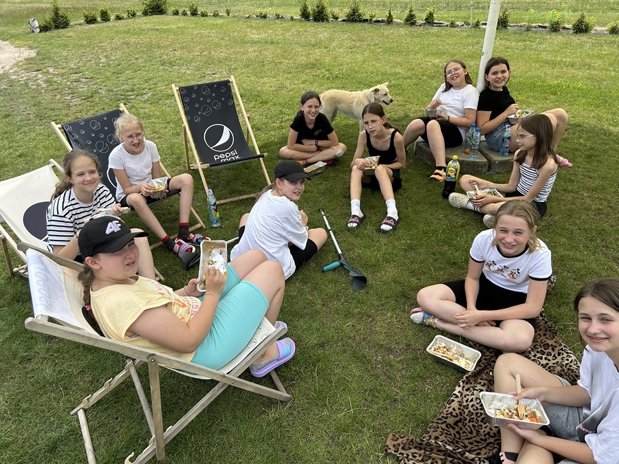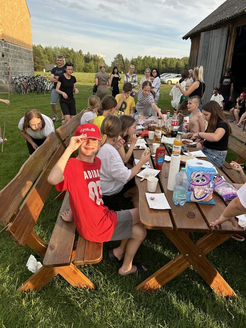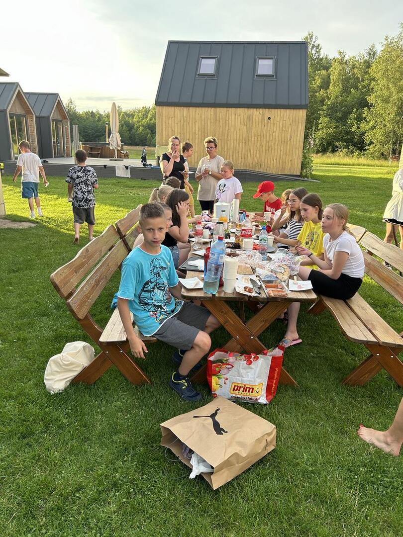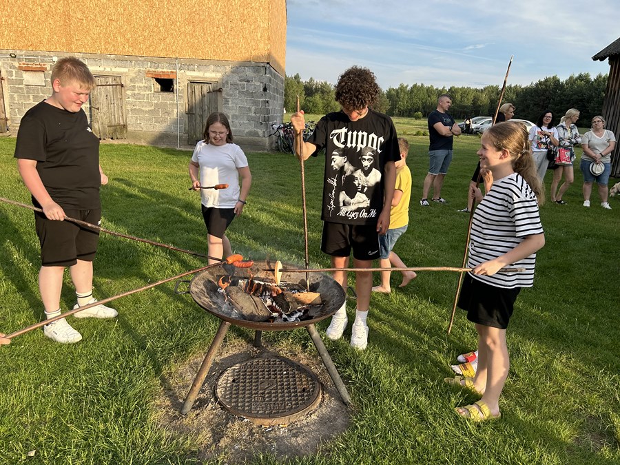 W dniach 18.06 - 19.06.2024 r. uczniowie klas piątych pod opieką p. Svitlany Hrechko, p. Anny Dąbkowskiej i p. Radosława Heronimka udali się na biwak do Fazendy Folwark. Pogoda dopisała, było pięknie i słonecznie. Zbieraliśmy szyszki w lesie, braliśmy udział w warsztatach kulinarnych. Przygotowaliśmy przepyszne kapsalony wraz z kucharzem. Smażyliśmy kiełbaski na ognisku oraz braliśmy udział w grach i zabawach integracyjnych. Dołączyli do nas także nasi rodzice. Największą atrakcją była kąpiel w baliach z podgrzewaną wodą oraz nocowanie w stodole w śpiworach. Wspaniale spędziliśmy czas a następnego dnia zmęczeni, ale zadowoleni wróciliśmy do domu.